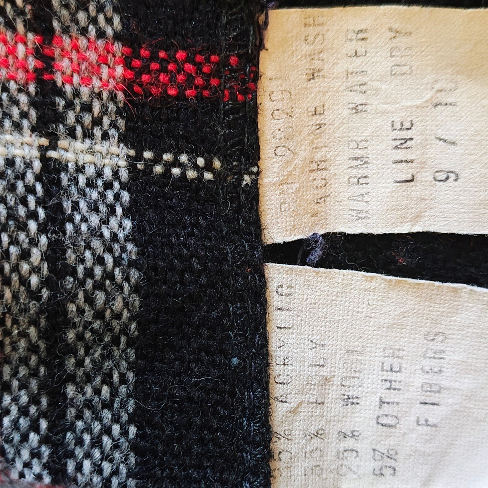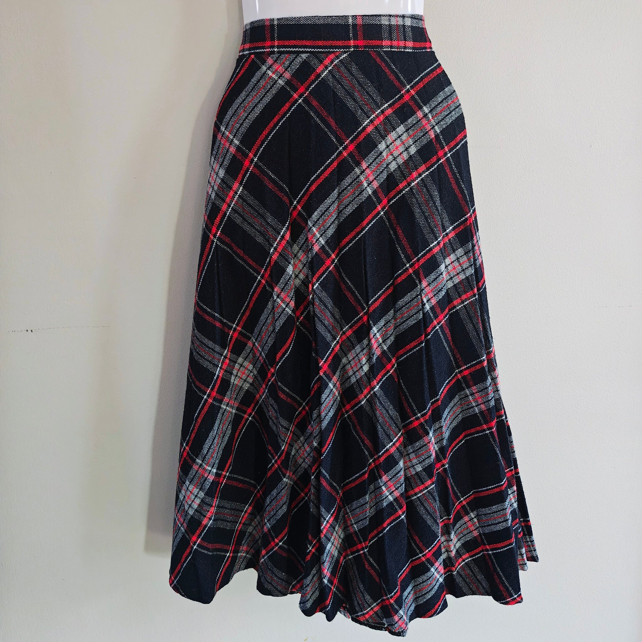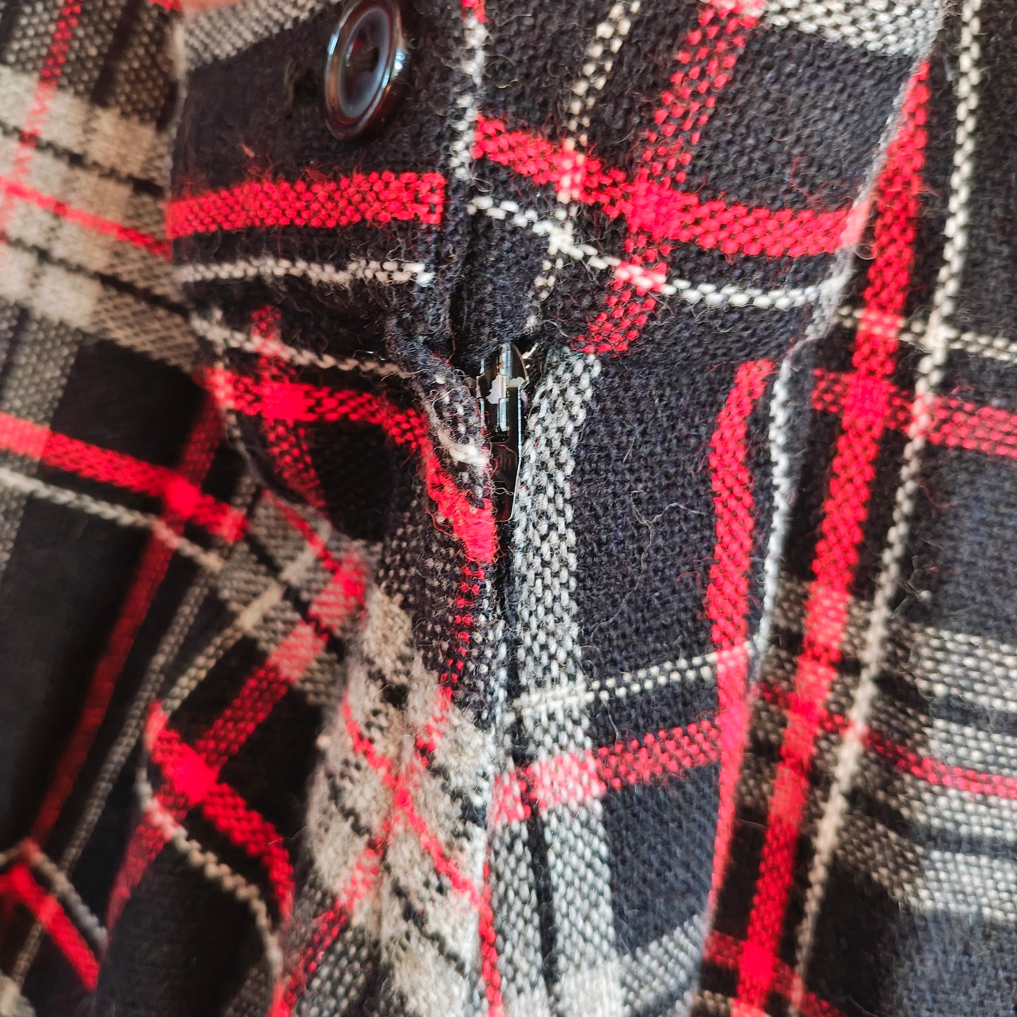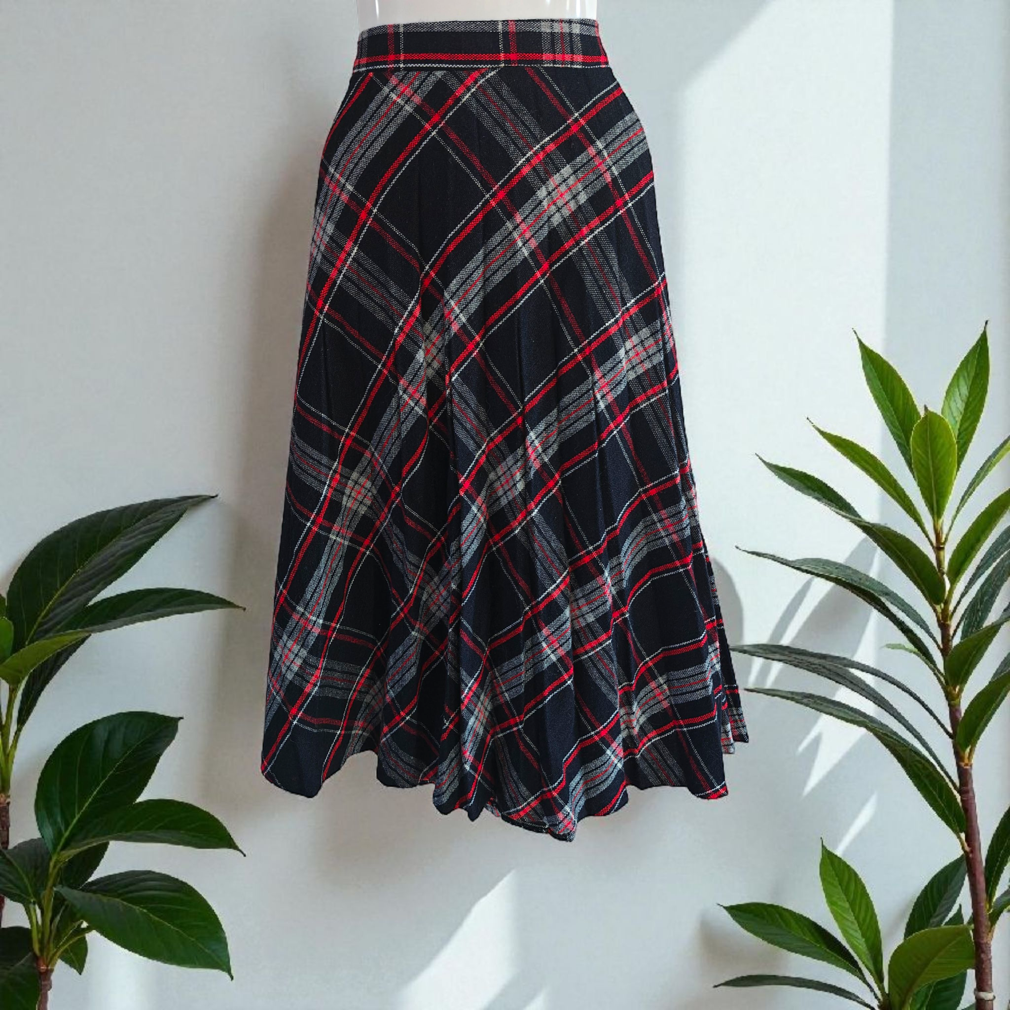 Pattern: Tartan or plaid check pattern in red, black, and white colors.
