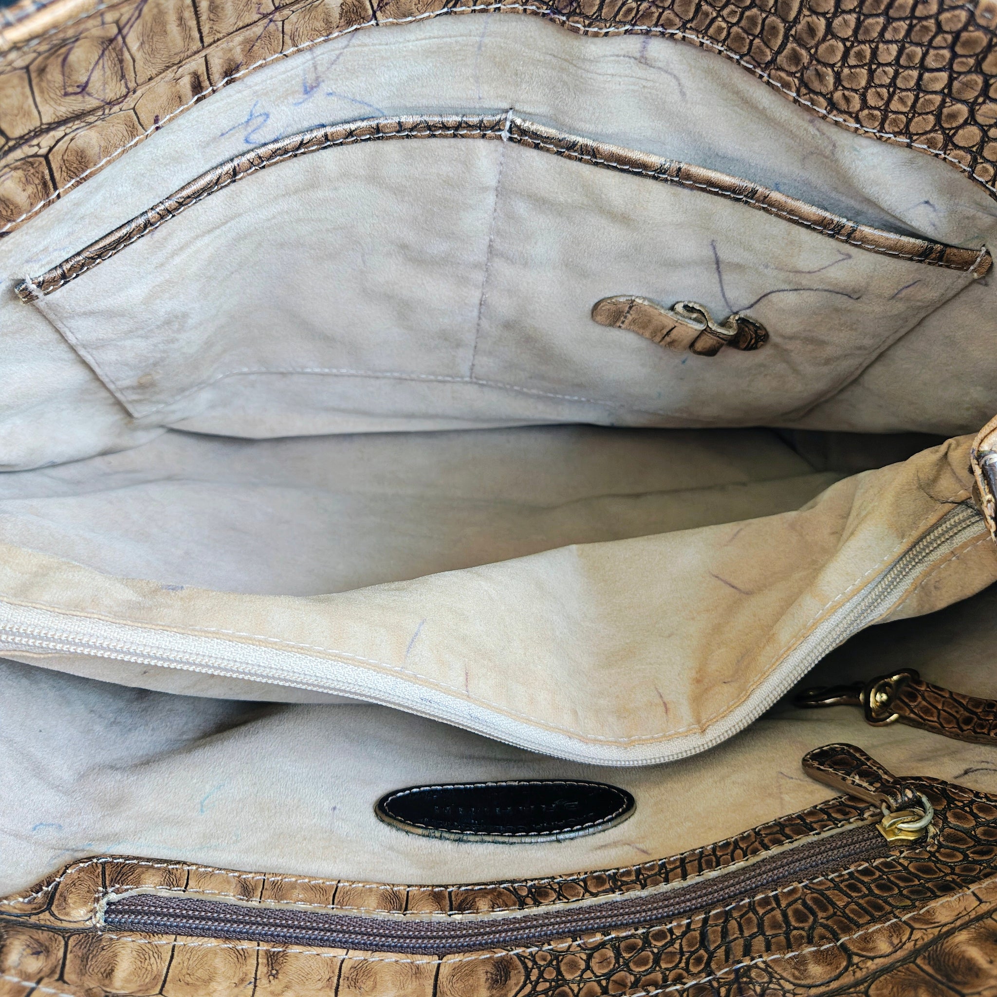 This bag is used. It does have imperfections so please review photos carefully. Rubbing on one corner And ink mark on back that may come off. Interior has quite a few ink marks but is otherwise in good condition.