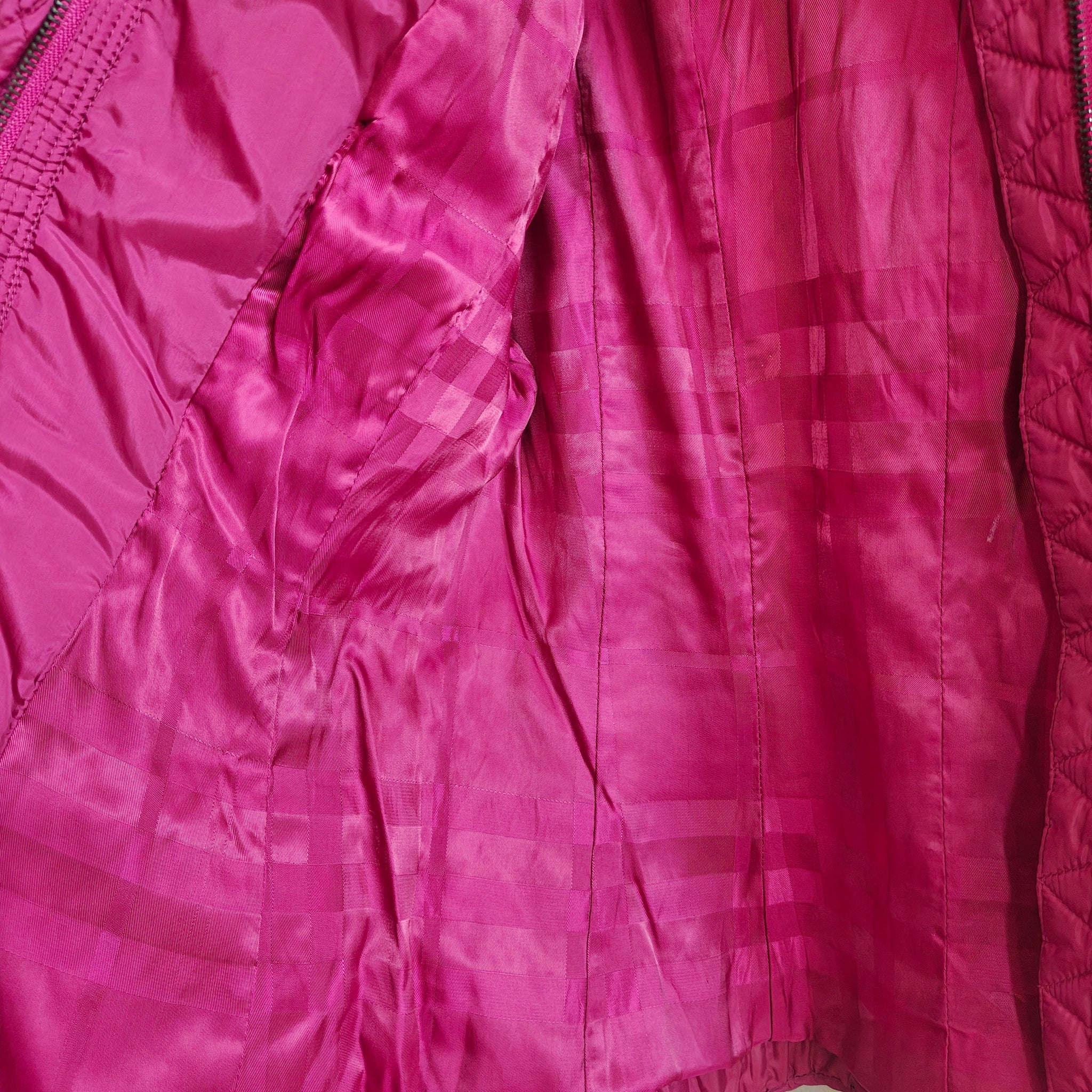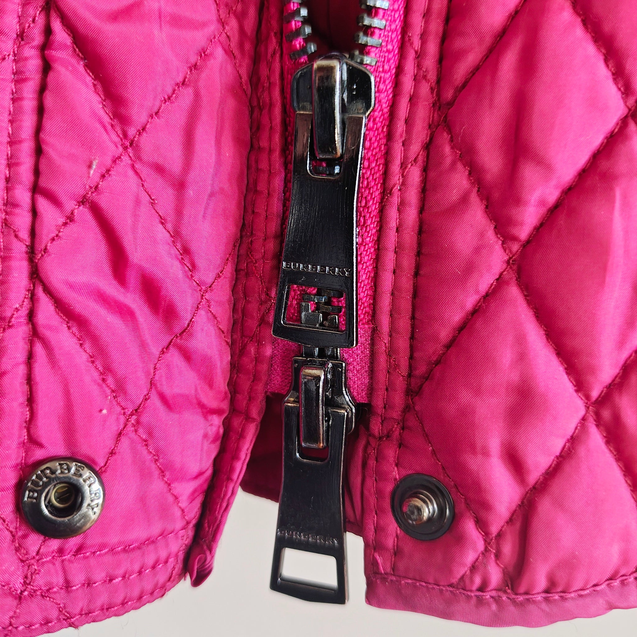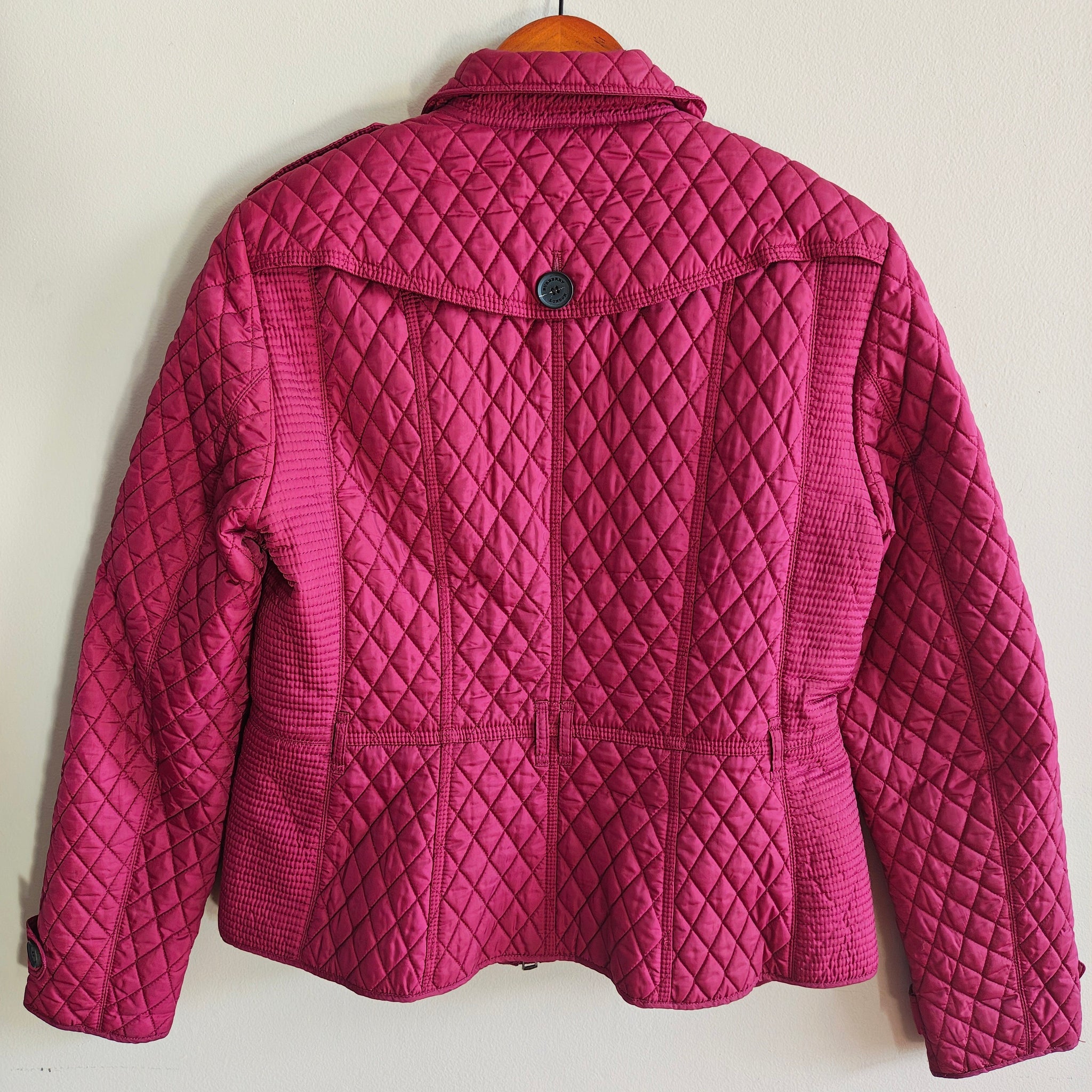Burberry Quilted Zip Jacket in magenta or fuchsia. Diamond quilted pattern with military-inspired buttons and epaulettes on the shoulders.