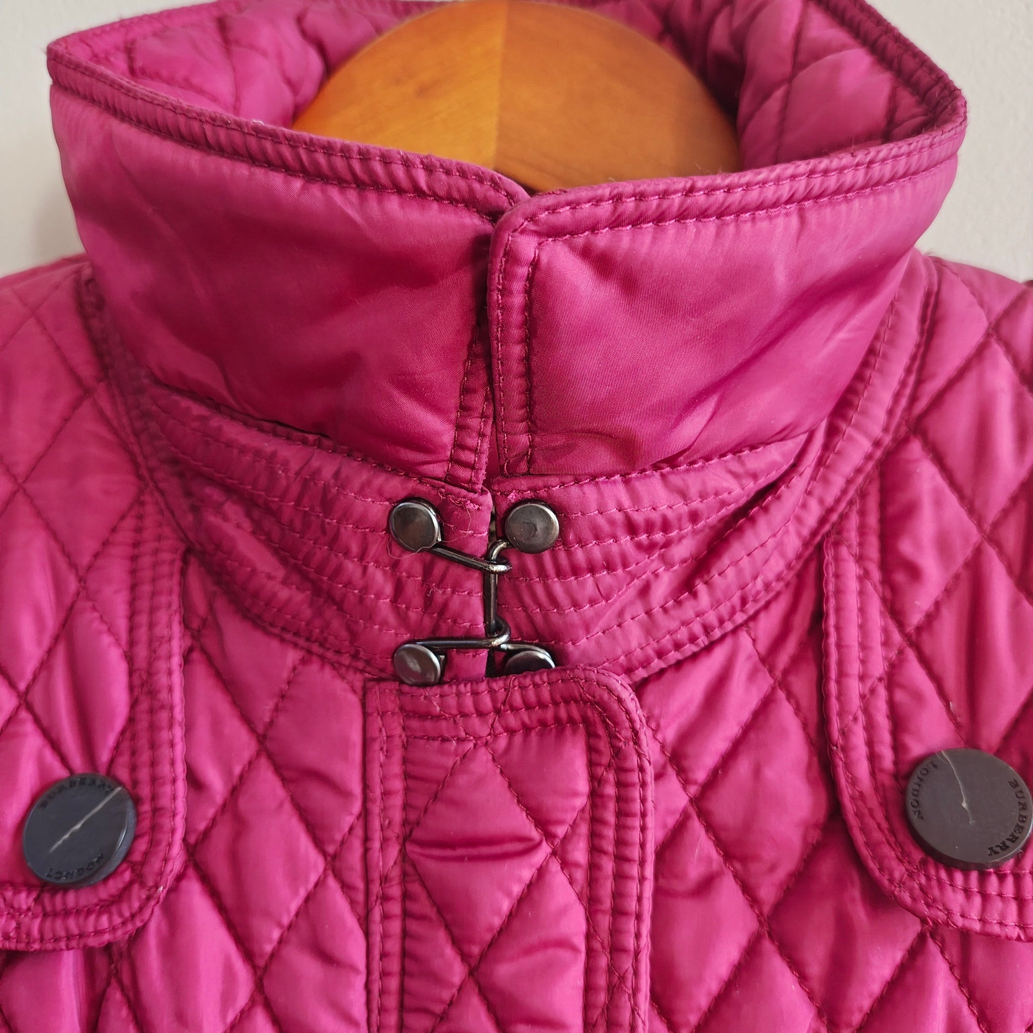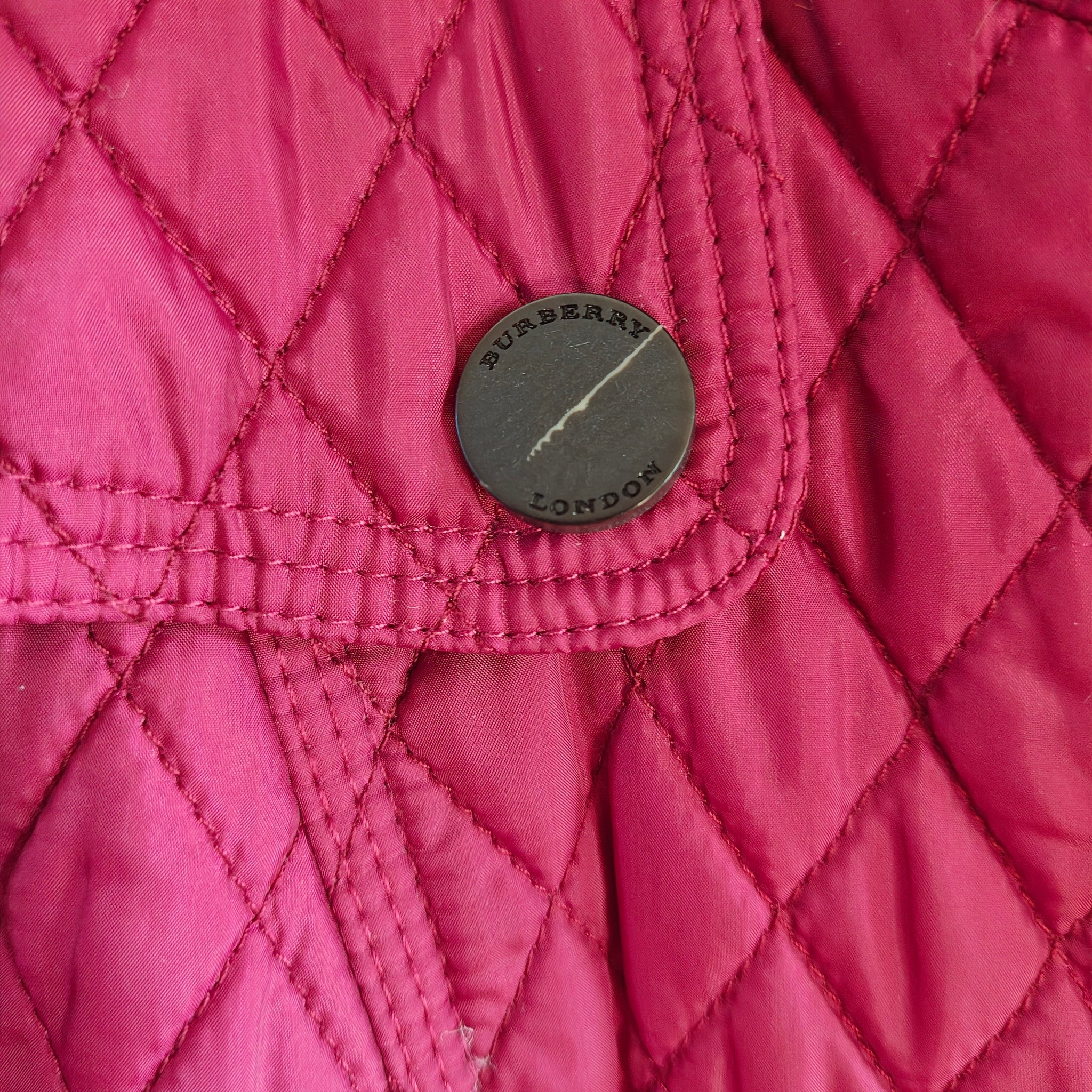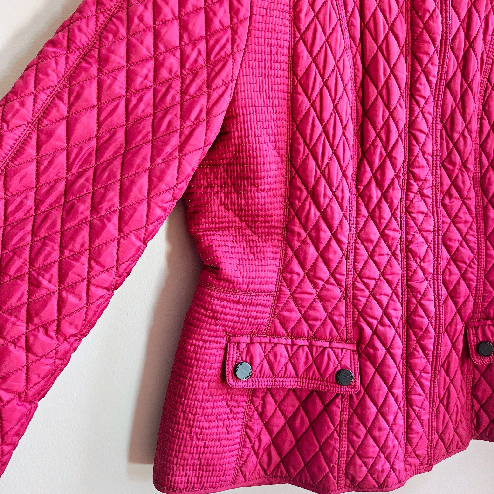 Burberry Quilted Zip Jacket in magenta or fuchsia. Diamond quilted pattern with military-inspired buttons and epaulettes on the shoulders.