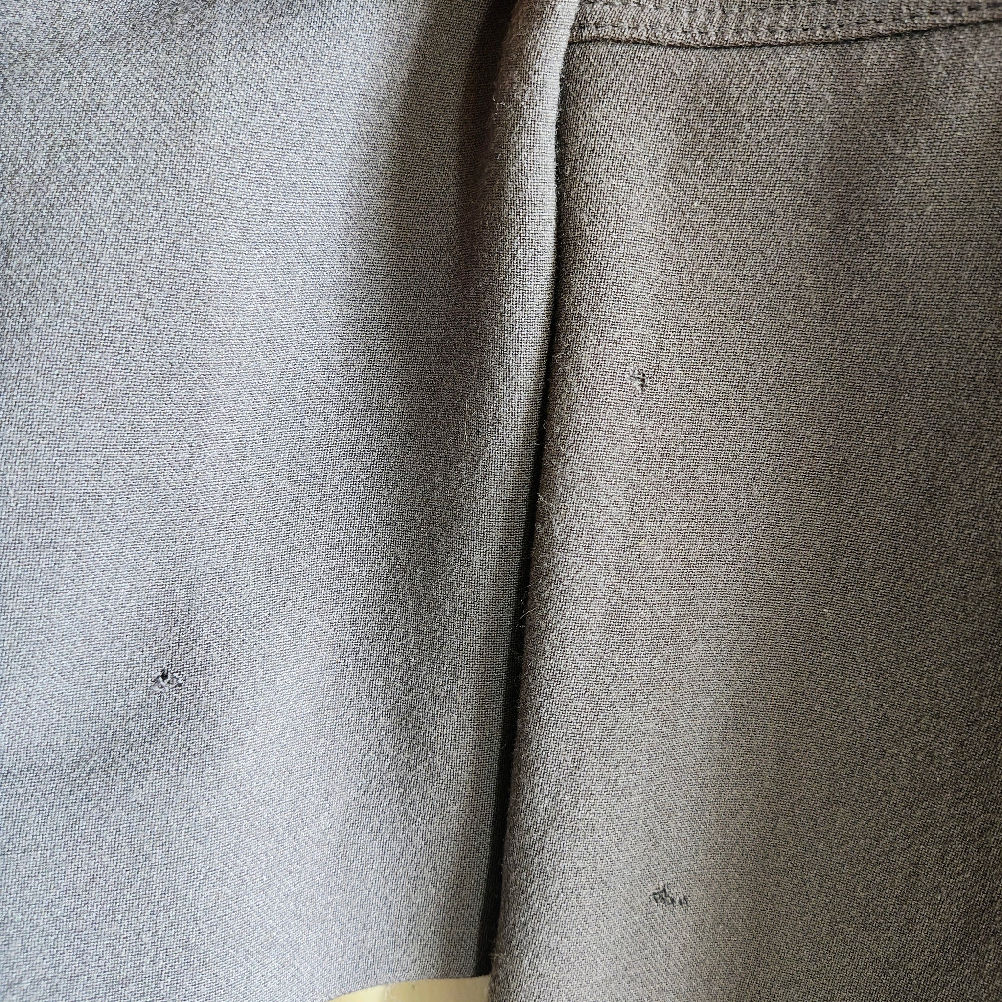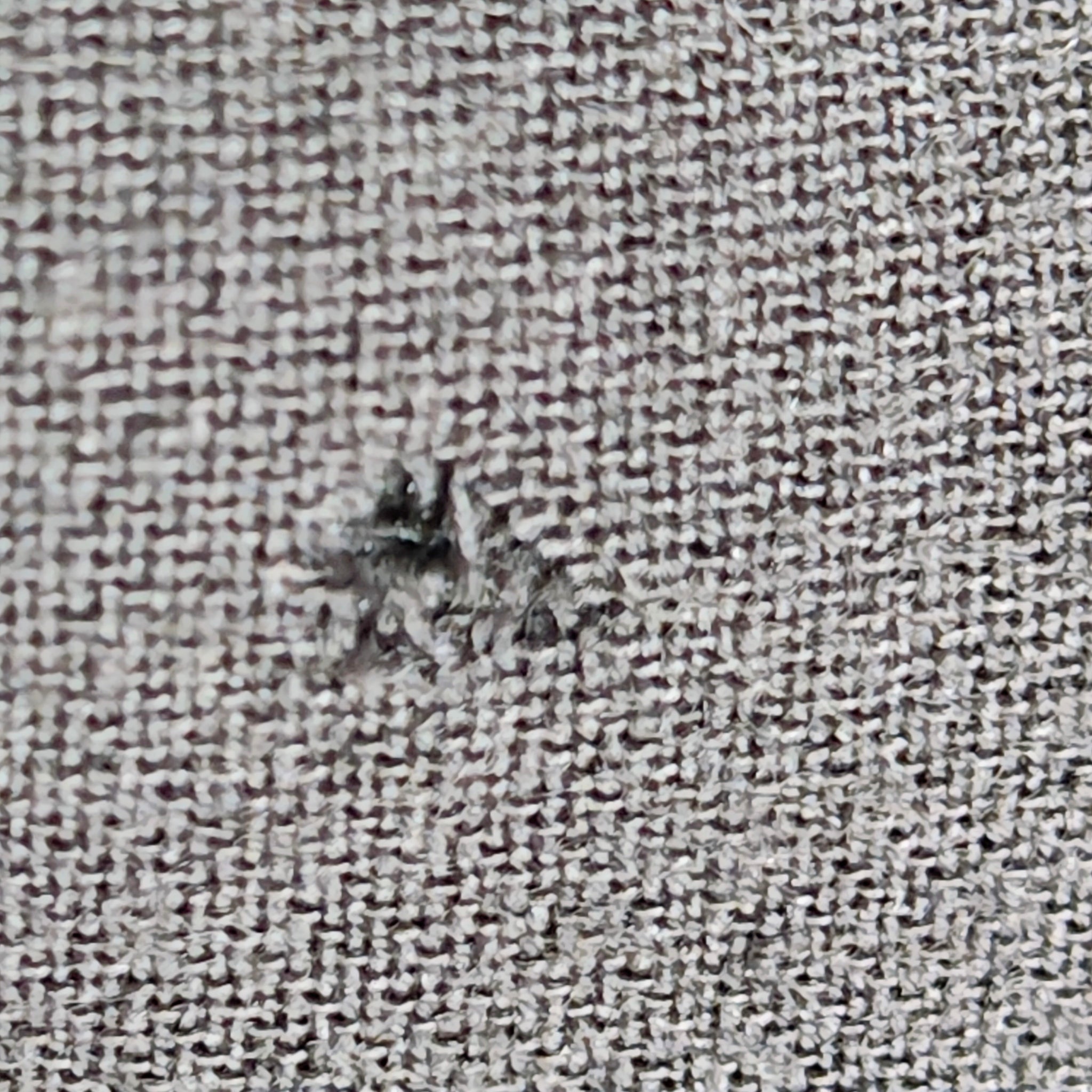 This is pre-owned. Interior is in excellent condition with no flaws noted. Exterior does have a few very small holes which are shown in the pictures. Photographed are small holes towards the back, lower hem and a small hole on the interior side of the right arm. They are not large enough, or in spots highly visible enough, to make this coat anything but amazing. It is still perfectly wearable with a lot of life left. They could likely be professionally mended as the material is in tact.