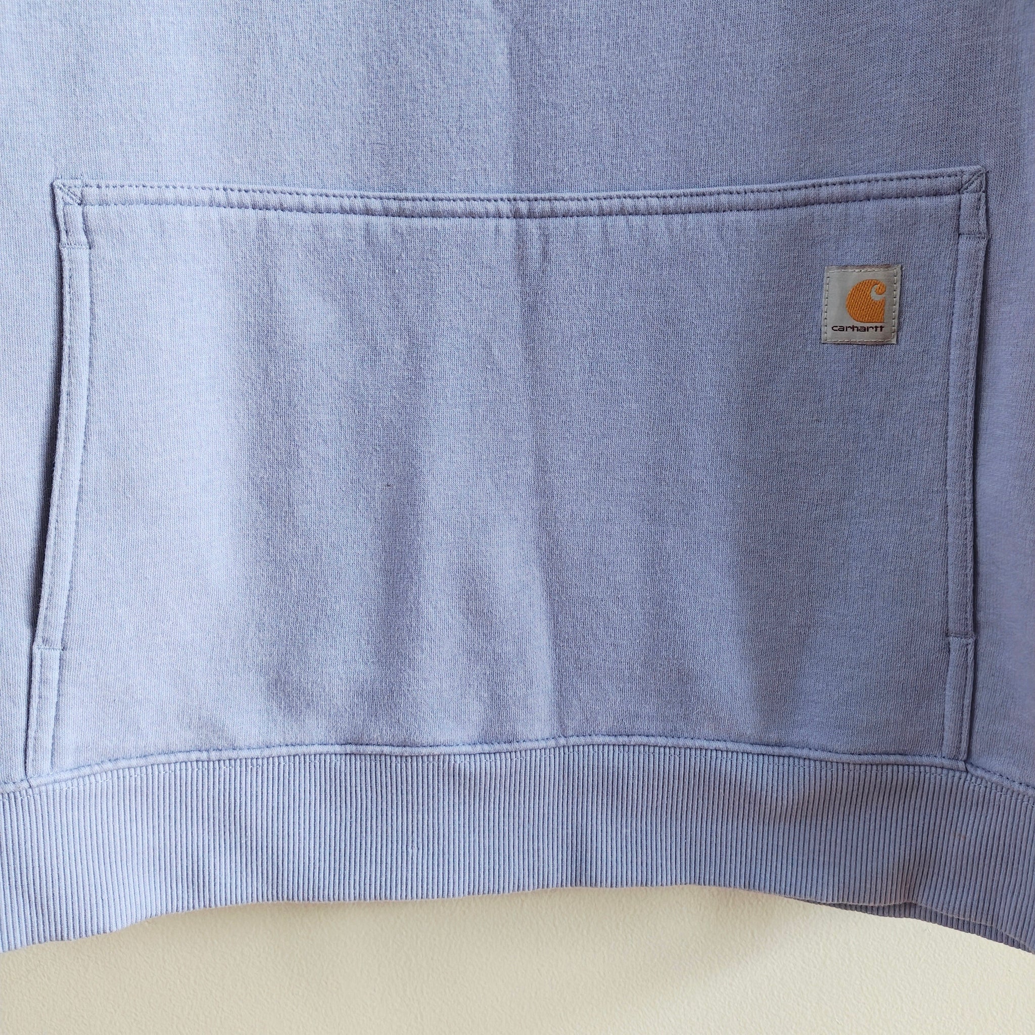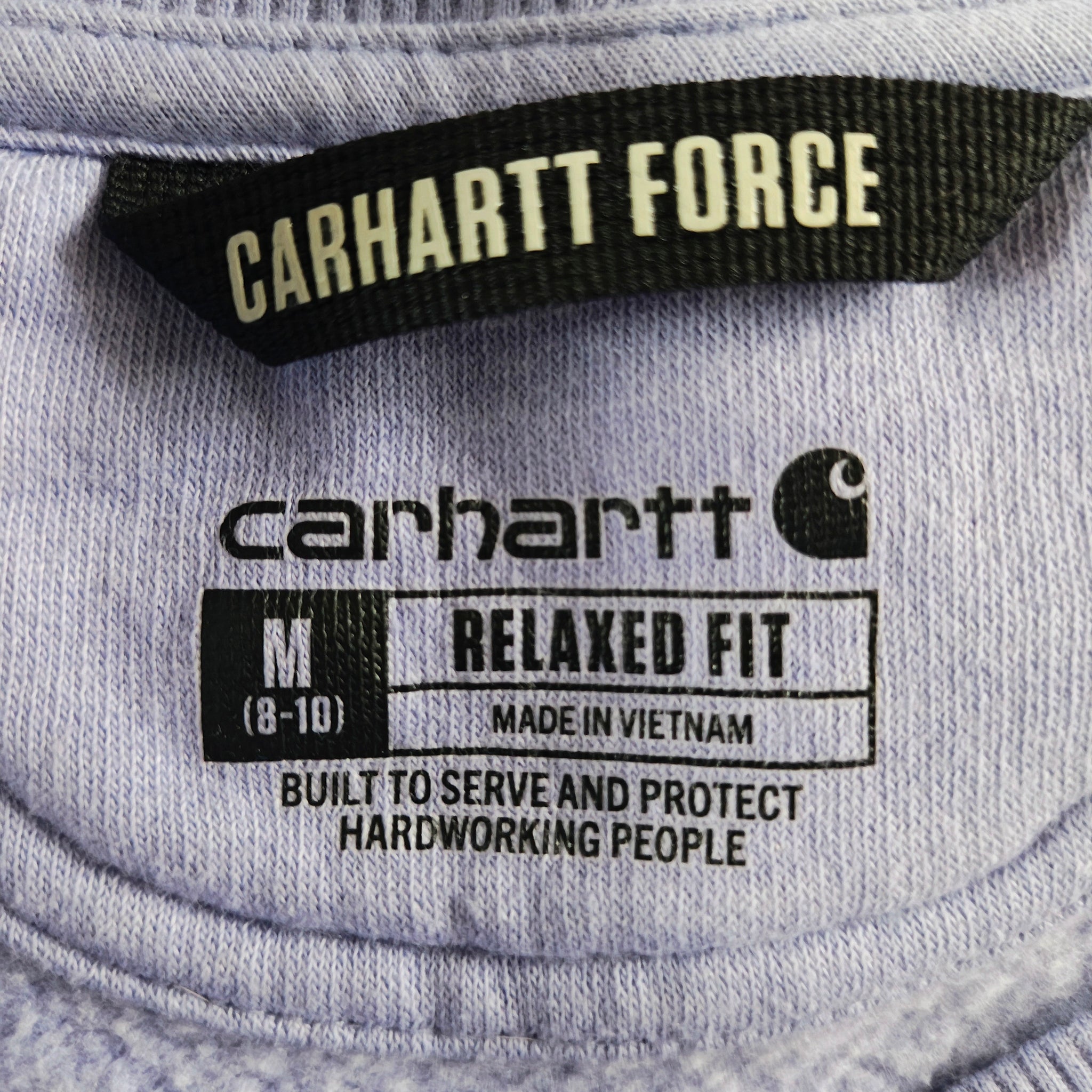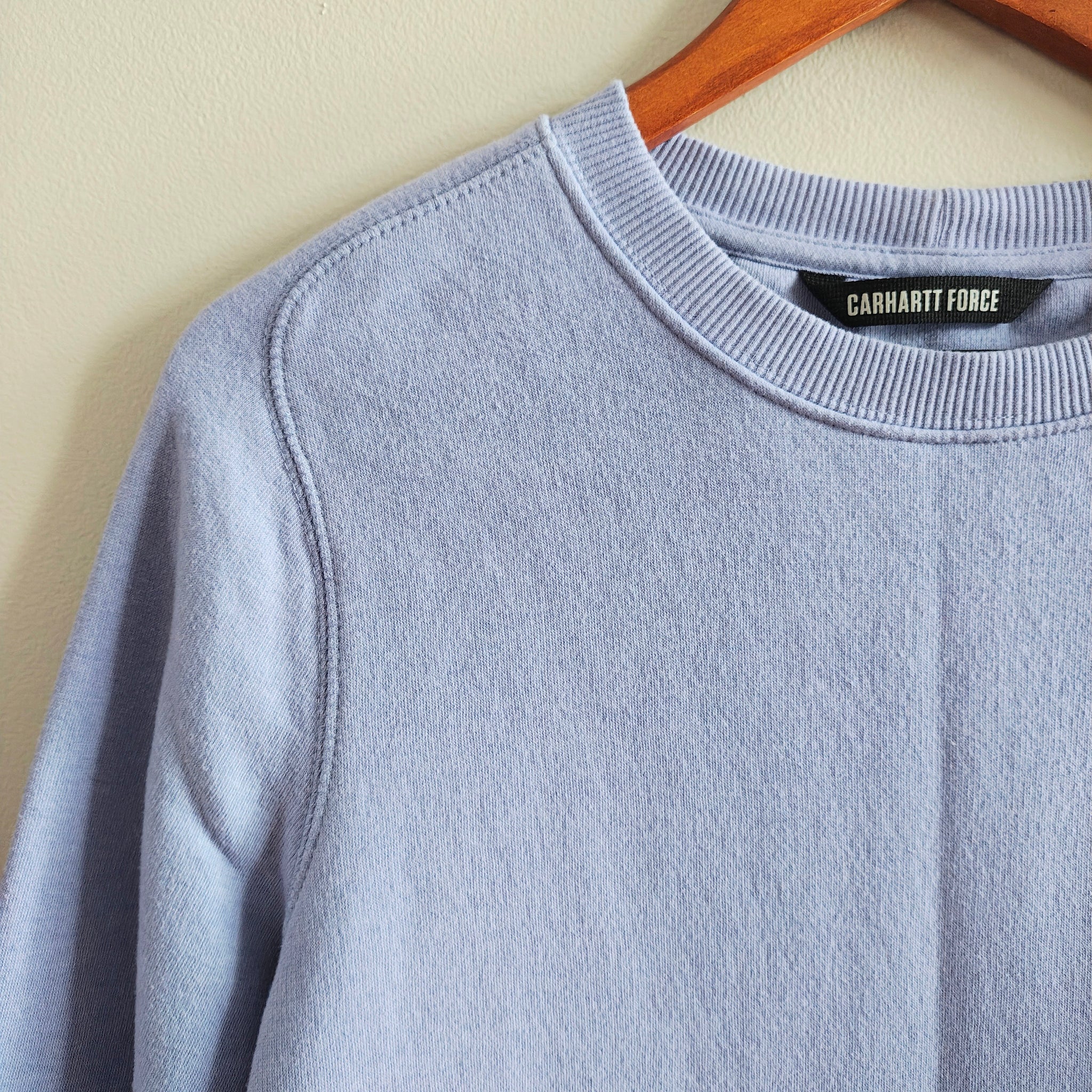 Carhartt Force Relaxed Fit Lightweight Crewneck Sweatshirt for women, in the color "Soft Lavender Heather". This pullover is designed with Carhartt's Force technology to wick sweat and dry quickly, and features a handy front pouch pocket with a hidden media pocket inside.
