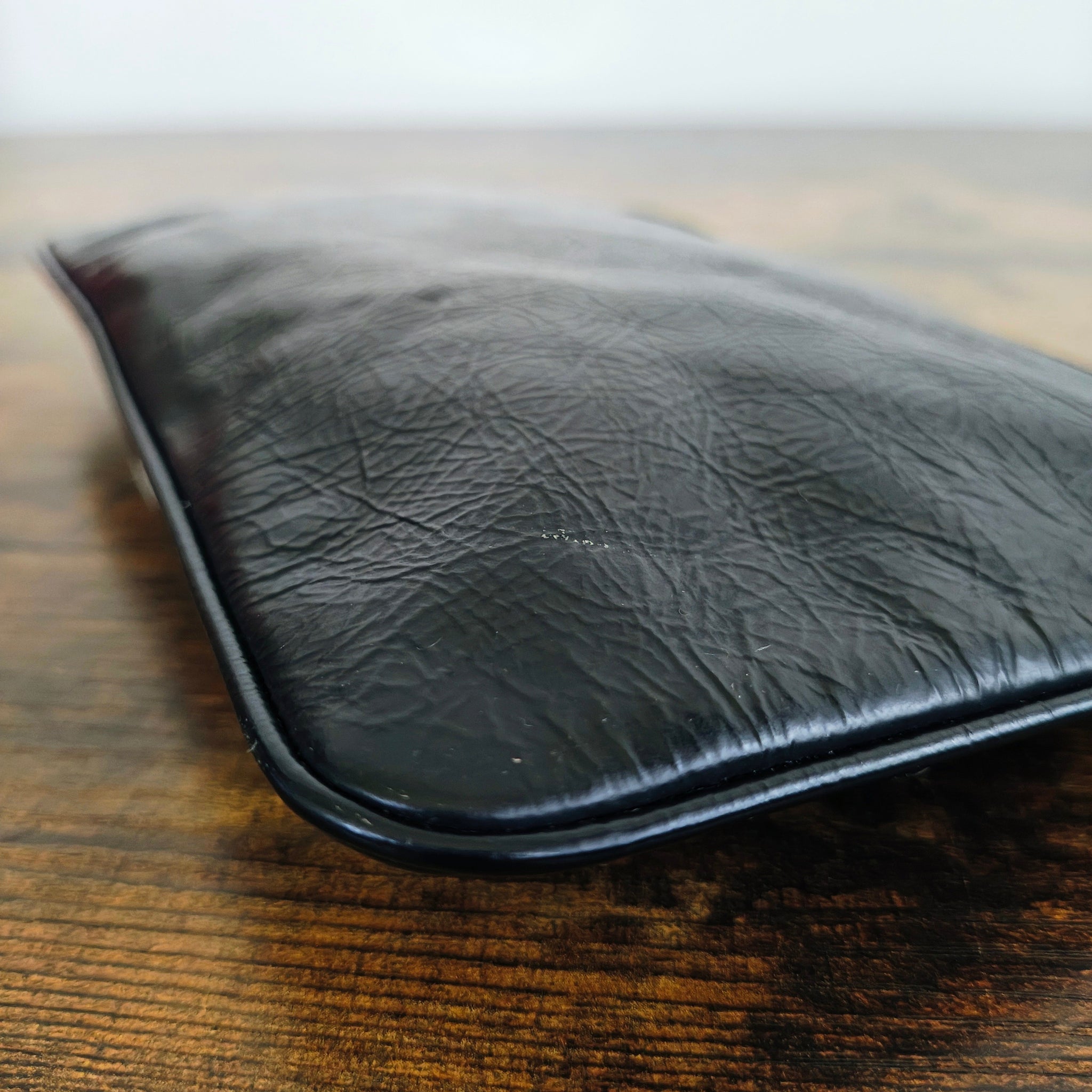 Coach C Monogram Pouch Black Patent Leather Wristlet with signature inlaid design. It features a large "C" logo pattern in black patent leather with inlays of yellow and grey suede or leather material.