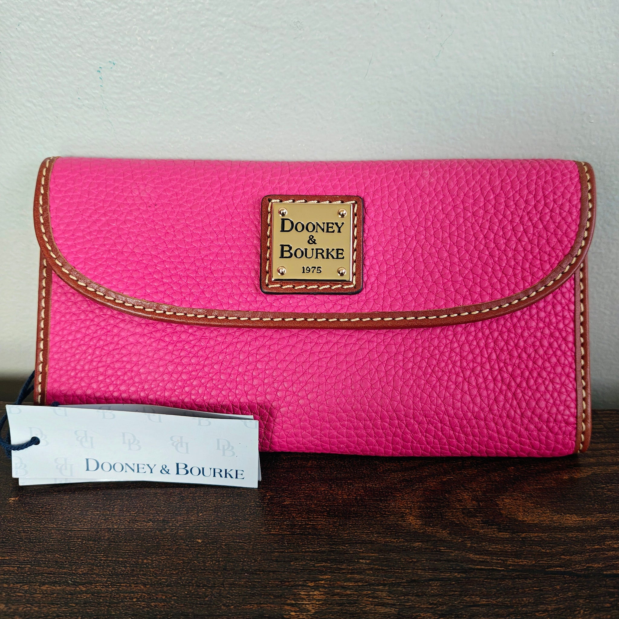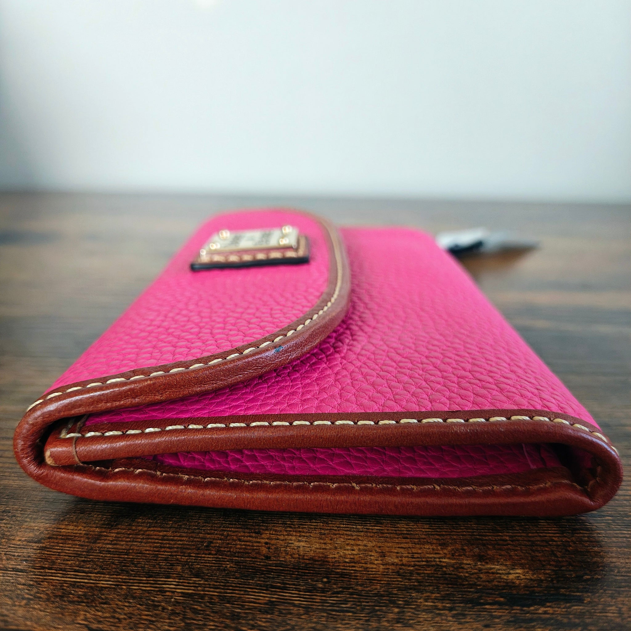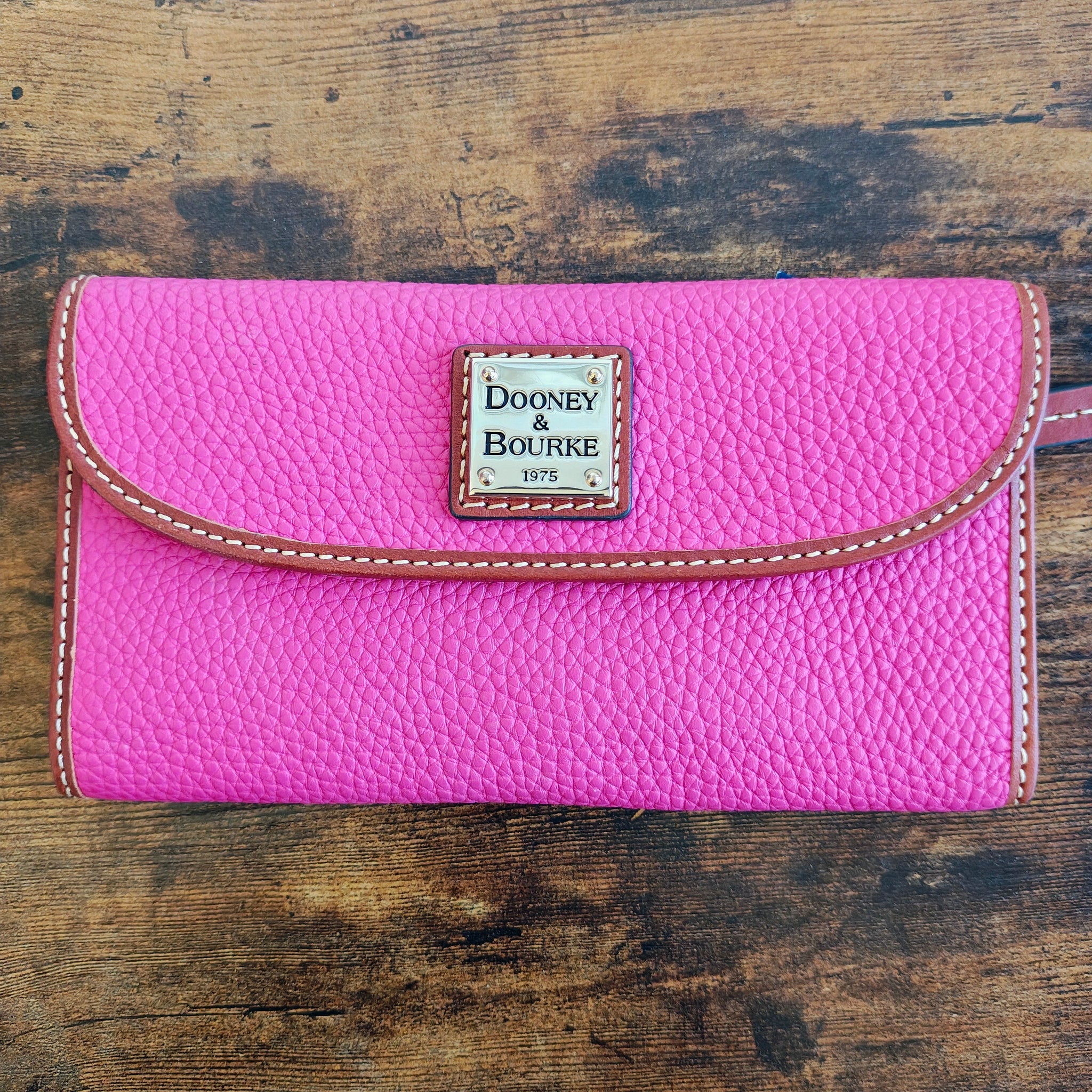 Dooney & Bourke Pebble Grain Continental Clutch wallet in a vibrant shade of hot pink or fuchsia. The wallet is made from a durable pebble grain leather with contrasting brown trim and a gold-finished logo plate.