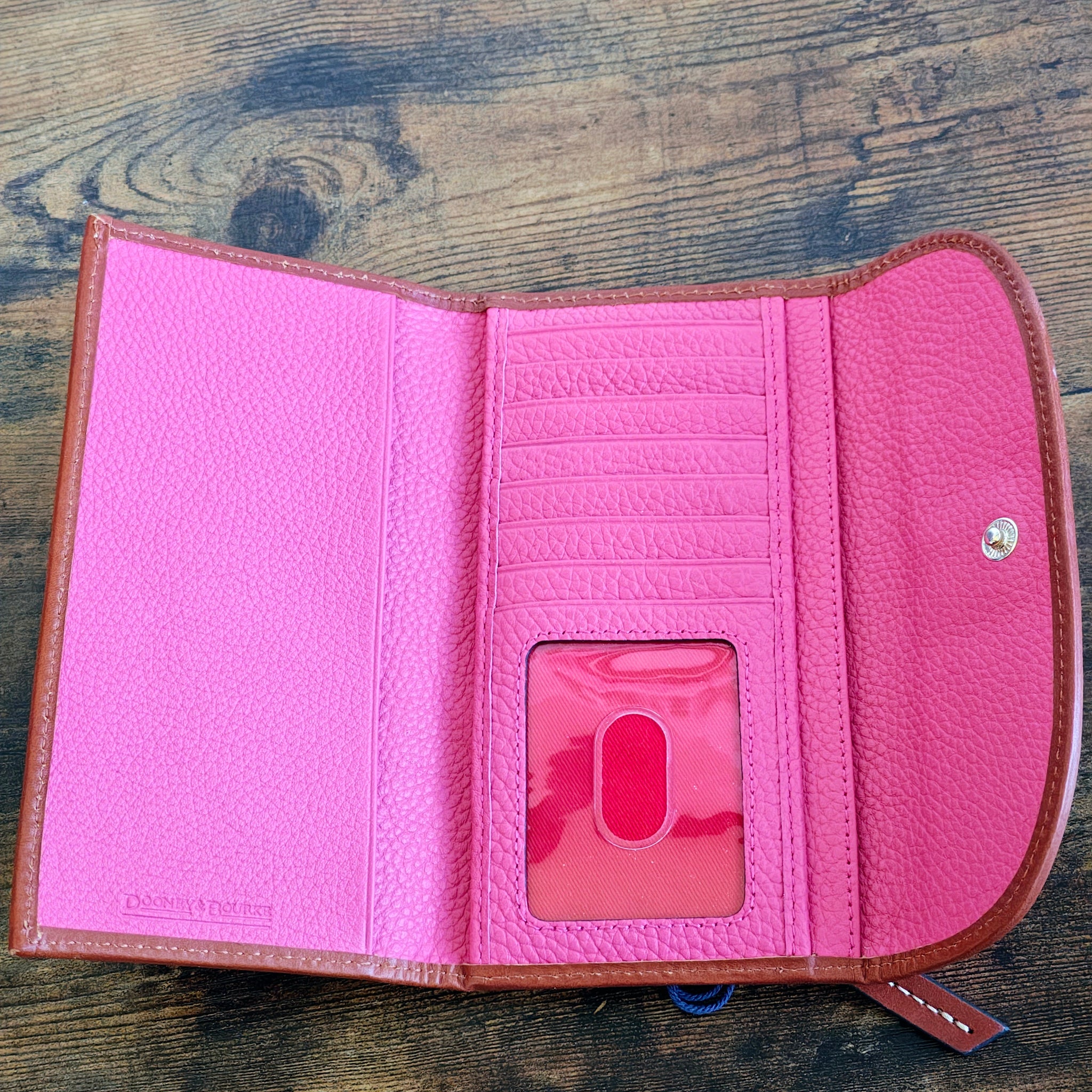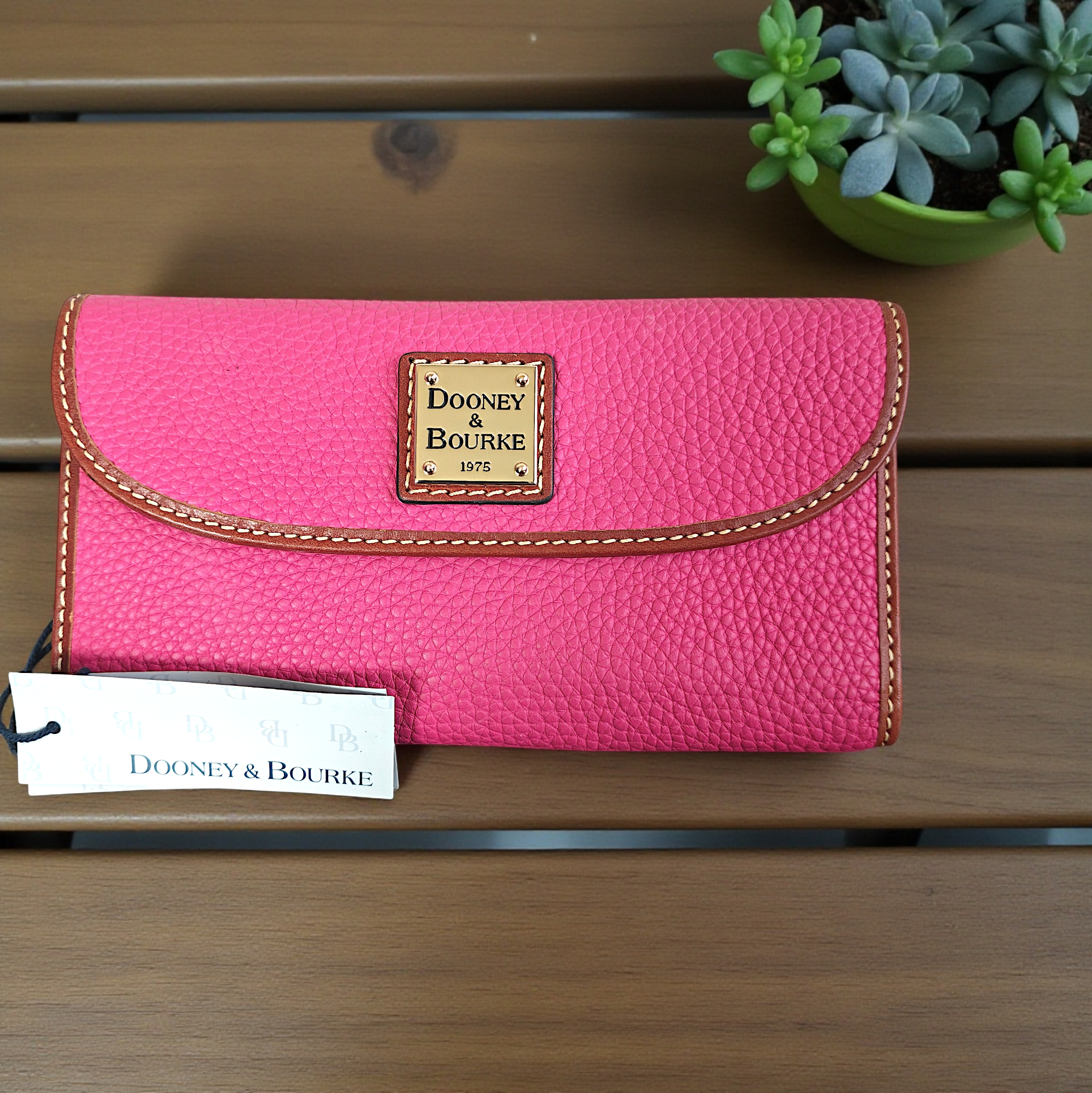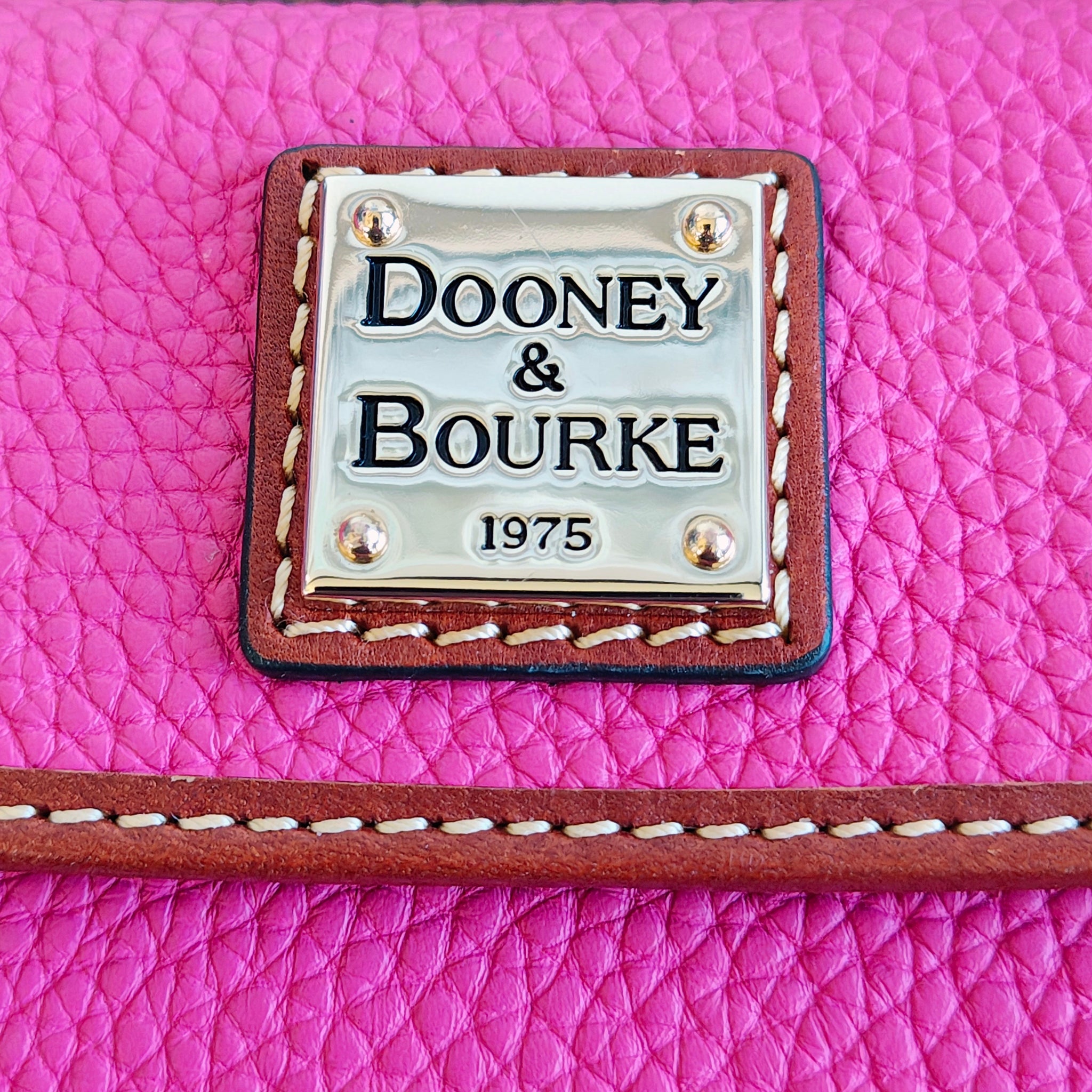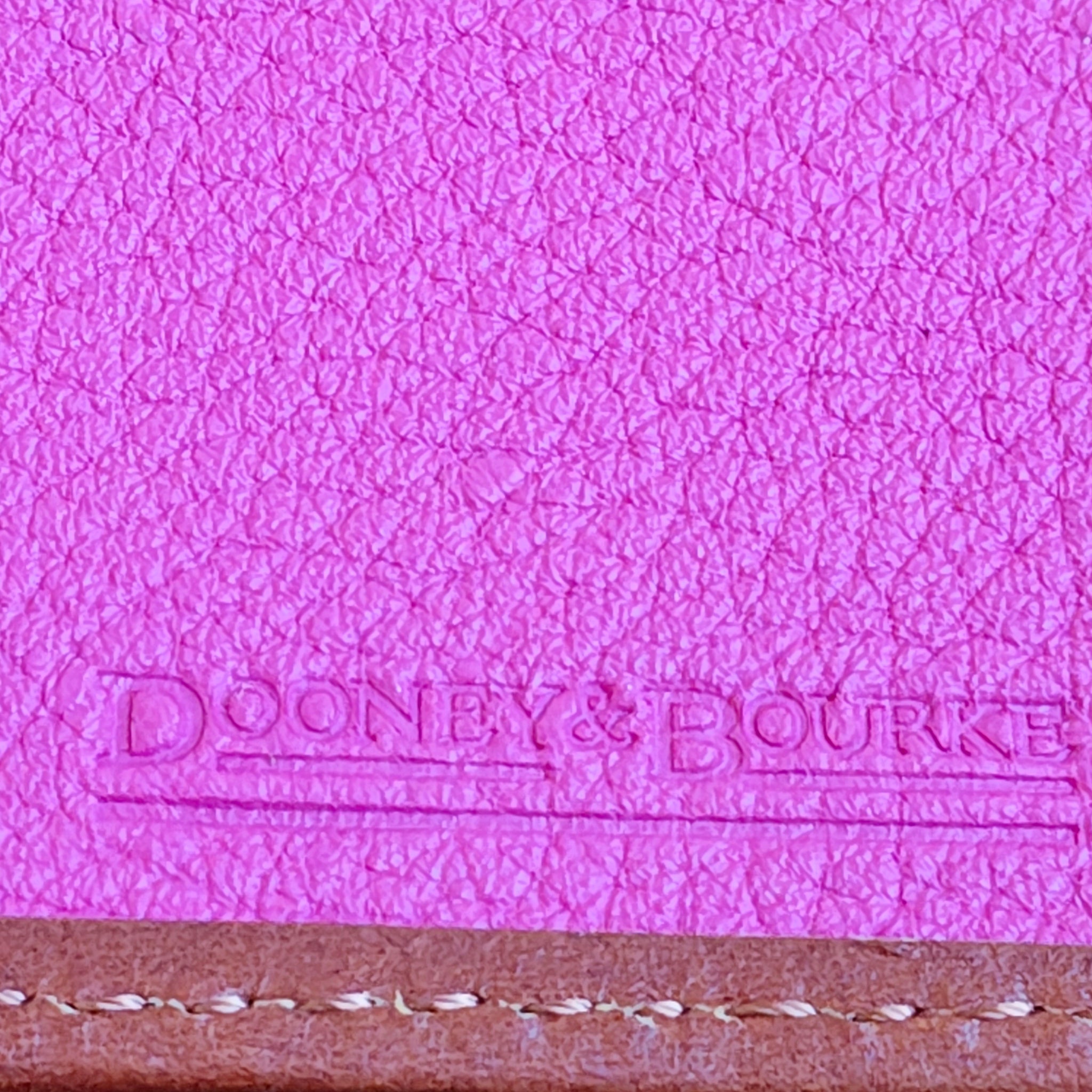 Dooney & Bourke Pebble Grain Continental Clutch wallet in a vibrant shade of hot pink or fuchsia. The wallet is made from a durable pebble grain leather with contrasting brown trim and a gold-finished logo plate.