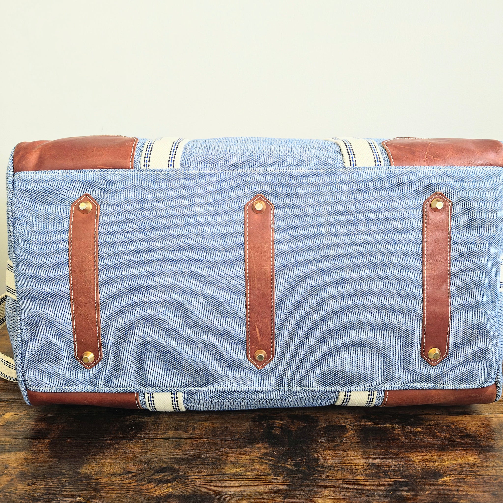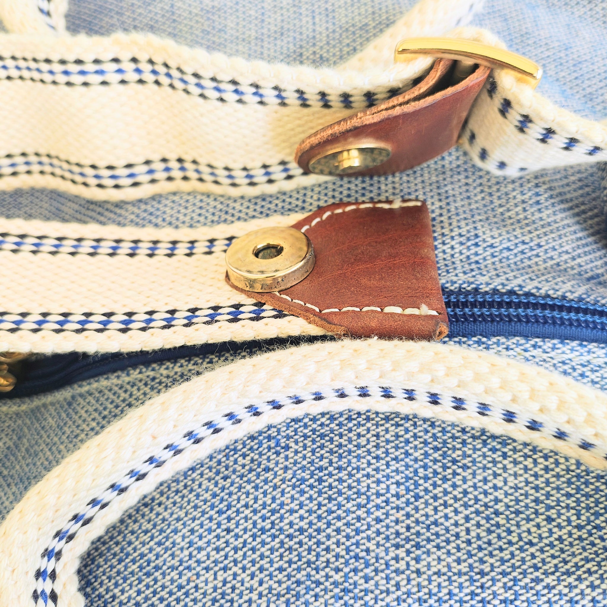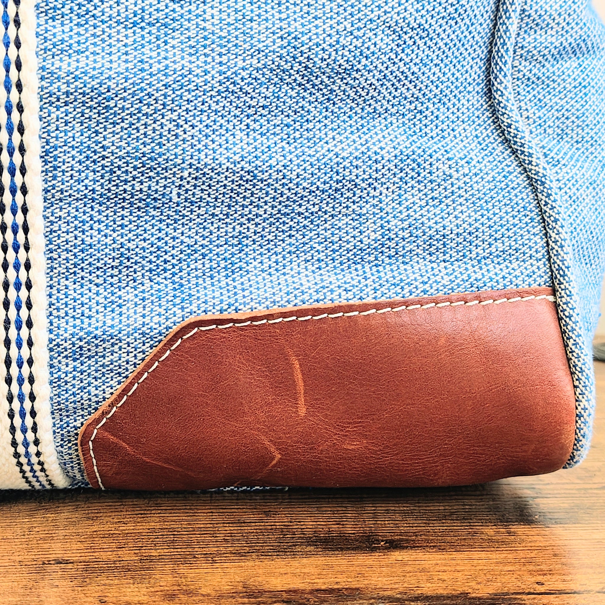 It includes cream-colored heavy canvas handles and an adjustable, removable shoulder strap with blue-striped stitch detailing. The design is accented with brown leather patches at the handle bases and bottom corners. Bottom has metal feet with leather accents.