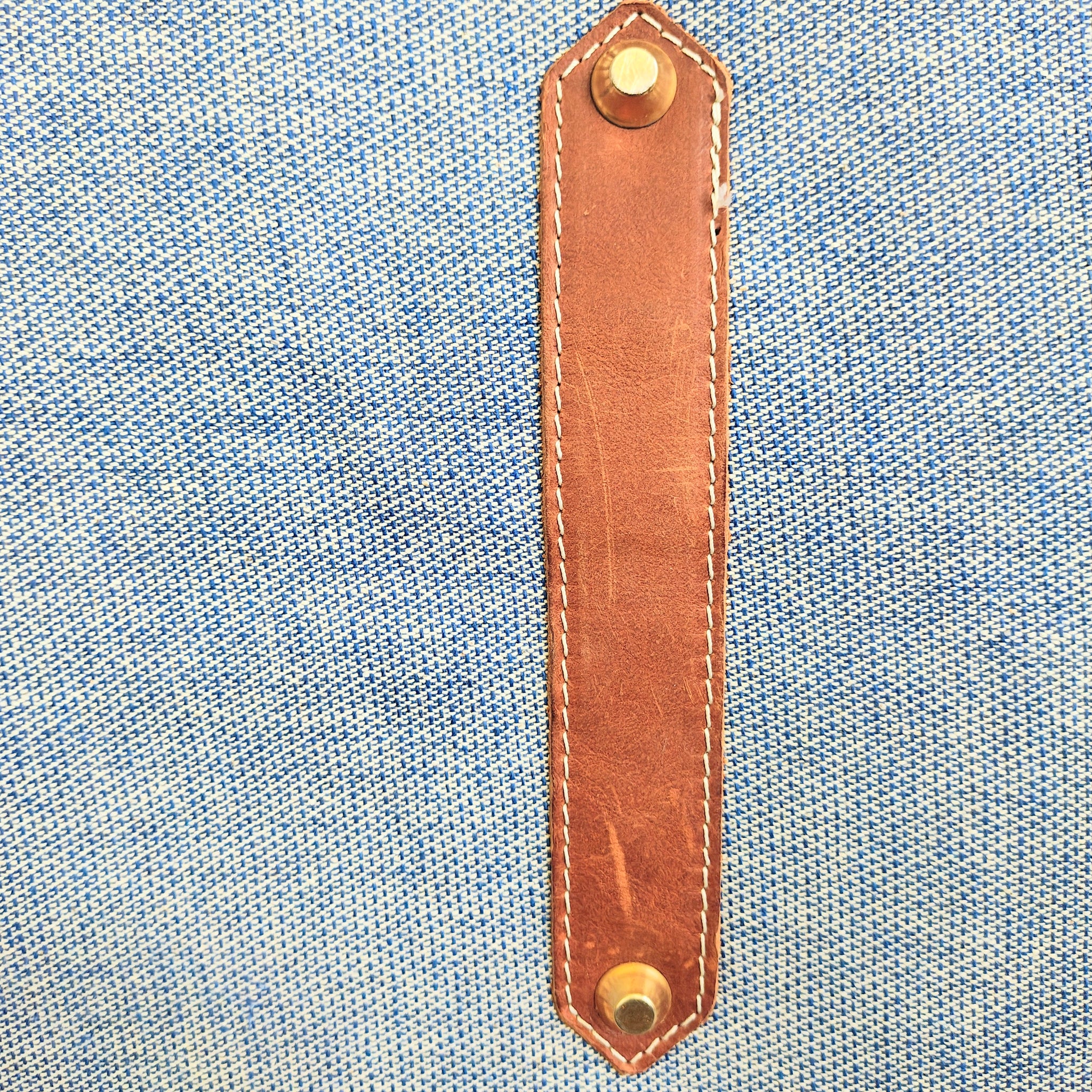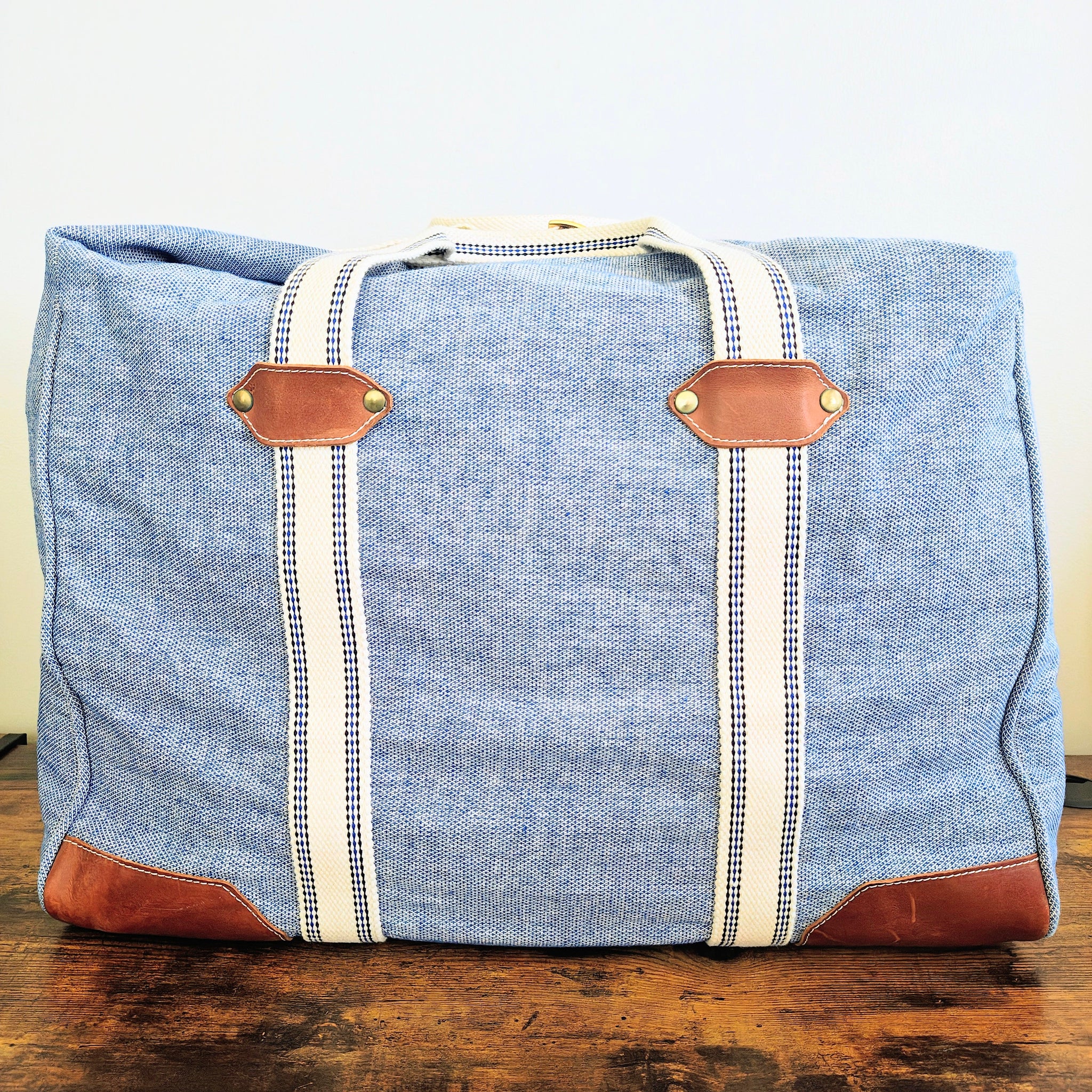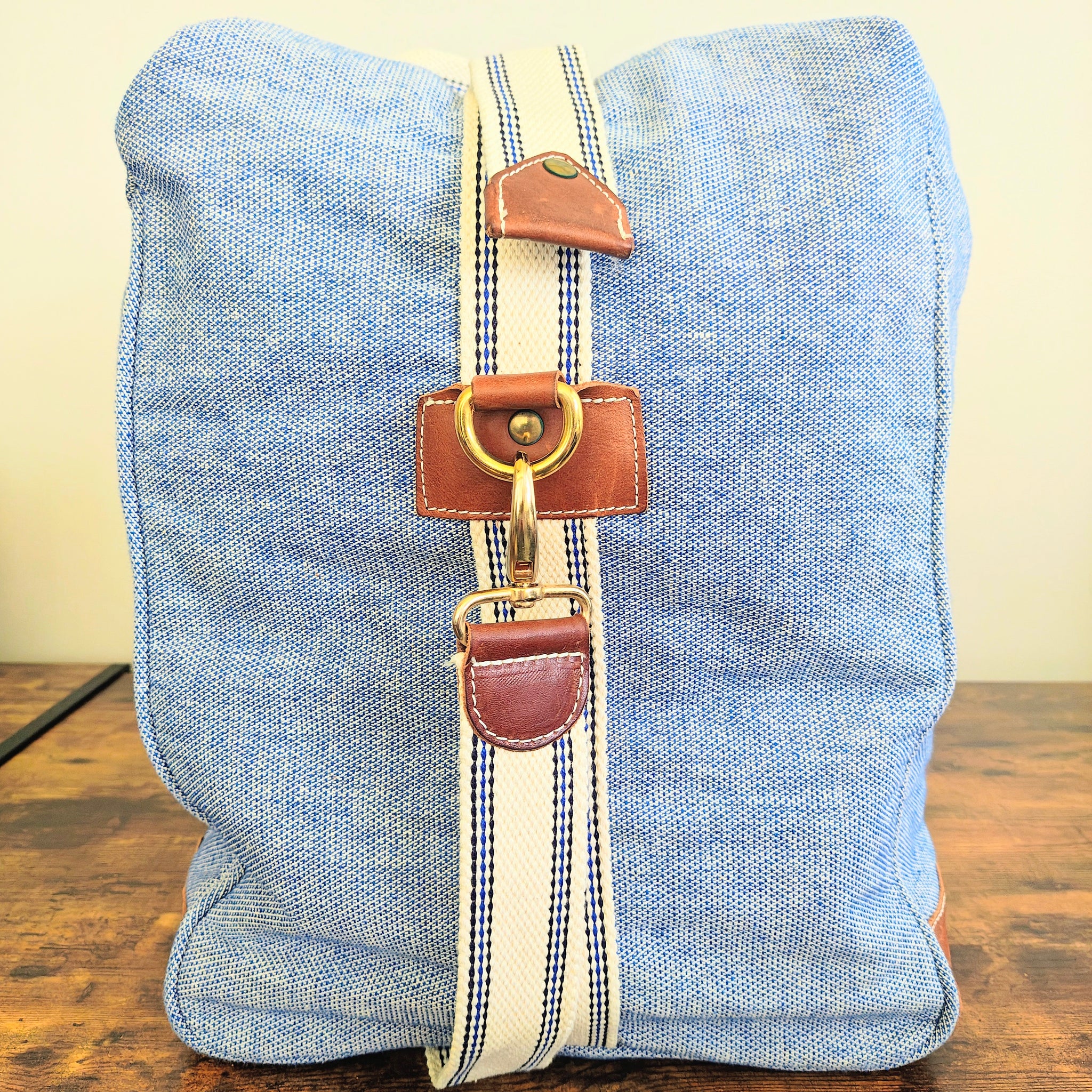 It includes cream-colored heavy canvas handles and an adjustable, removable shoulder strap with blue-striped stitch detailing. The design is accented with brown leather patches at the handle bases and bottom corners. Bottom has metal feet with leather accents.