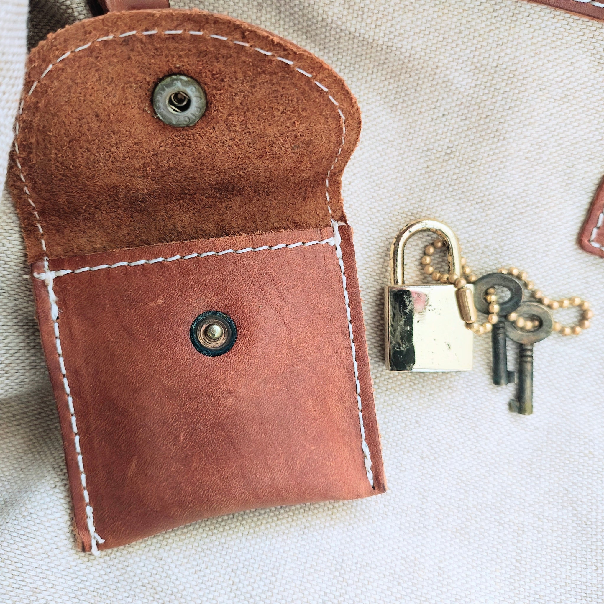 Has interior leather pouch that stores a functional lock with two keys for securing contents during travel.