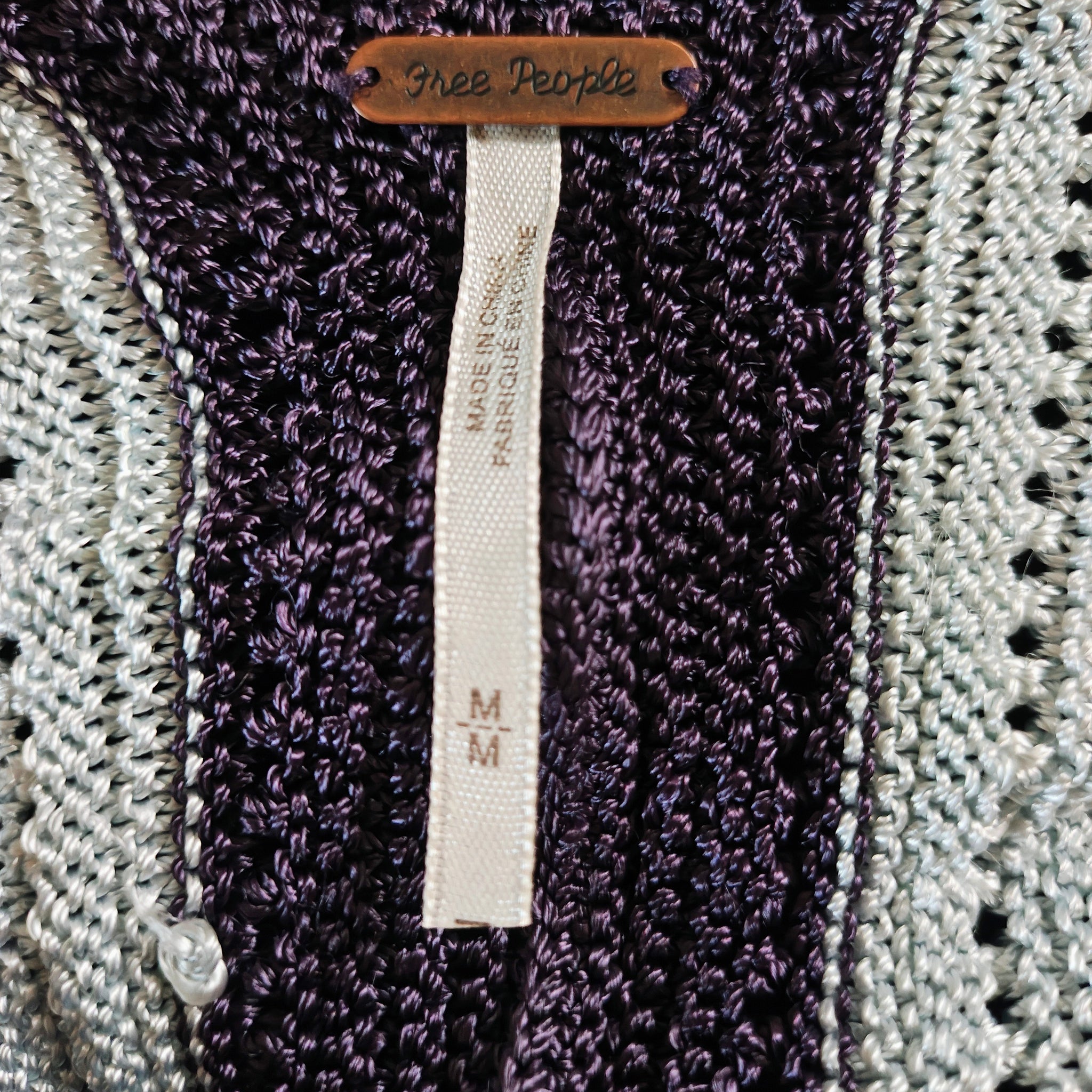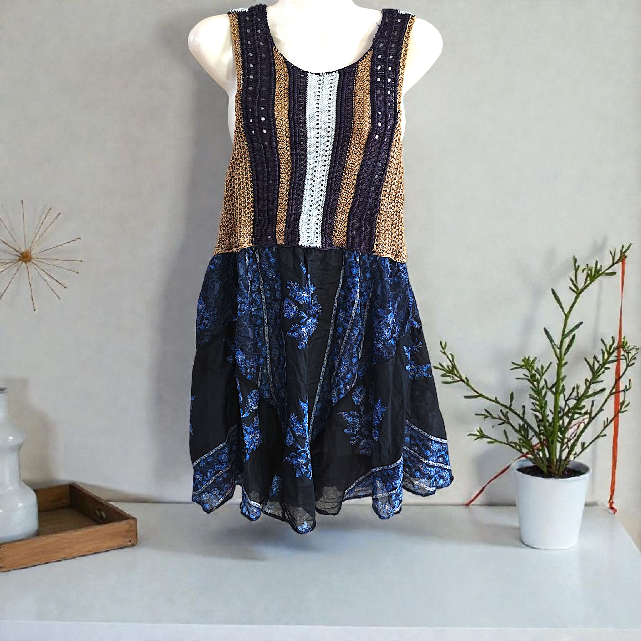 Free People Katie's Mini Dress (or Tunic), which features a multi-colored crochet knit bodice and a flowing, dark blue floral or paisley print skirt.