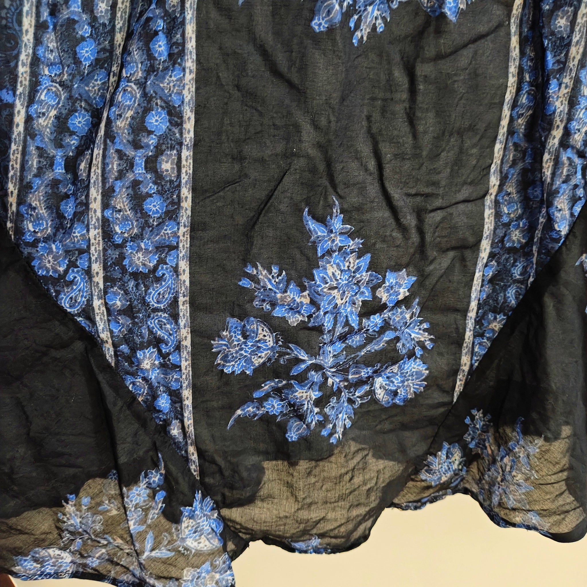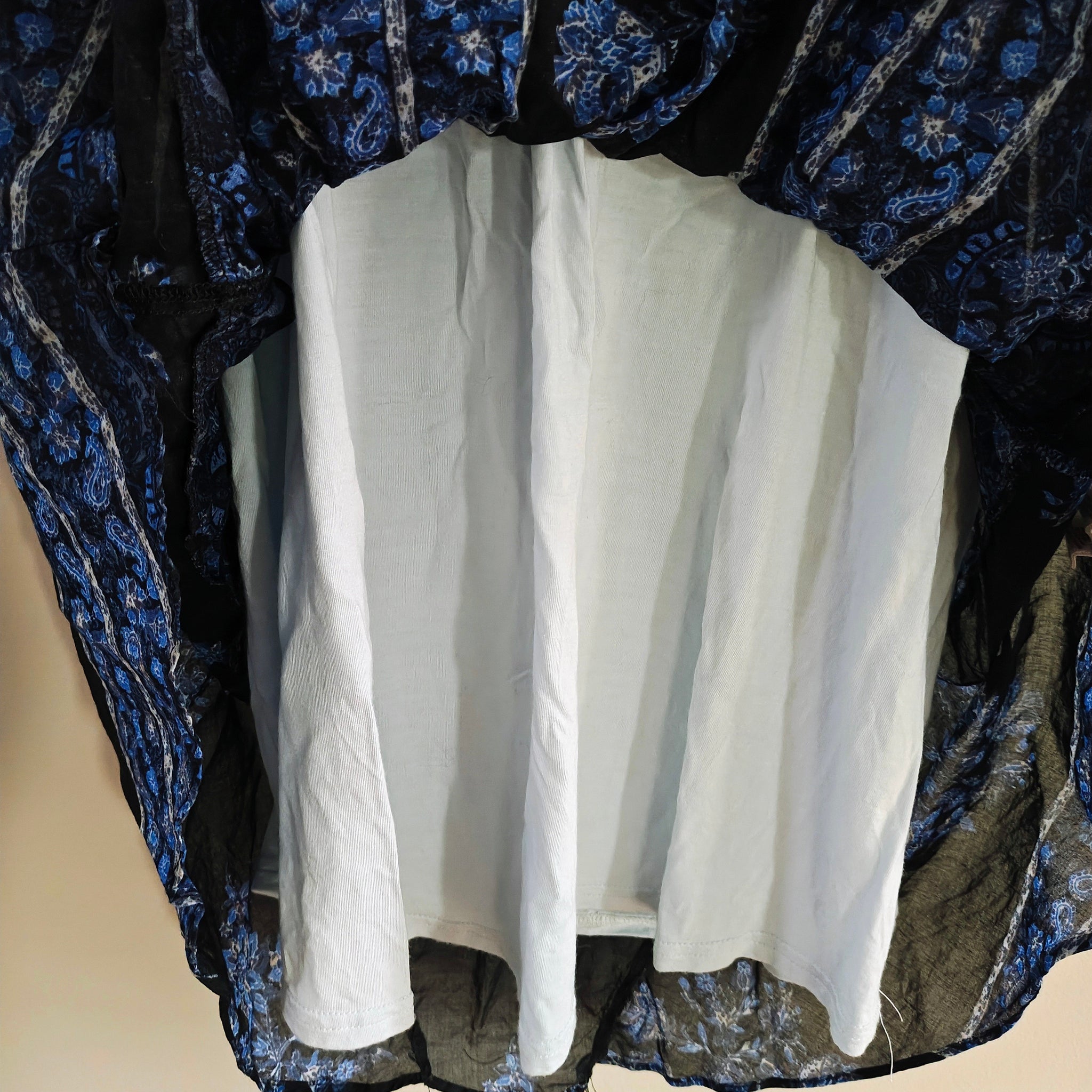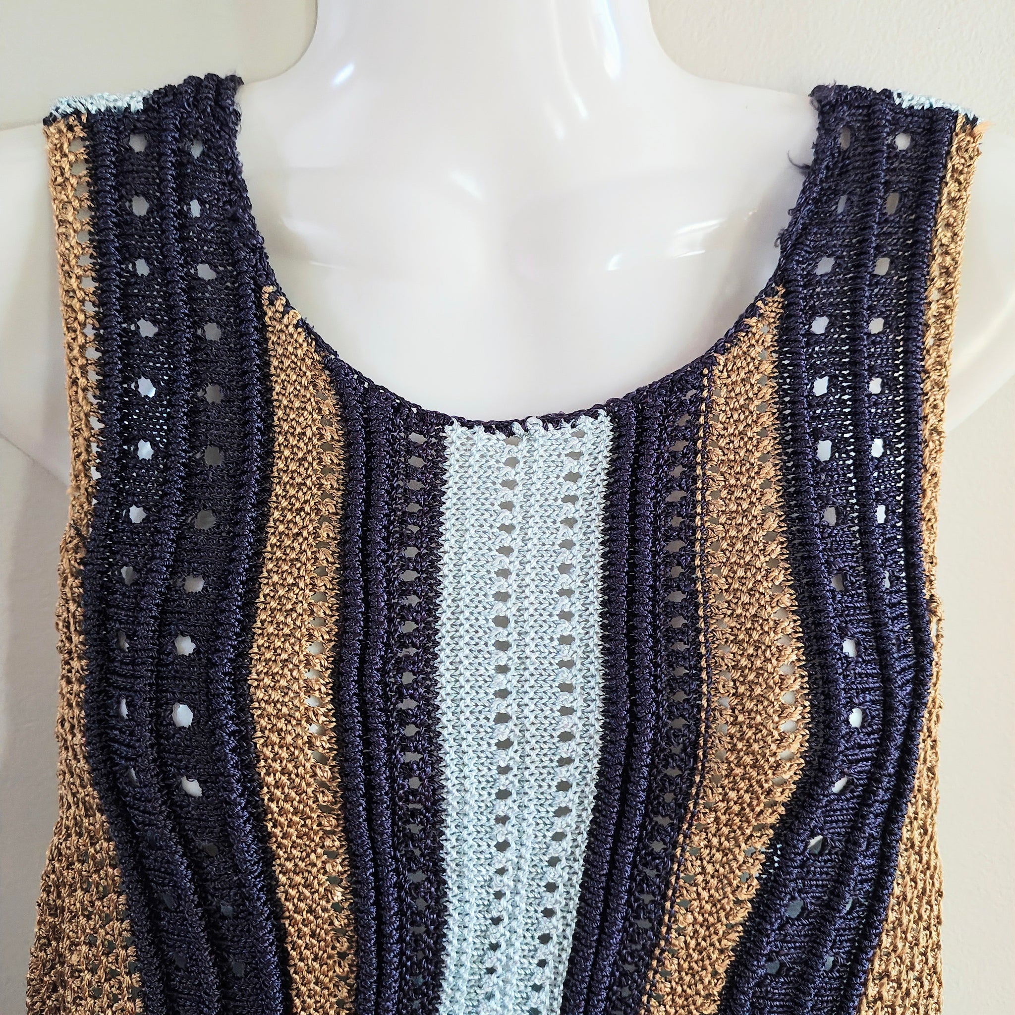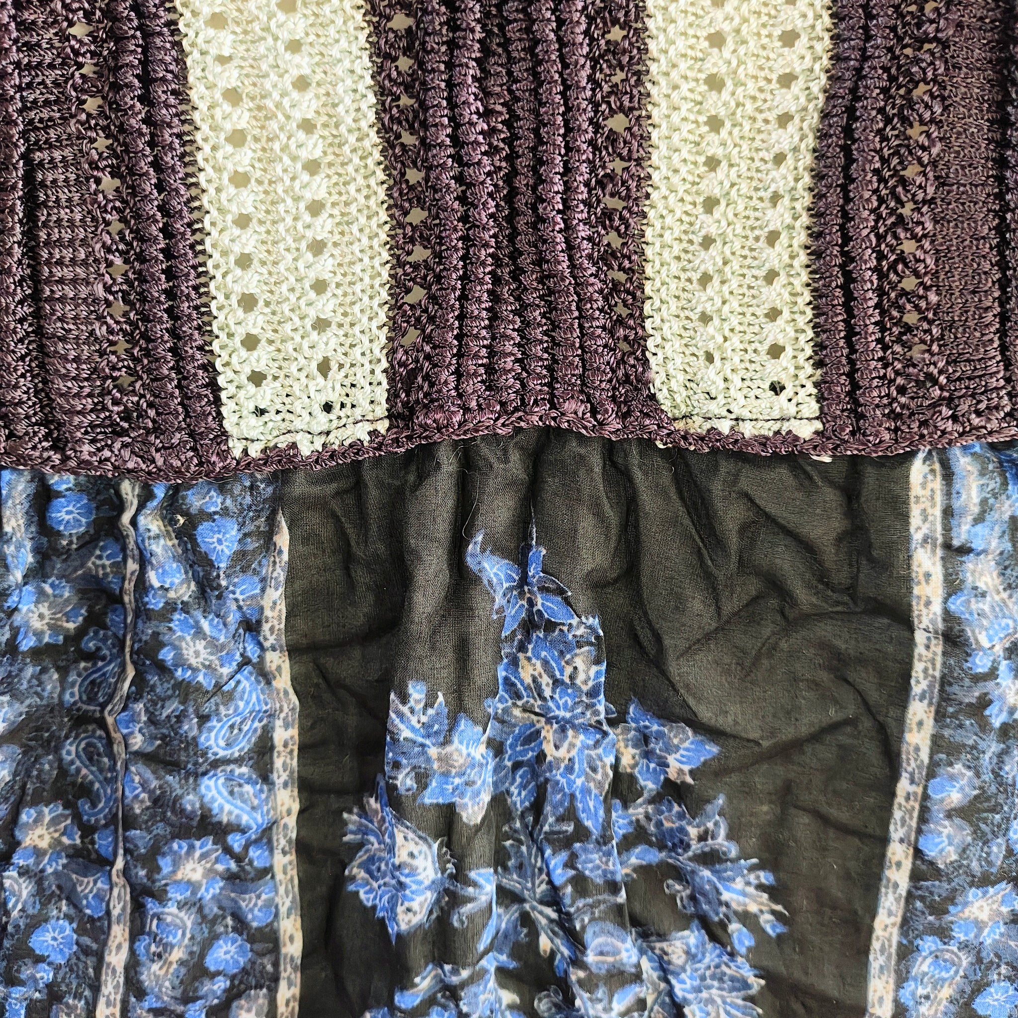 Design: The top is a sleeveless, round-neck crochet knit in navy, beige, and white stripes, while the bottom is a black/navy skirt with a blue floral/paisley pattern.