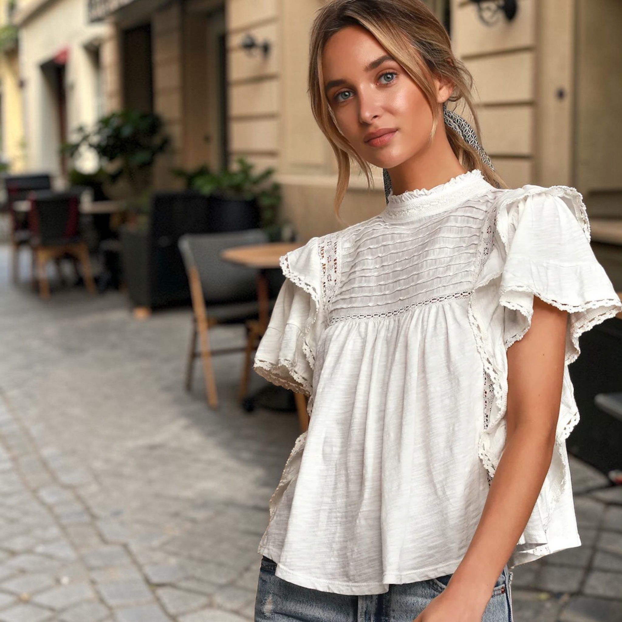 Ruffled Sleeves: Short, fluttery sleeves with delicate lace edging.