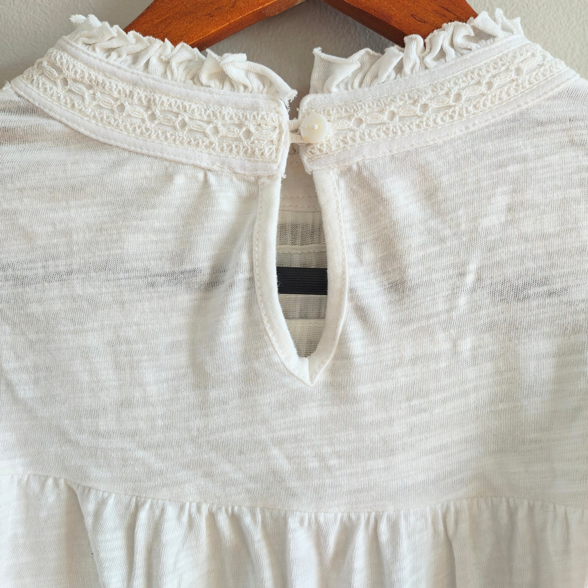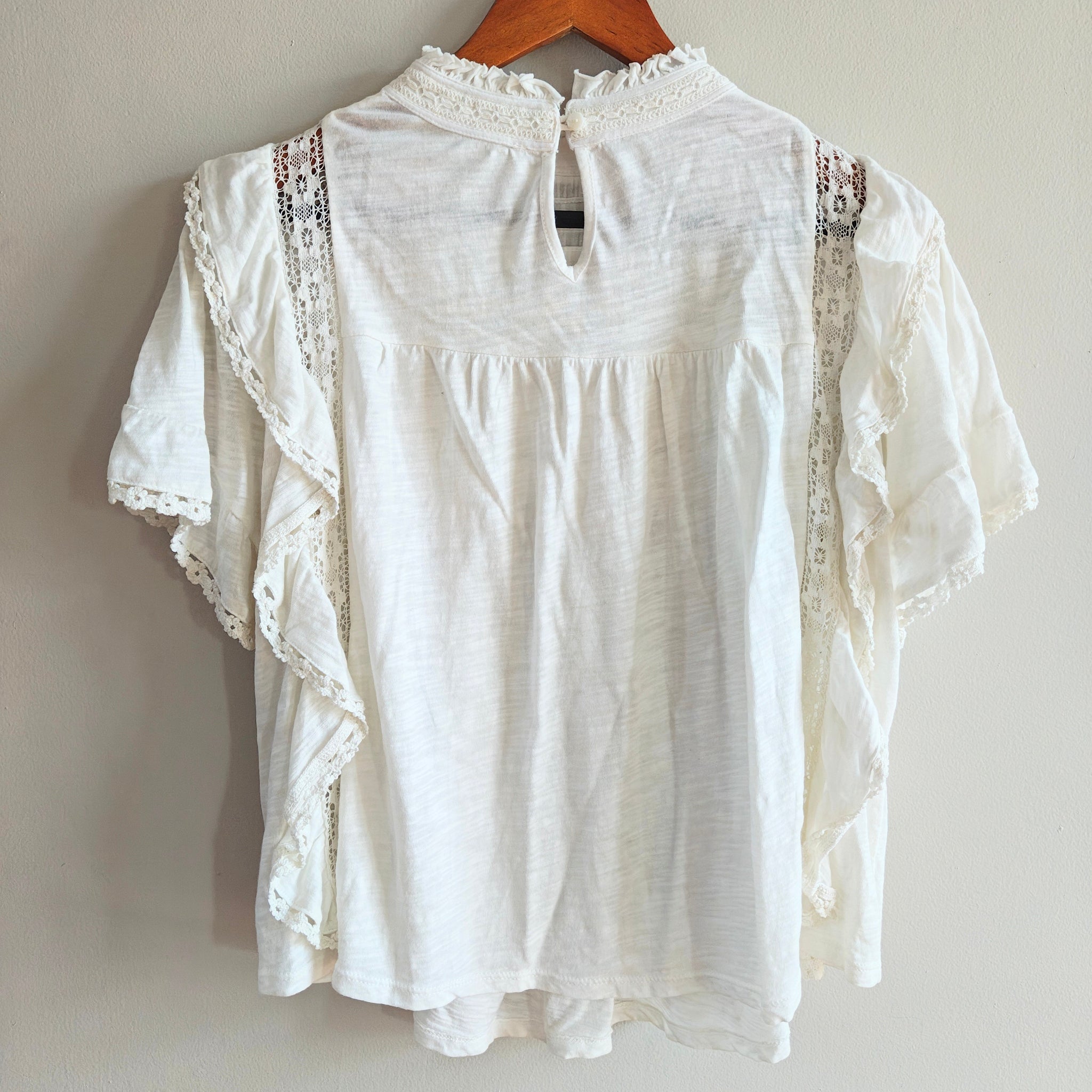 Free People Le Femme Tee in Ivory. It is a lightweight blouse crafted from 100% cotton (with a burnout knit texture) featuring several romantic design elements:
