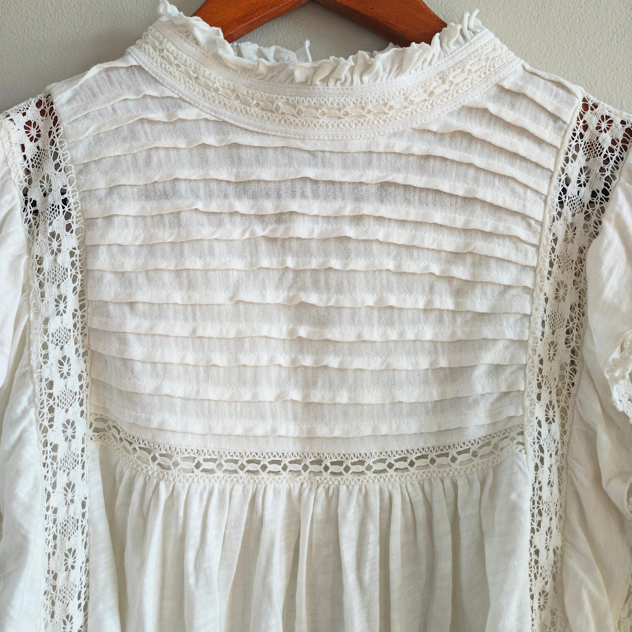 Lace Detailing: Vertical and horizontal crochet lace insets and trim throughout.