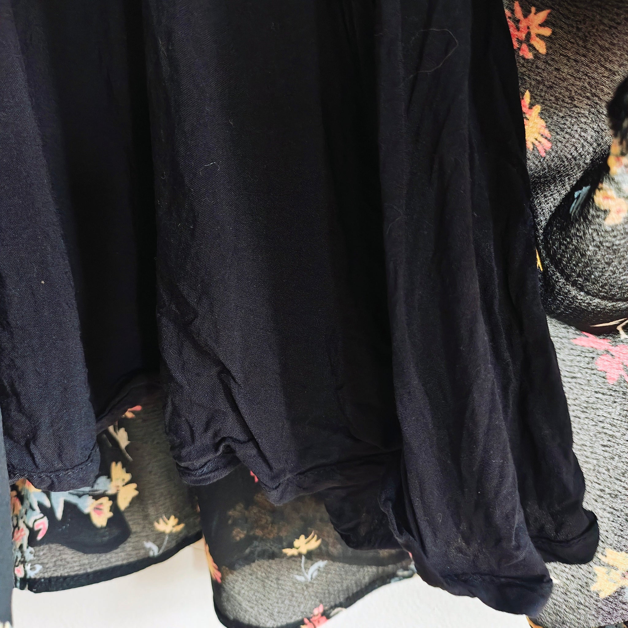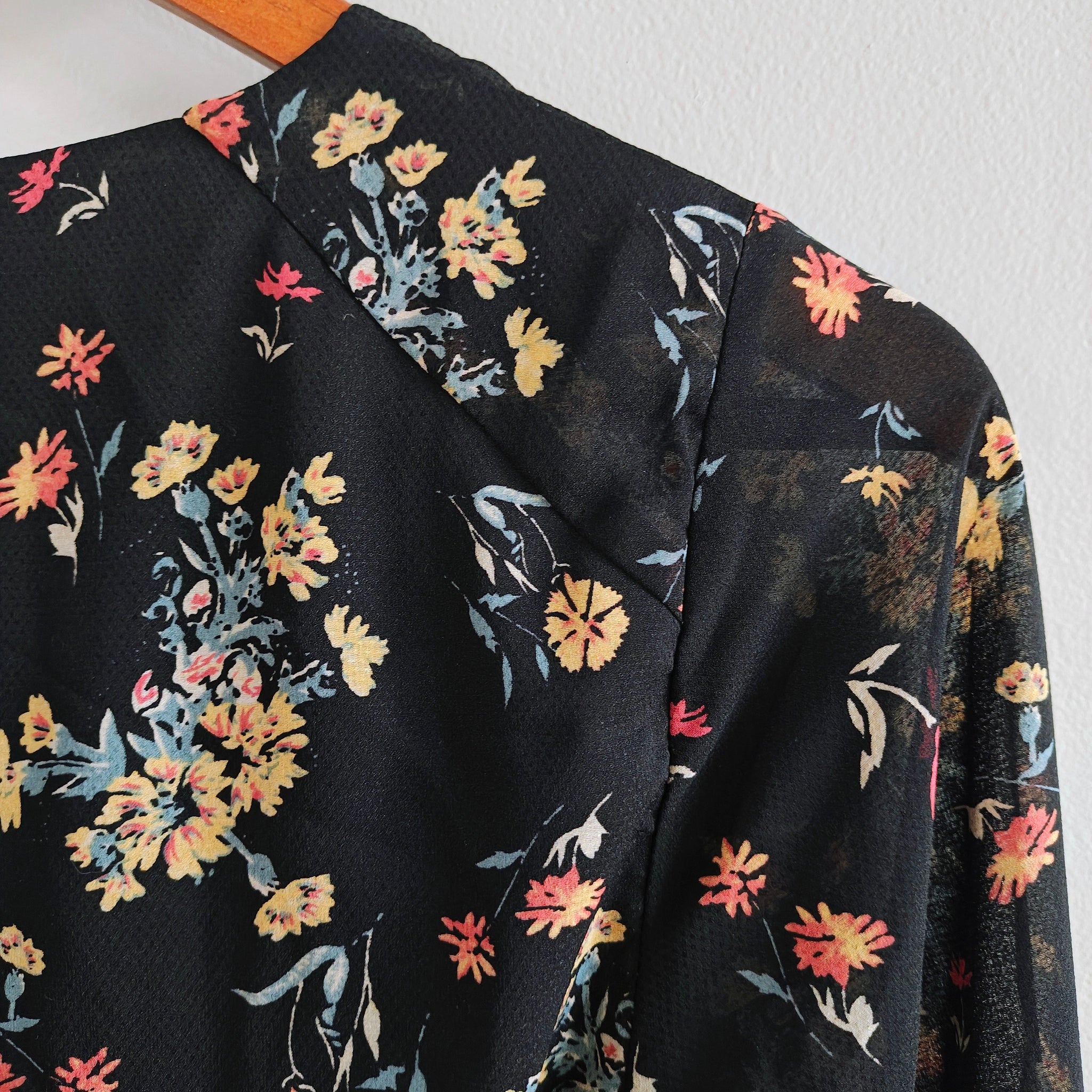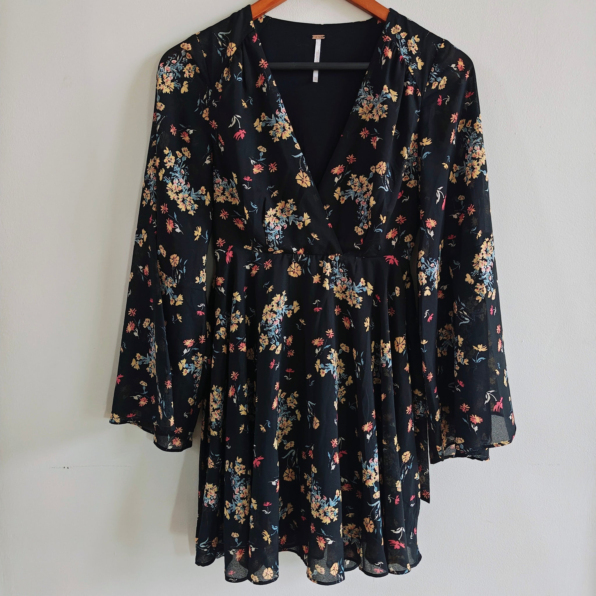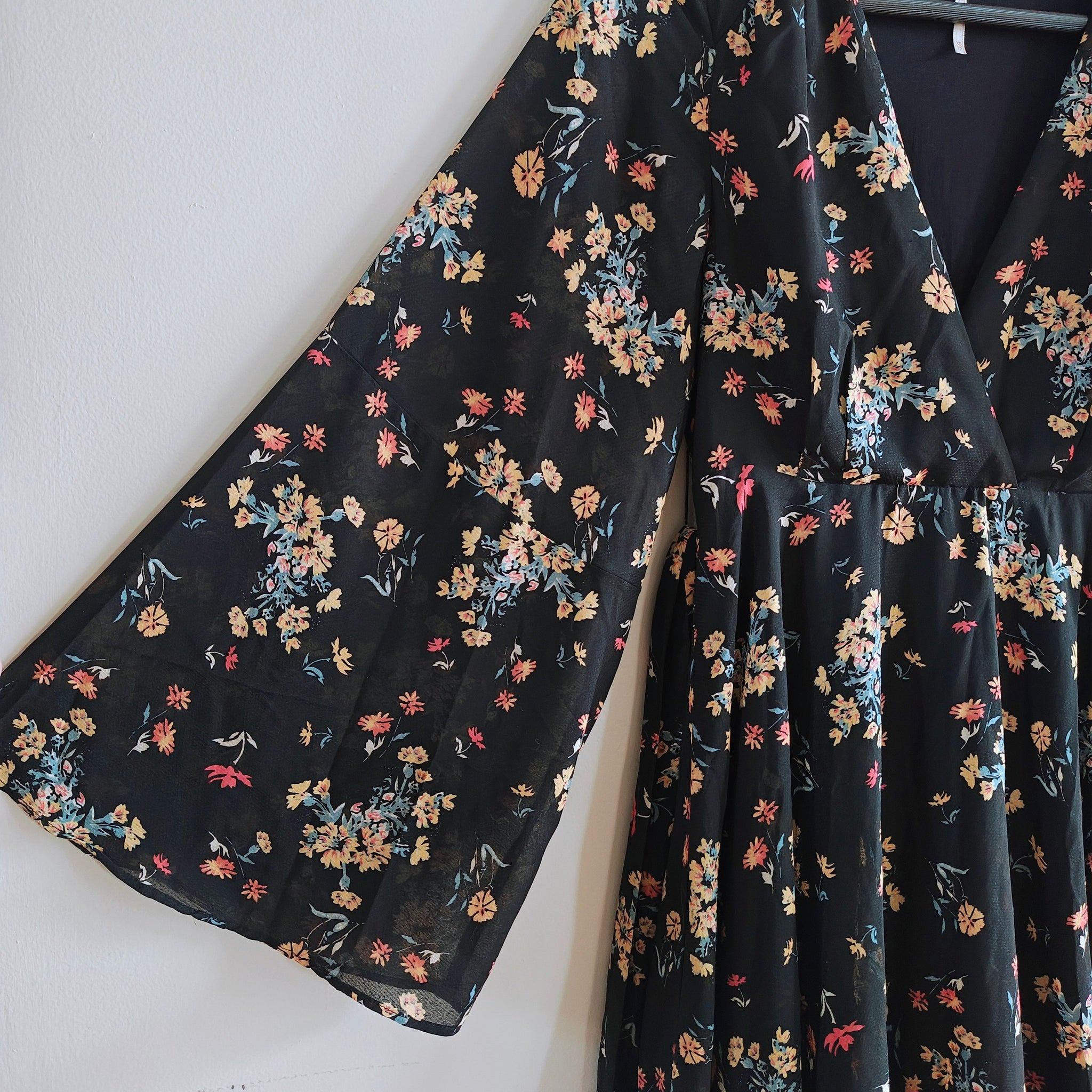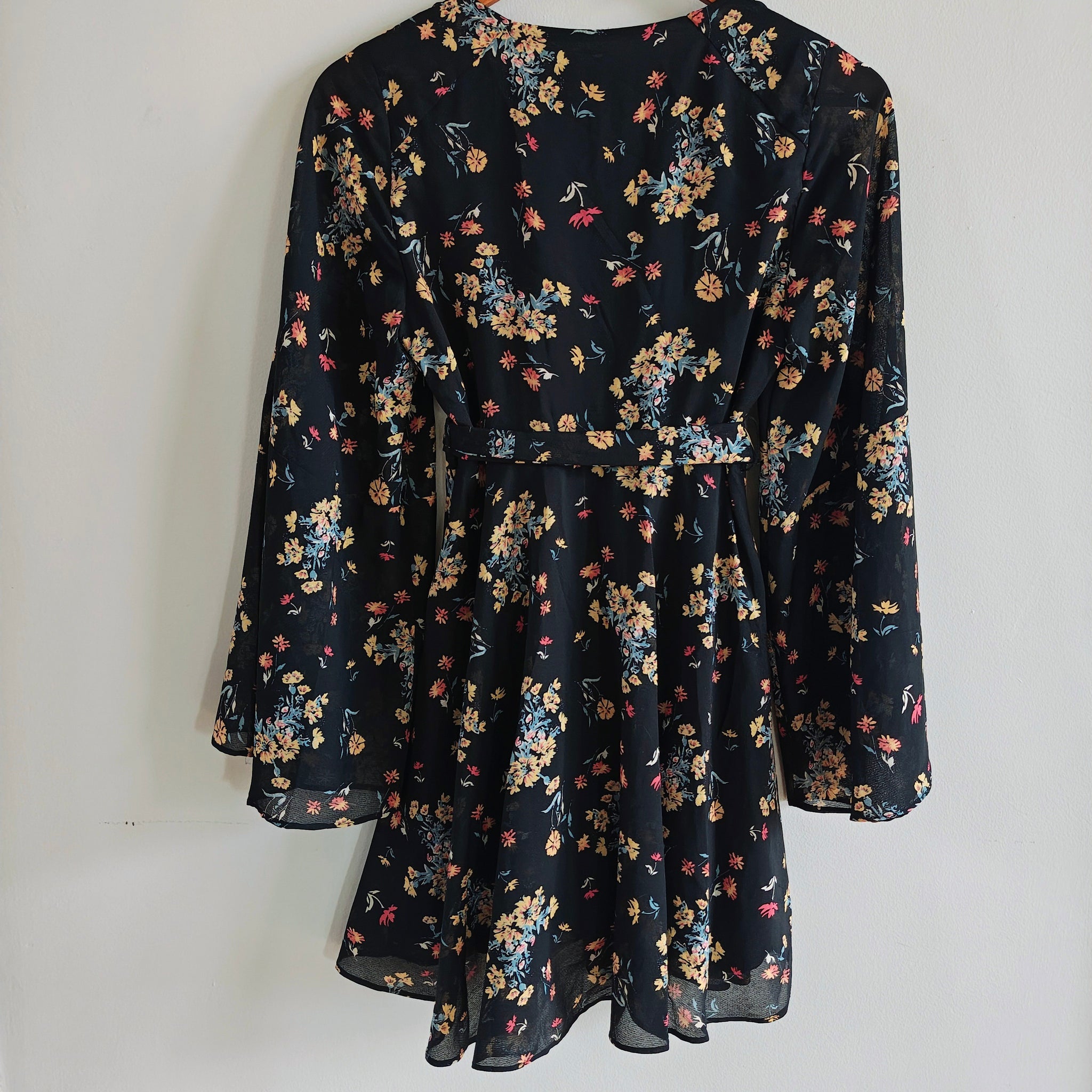 This mini dress features a black base with a colorful floral print, a plunging V-neckline (surplice neck), and long, flowy bell sleeves. It has a hidden side-zip closure and a self-tie waist for an adjustable fit.