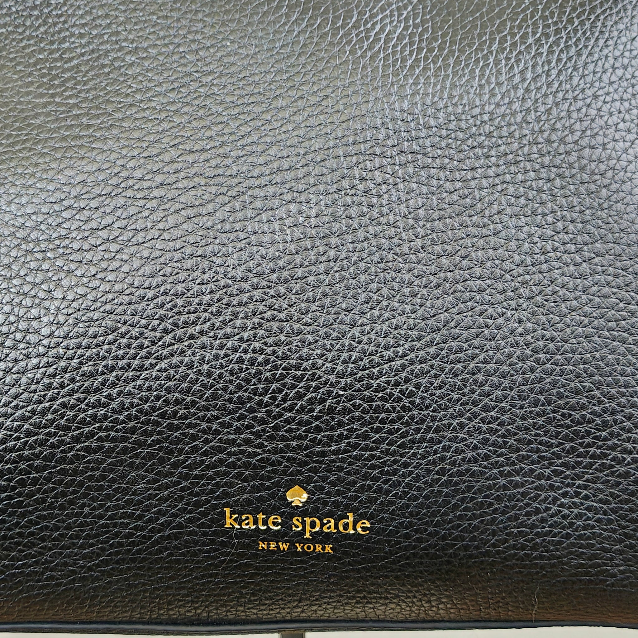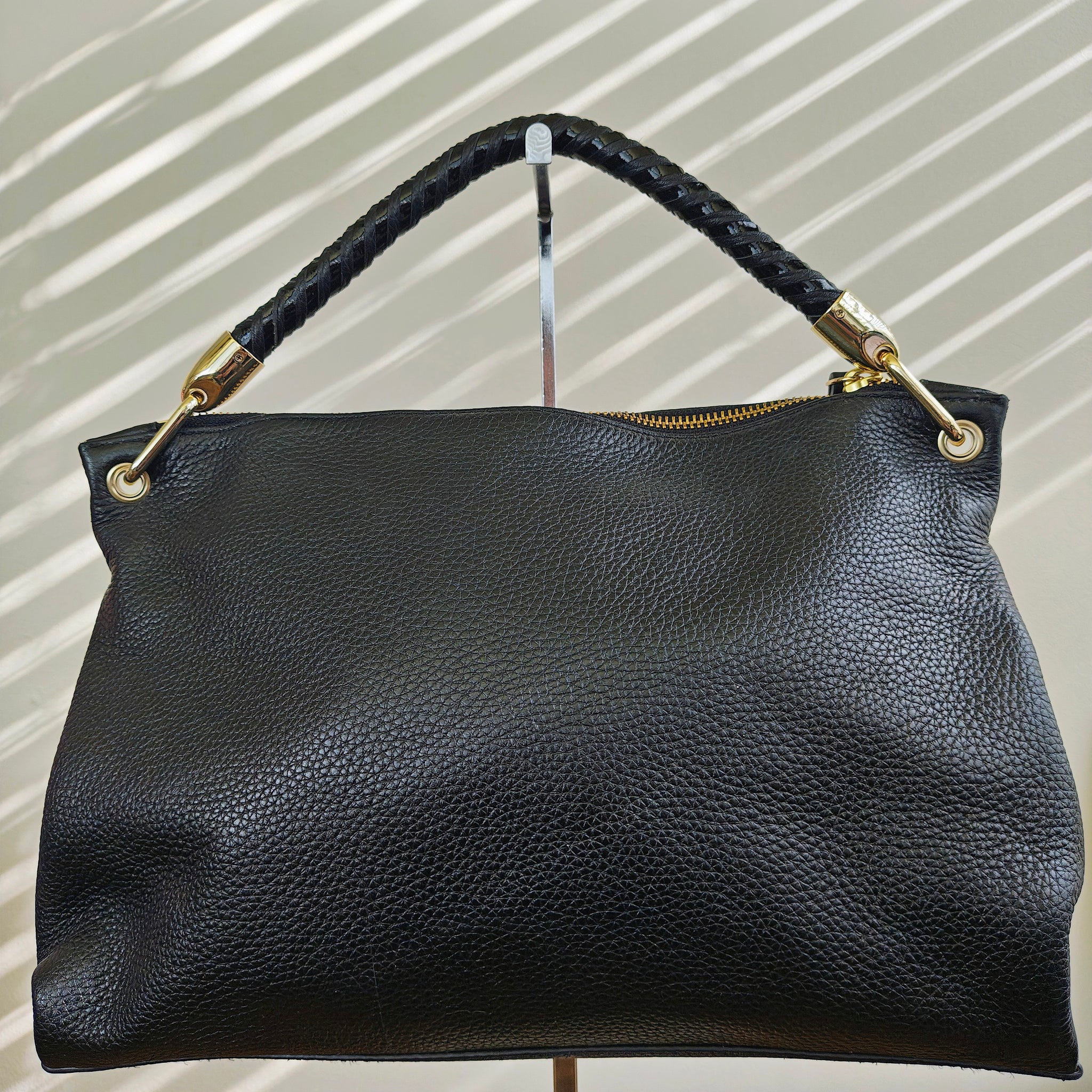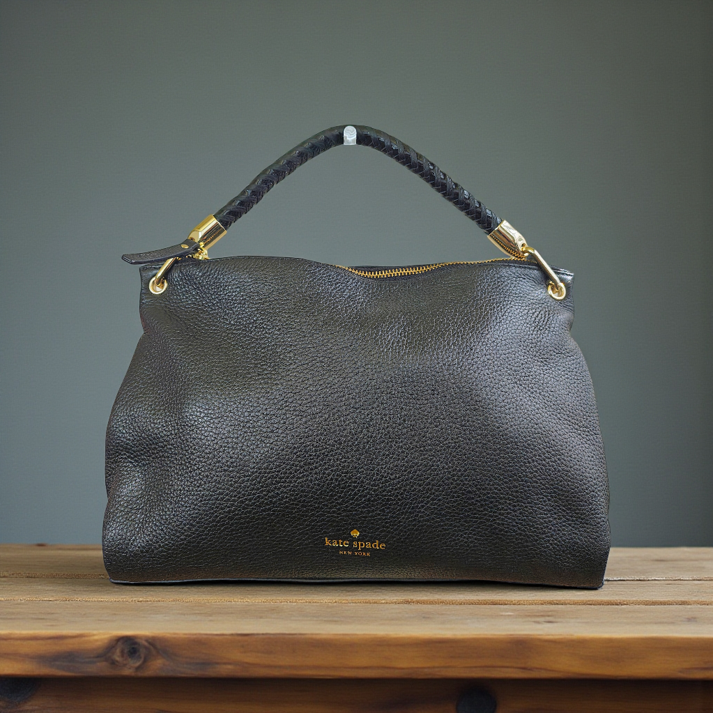 Kate Spade Gorgeous Pebble Leather Slouchy Convertible Hobo Bag. It is made of black pebbled leather and features gold-tone hardware and a distinctive braided top handle, and detachable crossbody strap.