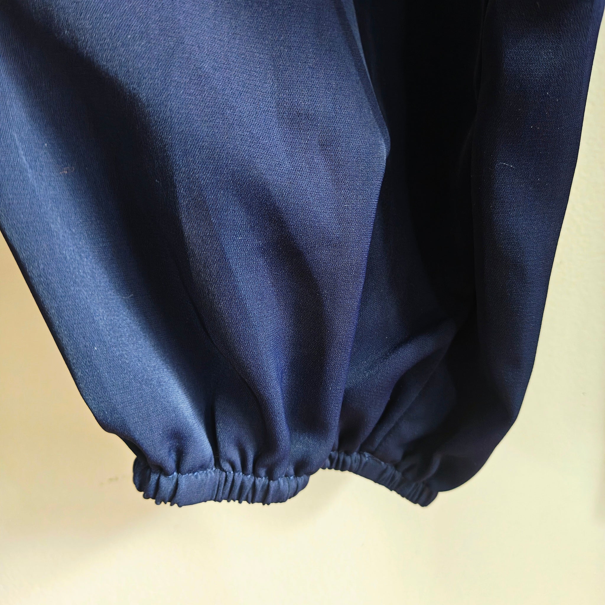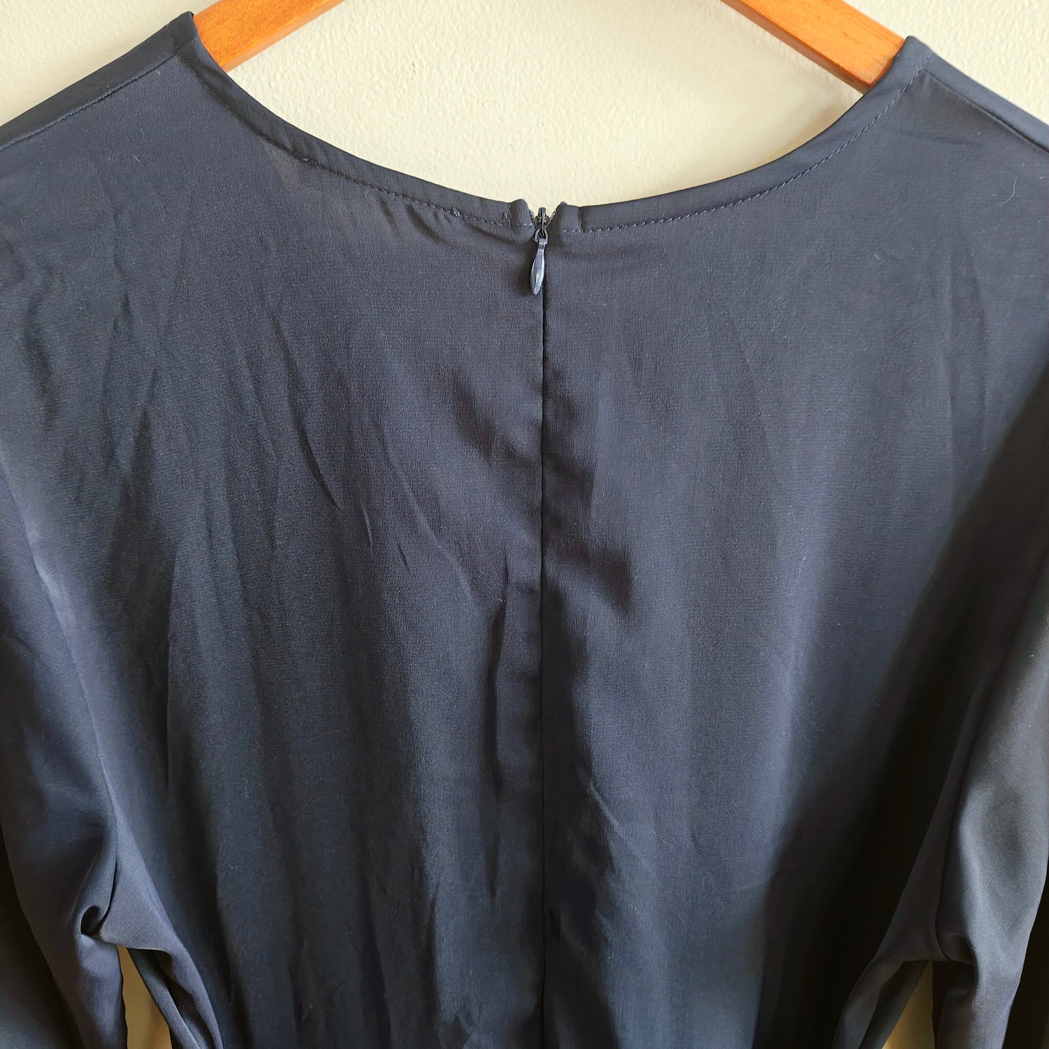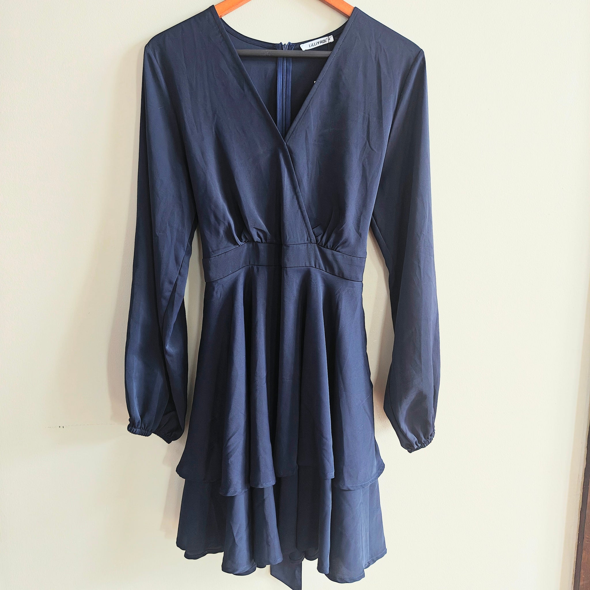 Long-sleeve ruffled mini dress, in a soft polyester fabric blend. It features a deep V-neckline, an empire or gathered waist, long sleeves with elasticated cuffs, and a tiered ruffle skirt.