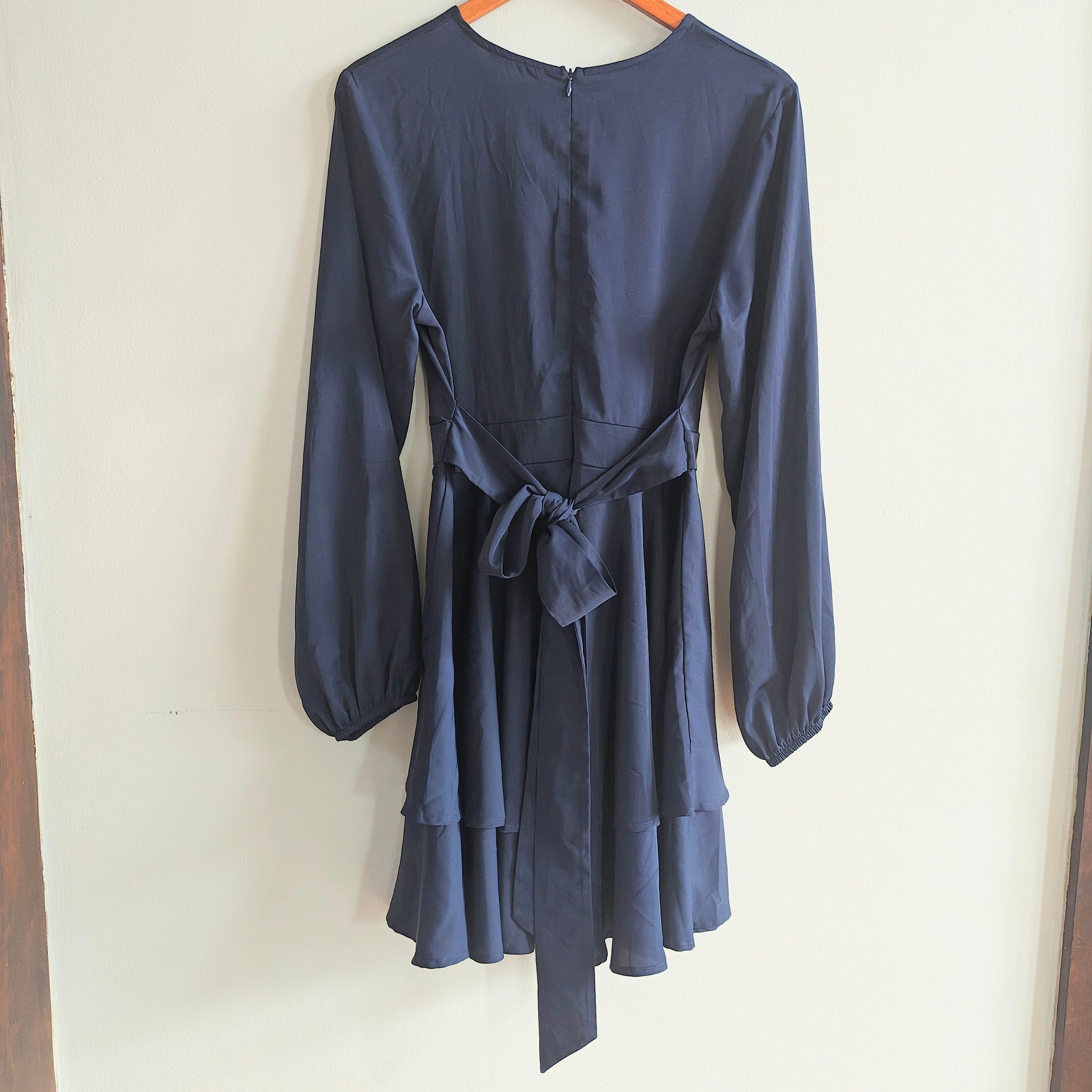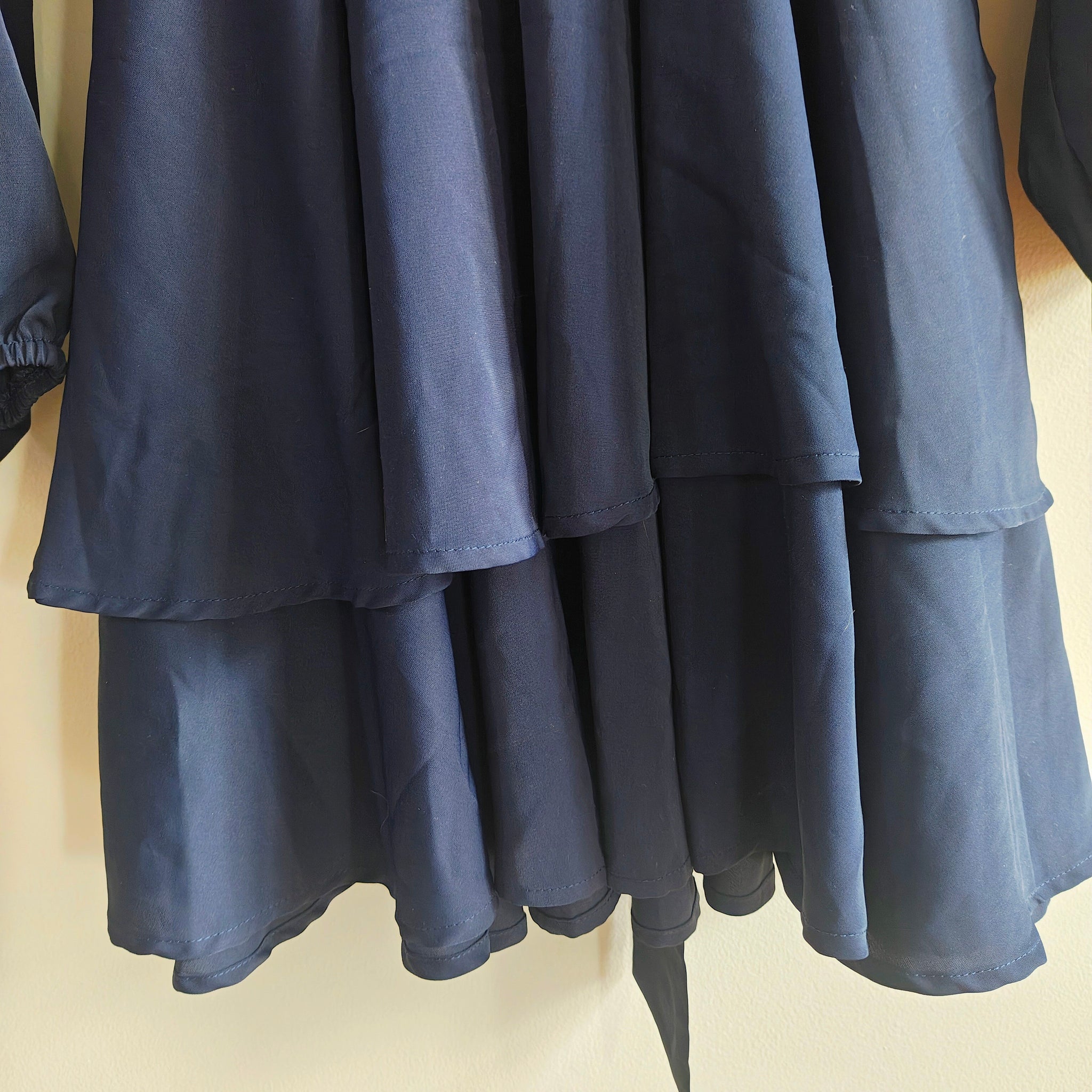 Style: Mini dress, deep V-neck, long sleeves, ruffled tiered skirt, waist tie