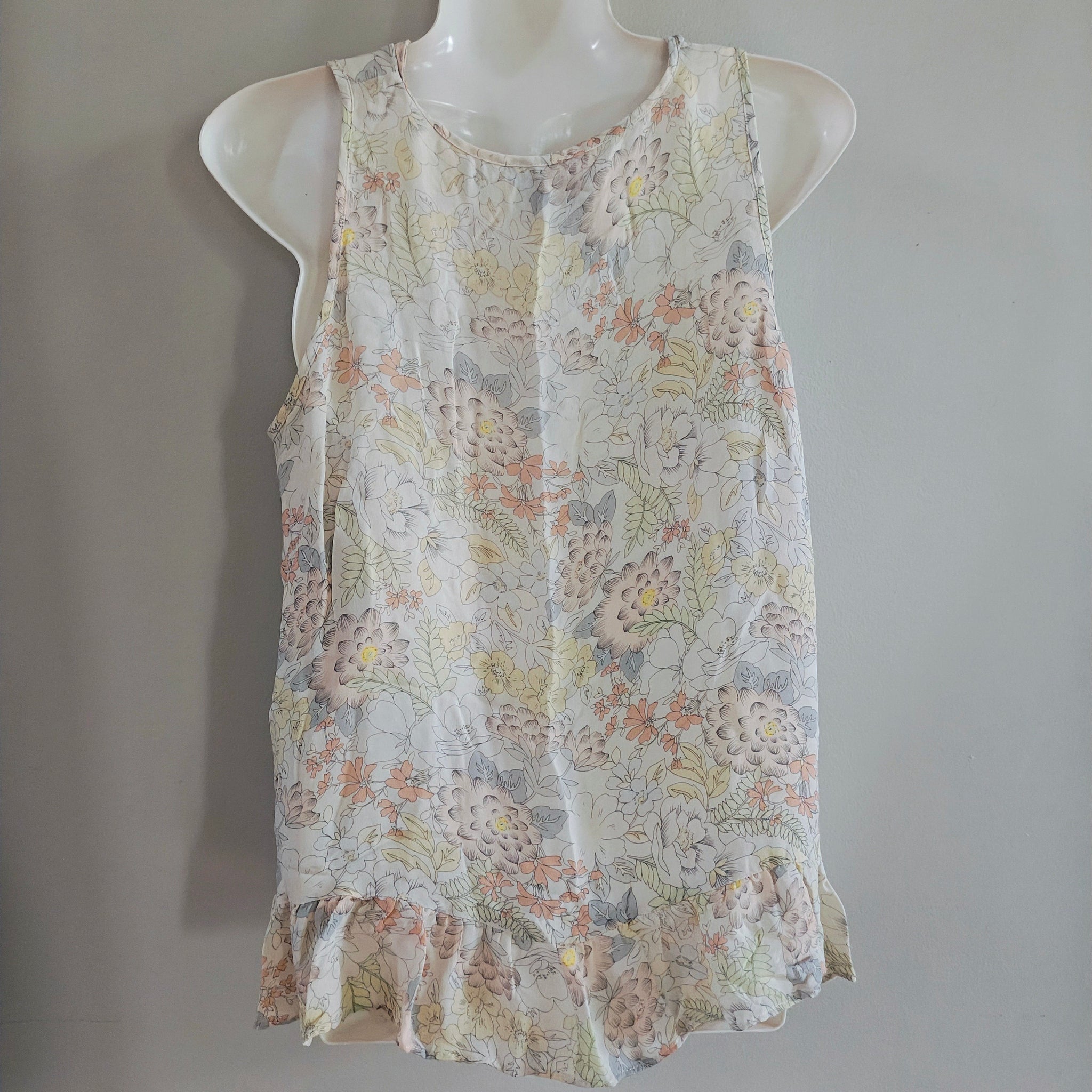 Madison Marcus sleeveless ruffled silk top with a pastel floral or abstract pattern. Madison Marcus is a contemporary women's clothing line known for blending feminine and playful silhouettes, using 100% silk fabric.