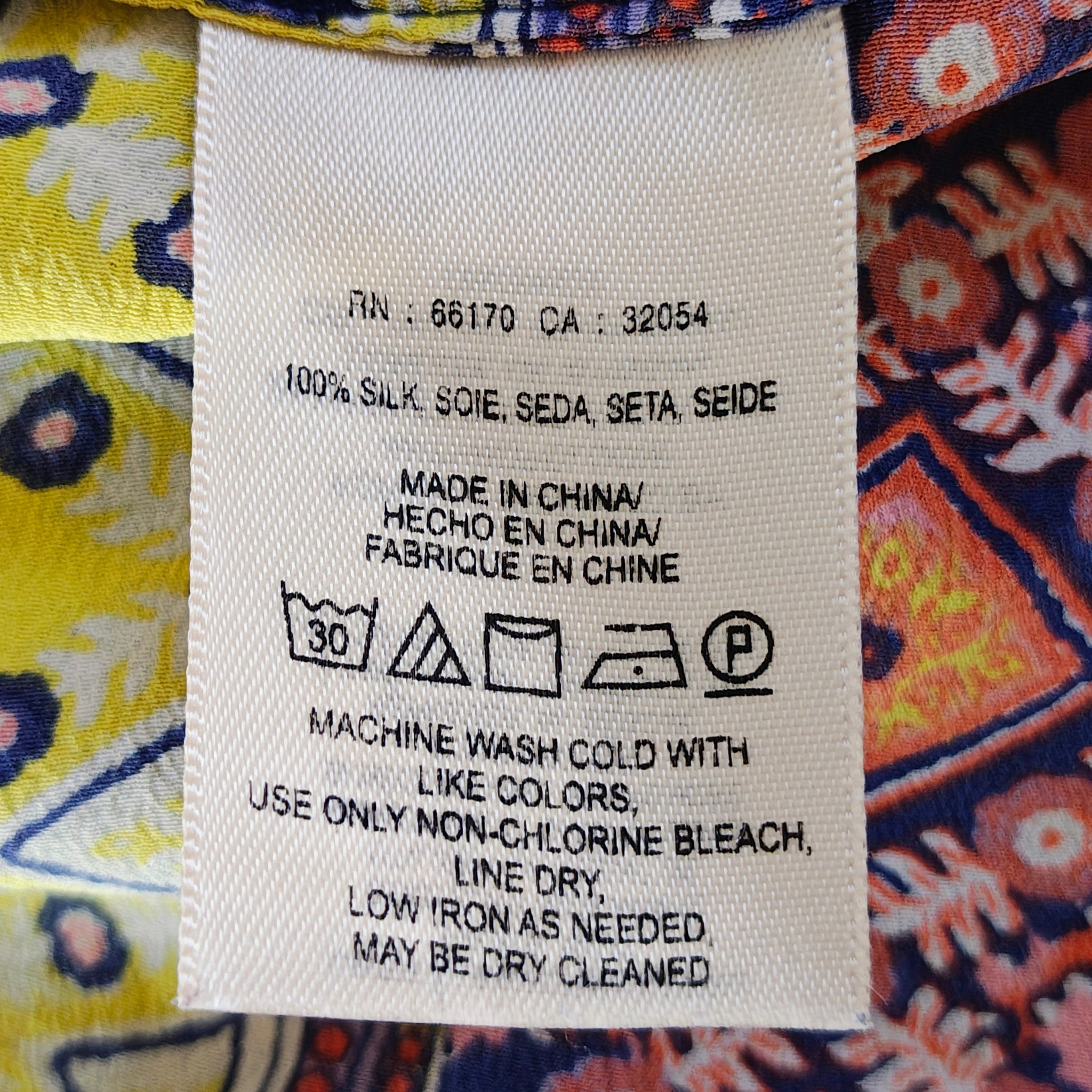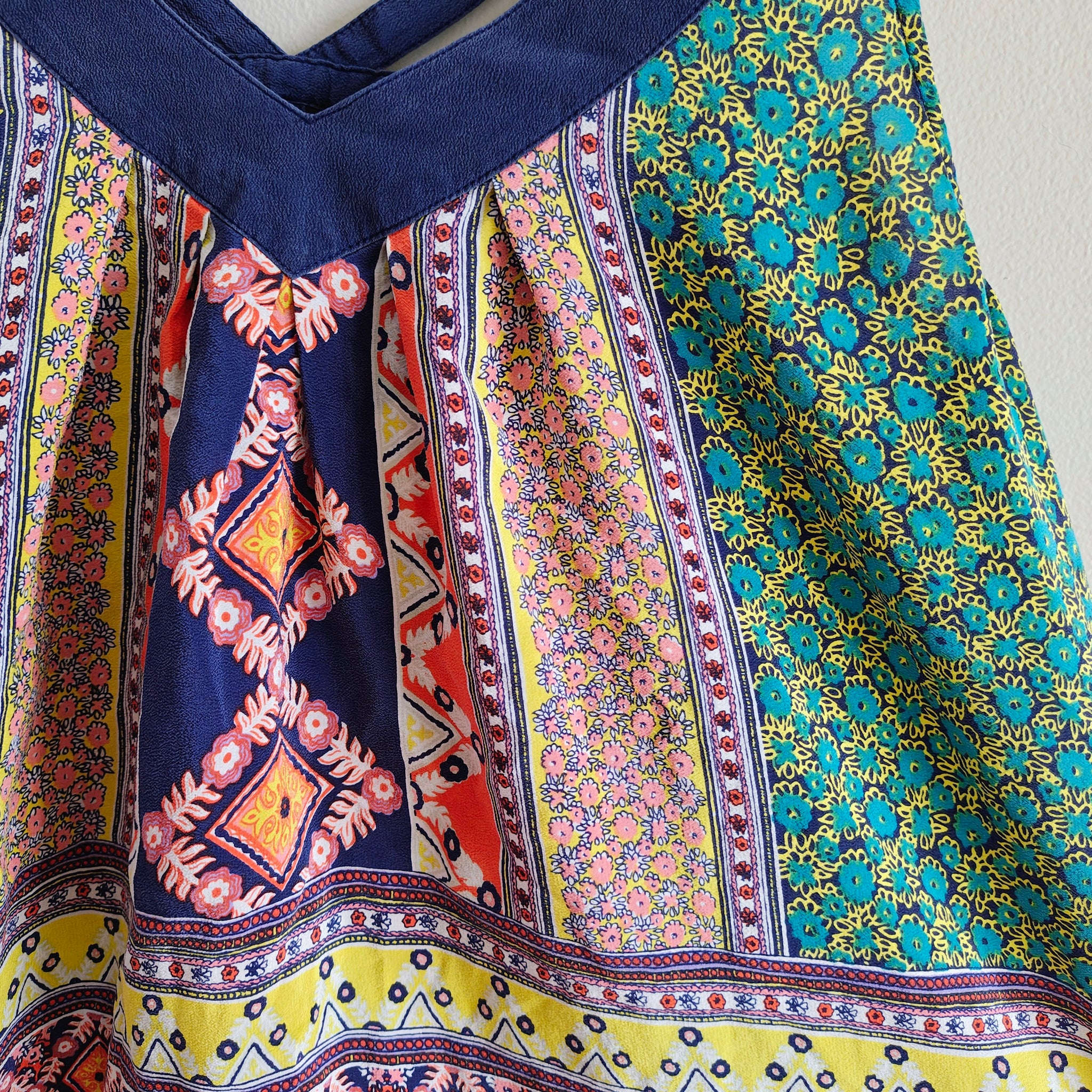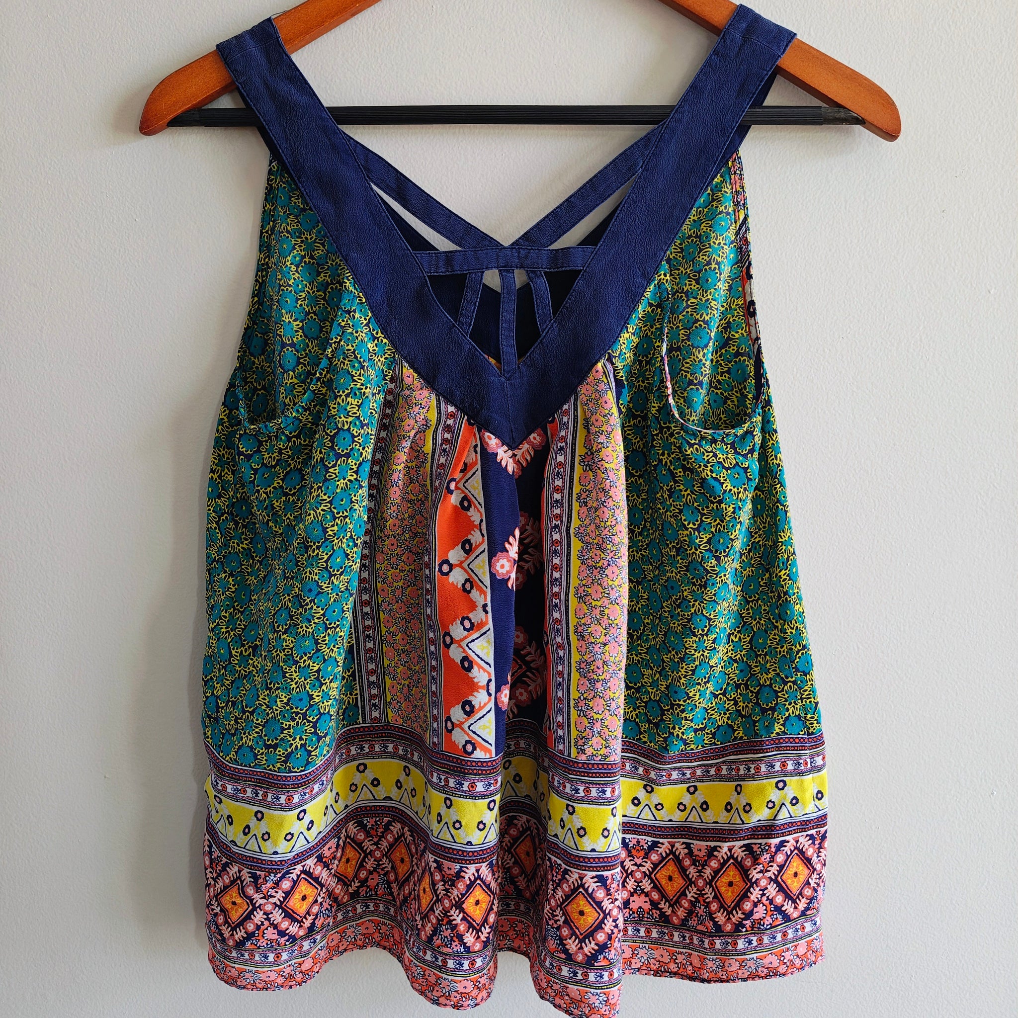 Maeve Sapelo Tank from Anthropologie. This flowy, boho-inspired blouse is known for its vibrant "scarf print" and intricate multi-patterned design featuring various floral and geometric motifs.