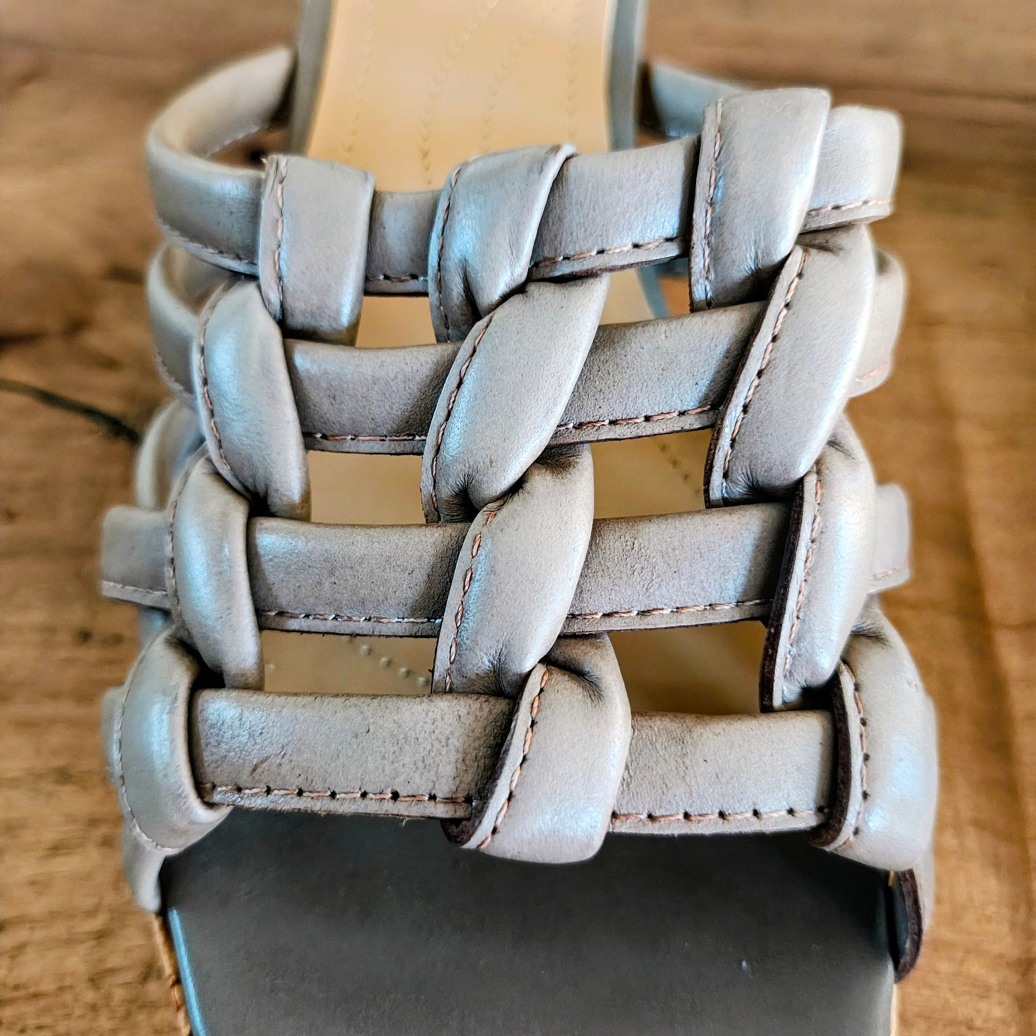 Wedge sandals in Grigio Grey by TAHARI. They feature a slip-on design with a woven leather strap and a cork-wrapped wedge heel.