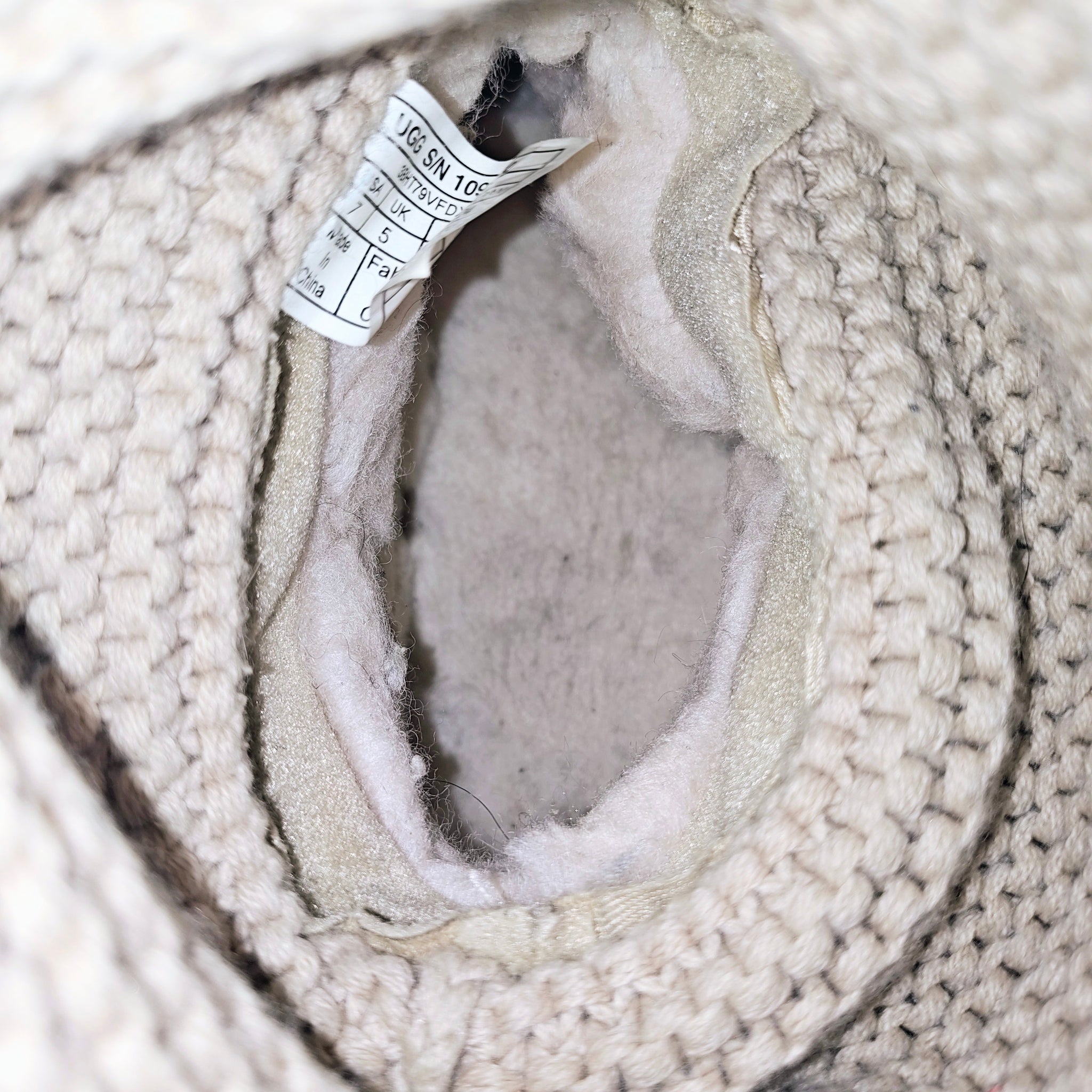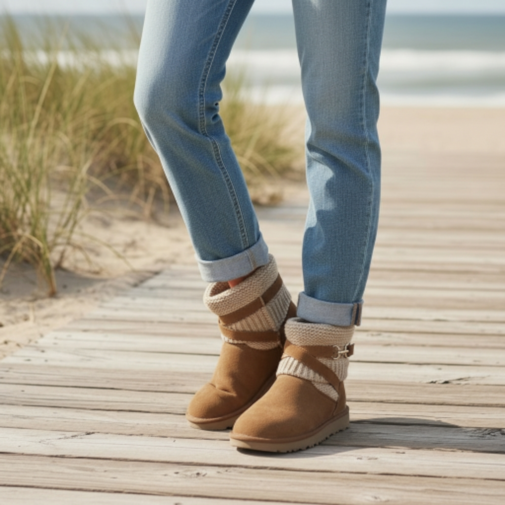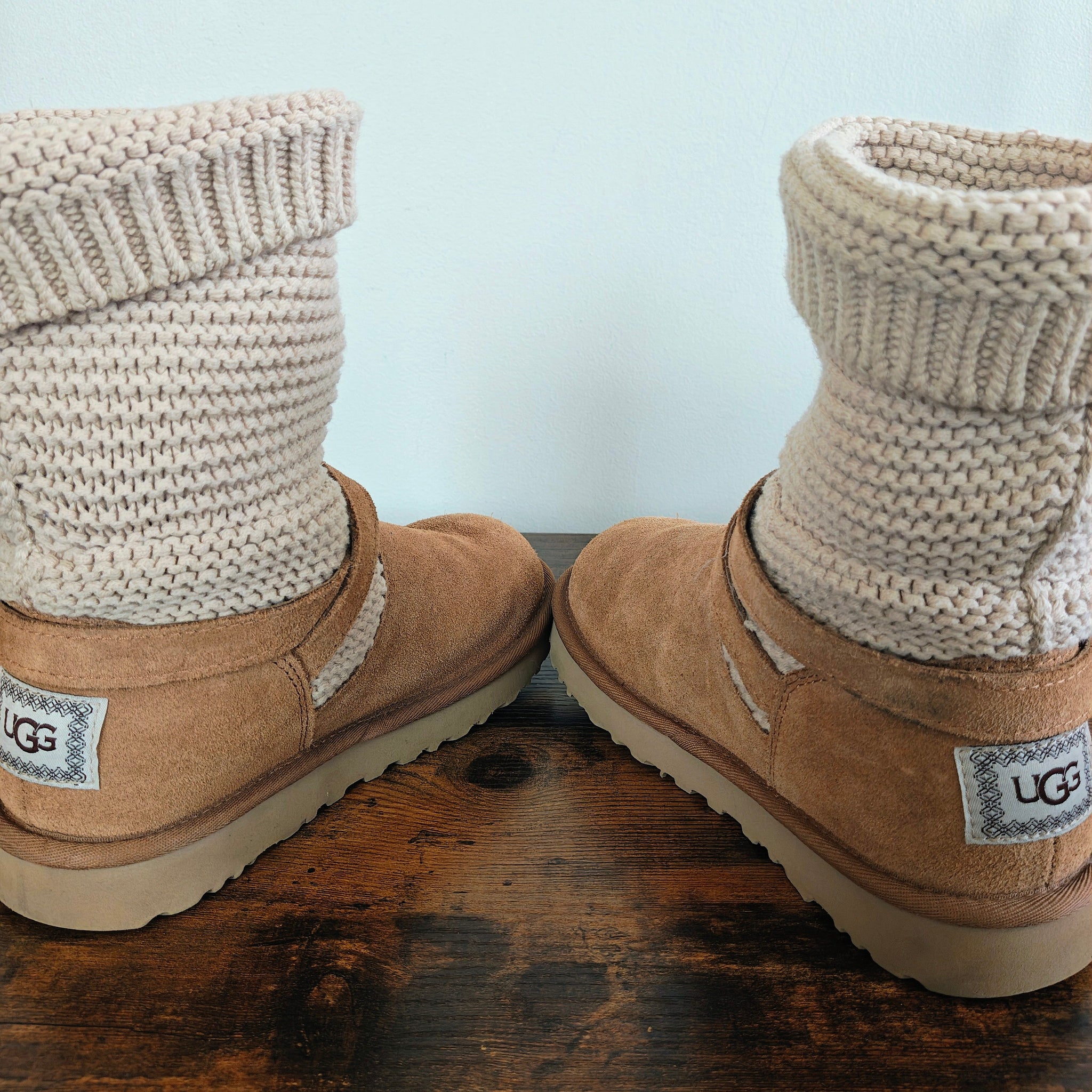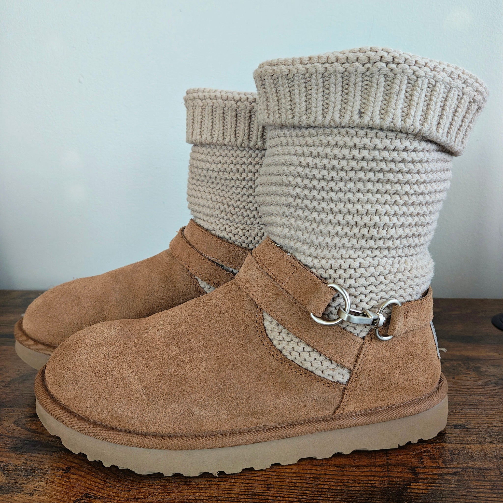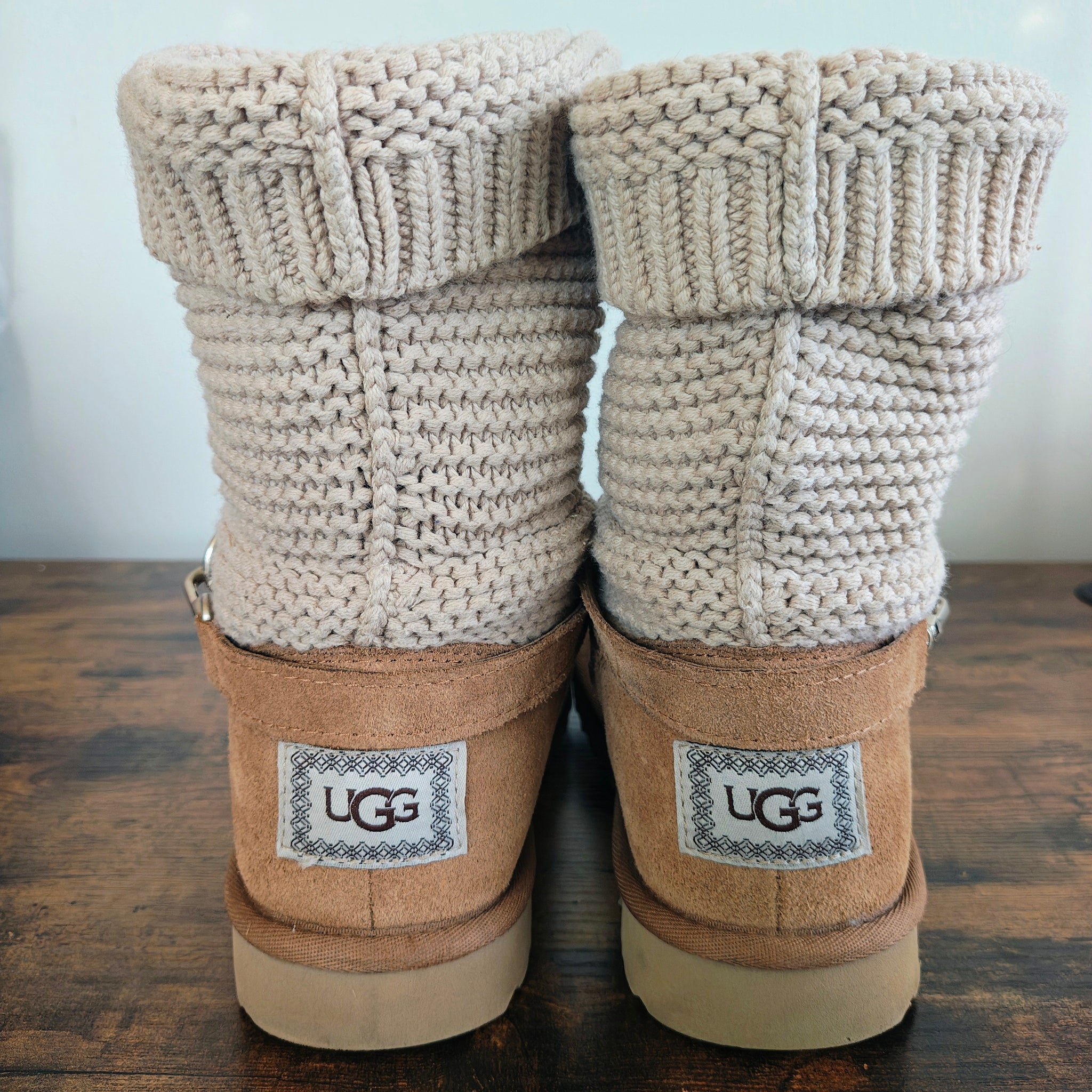 The UGG Purl Strap Boots for women feature a combination of a suede vamp and heel, and a purl-knit shaft (cuff) made from a blend of acrylic and cotton.