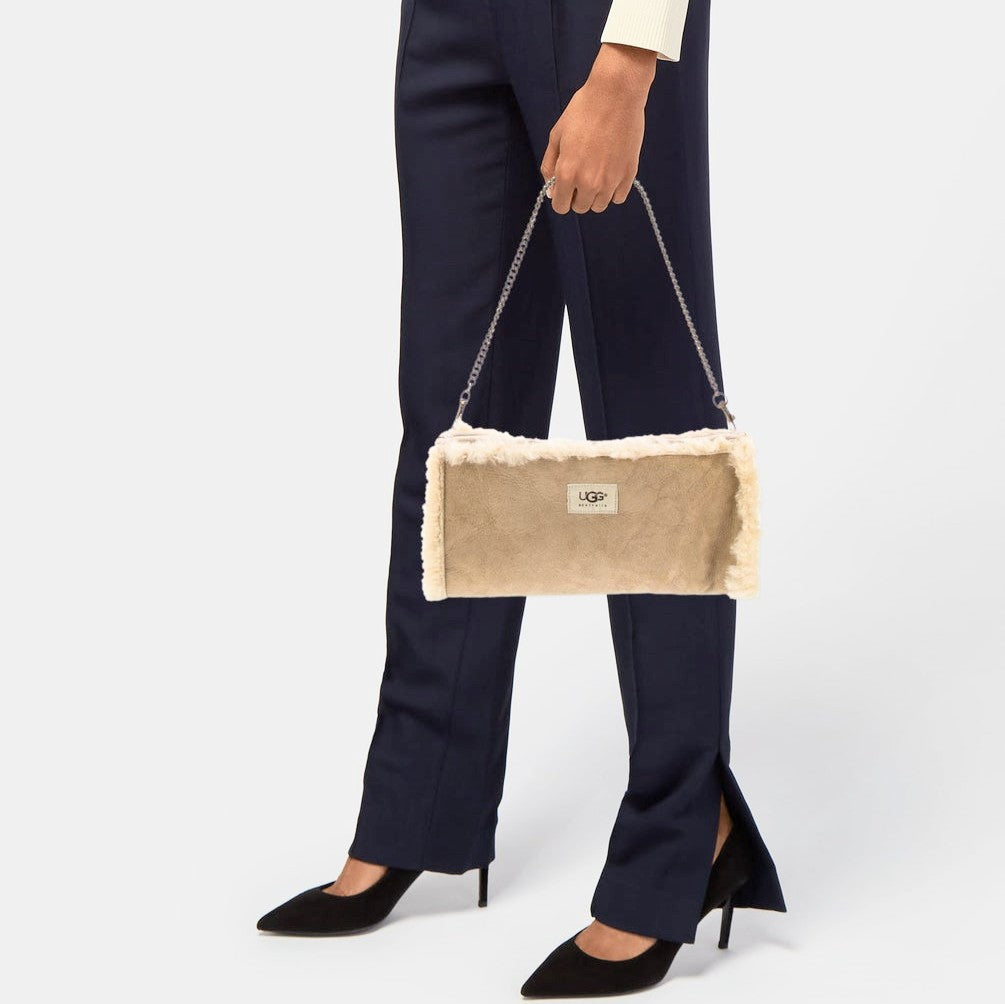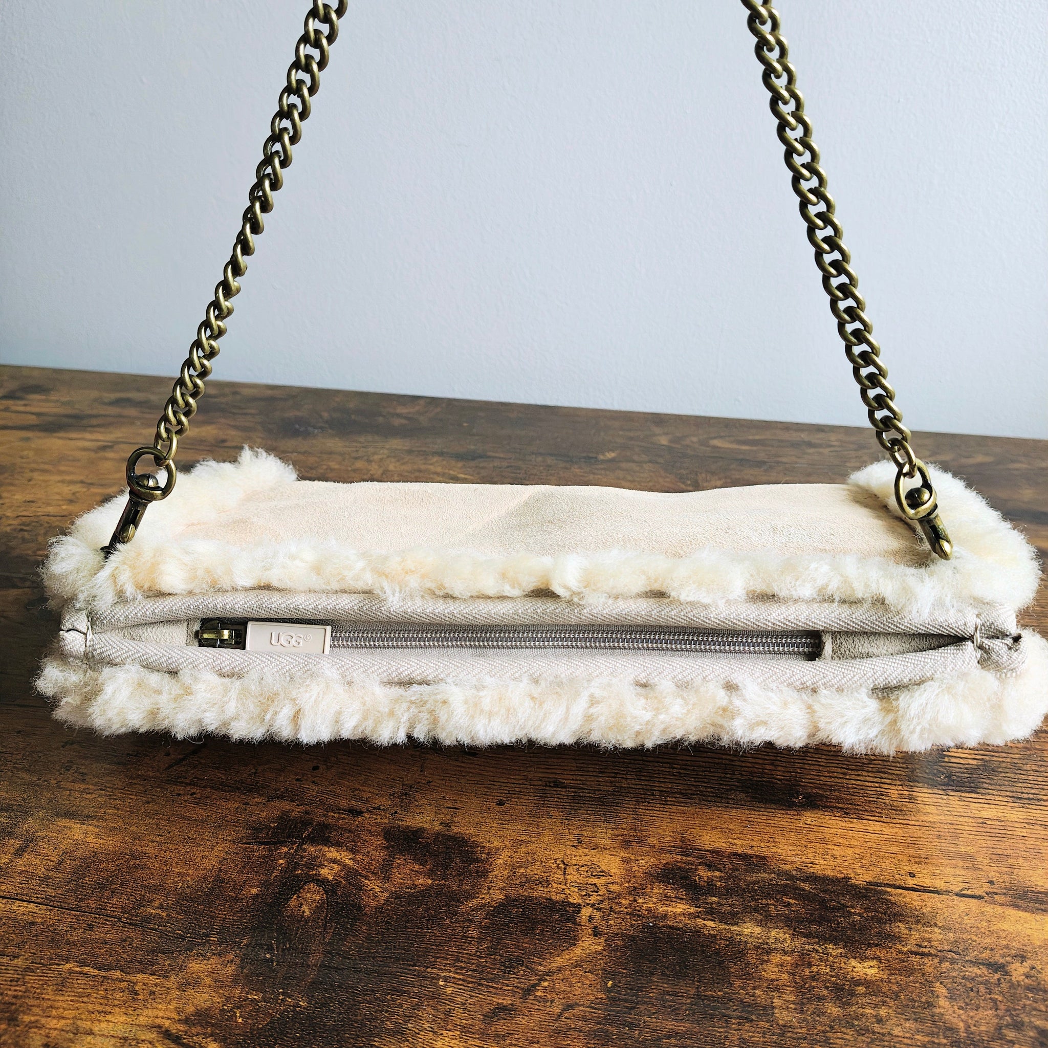 UGG Australia suede and shearling "hand muff" purse with a chain strap. This distinctive style features an opening on the side that allows it to function as a hand warmer in addition to a shoulder bag or clutch.