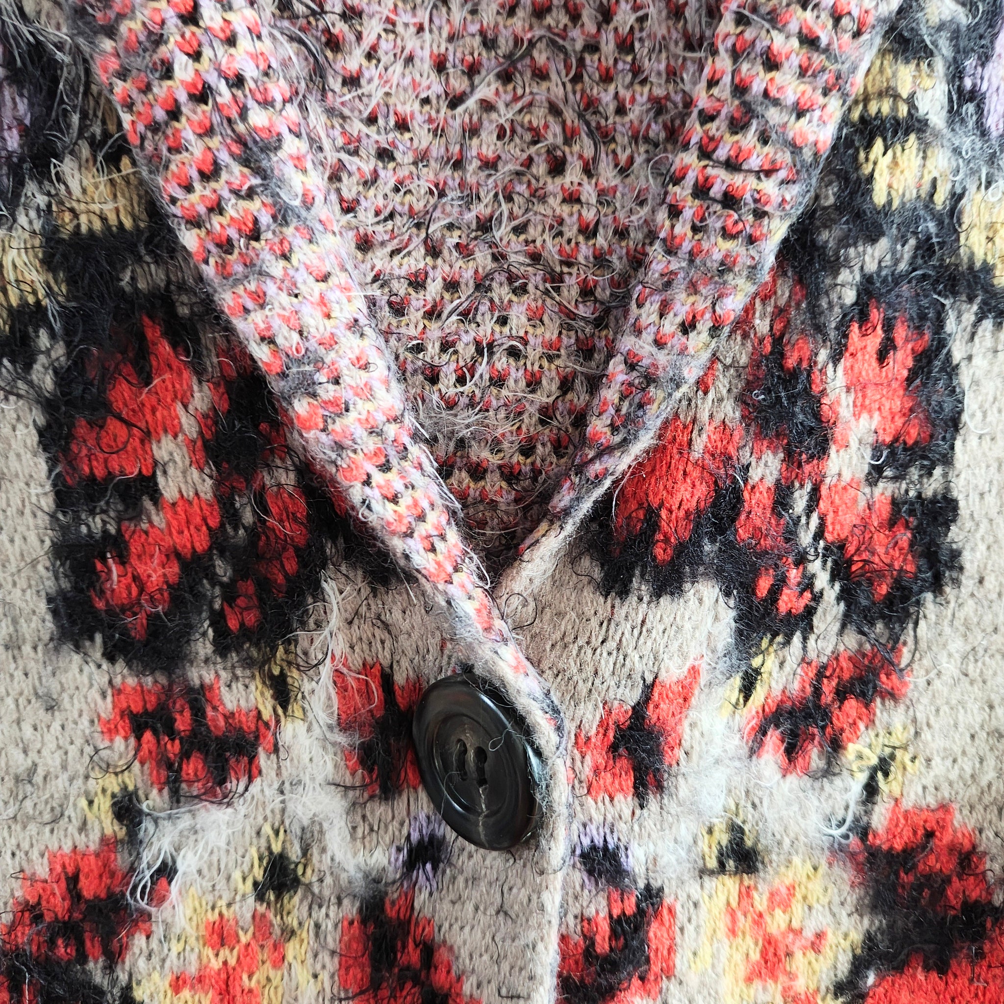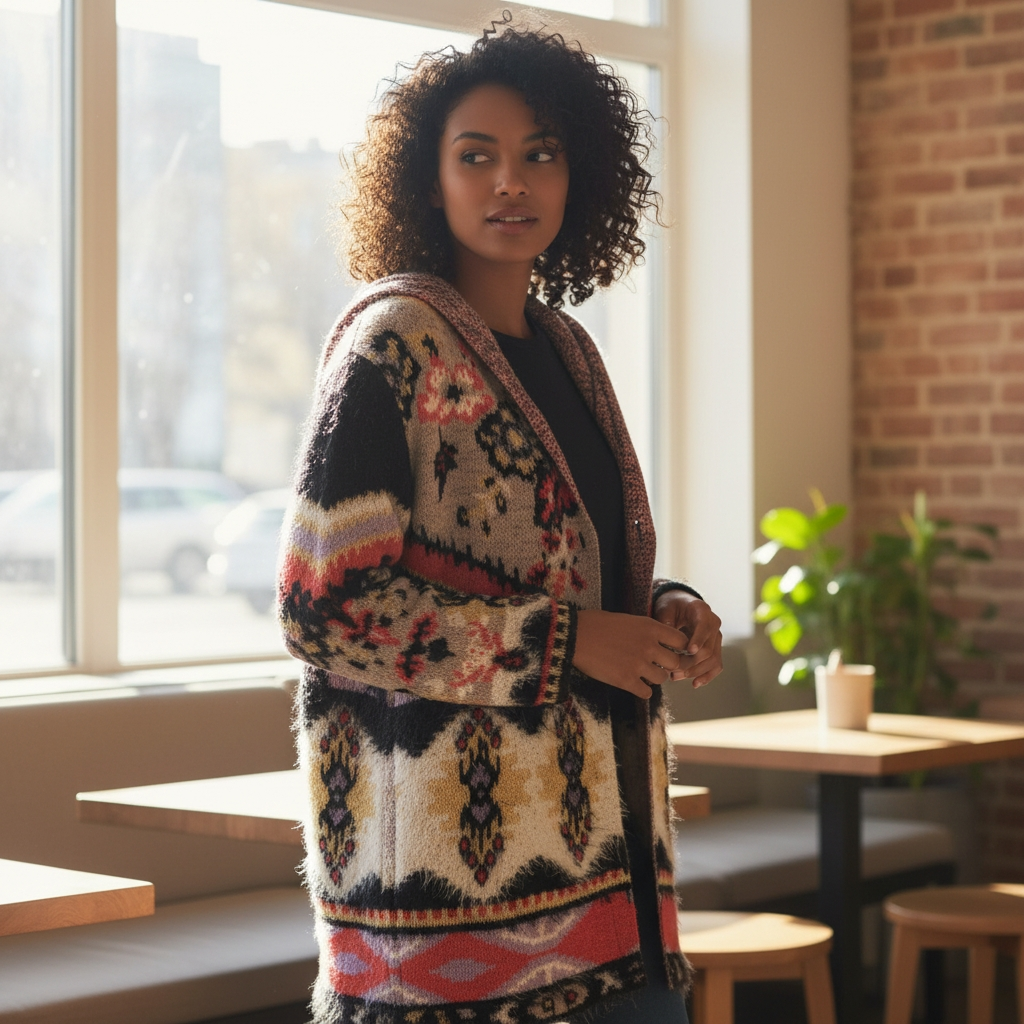 Style: Hooded cardigan, open front with one button, "Boho" or "Aztec" design