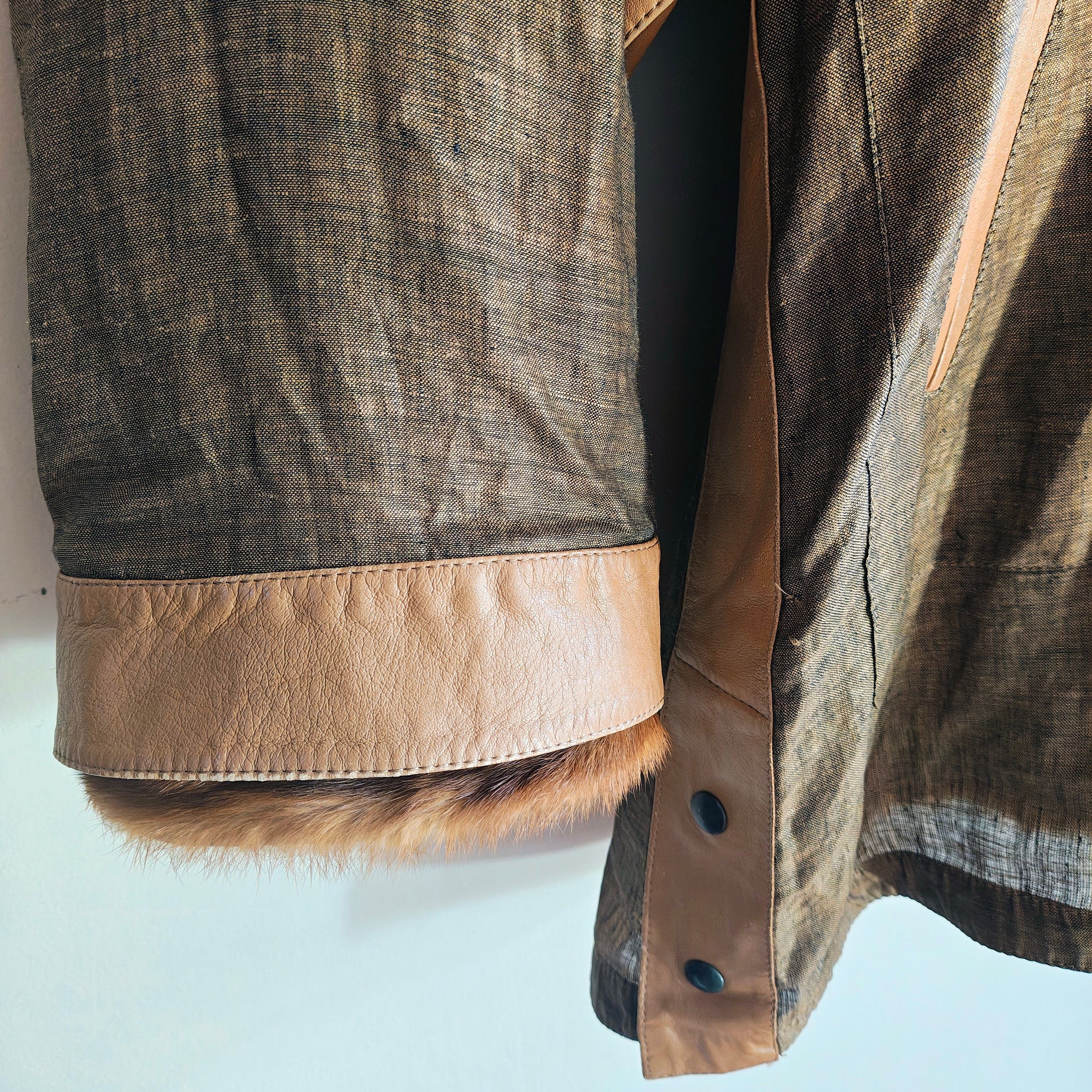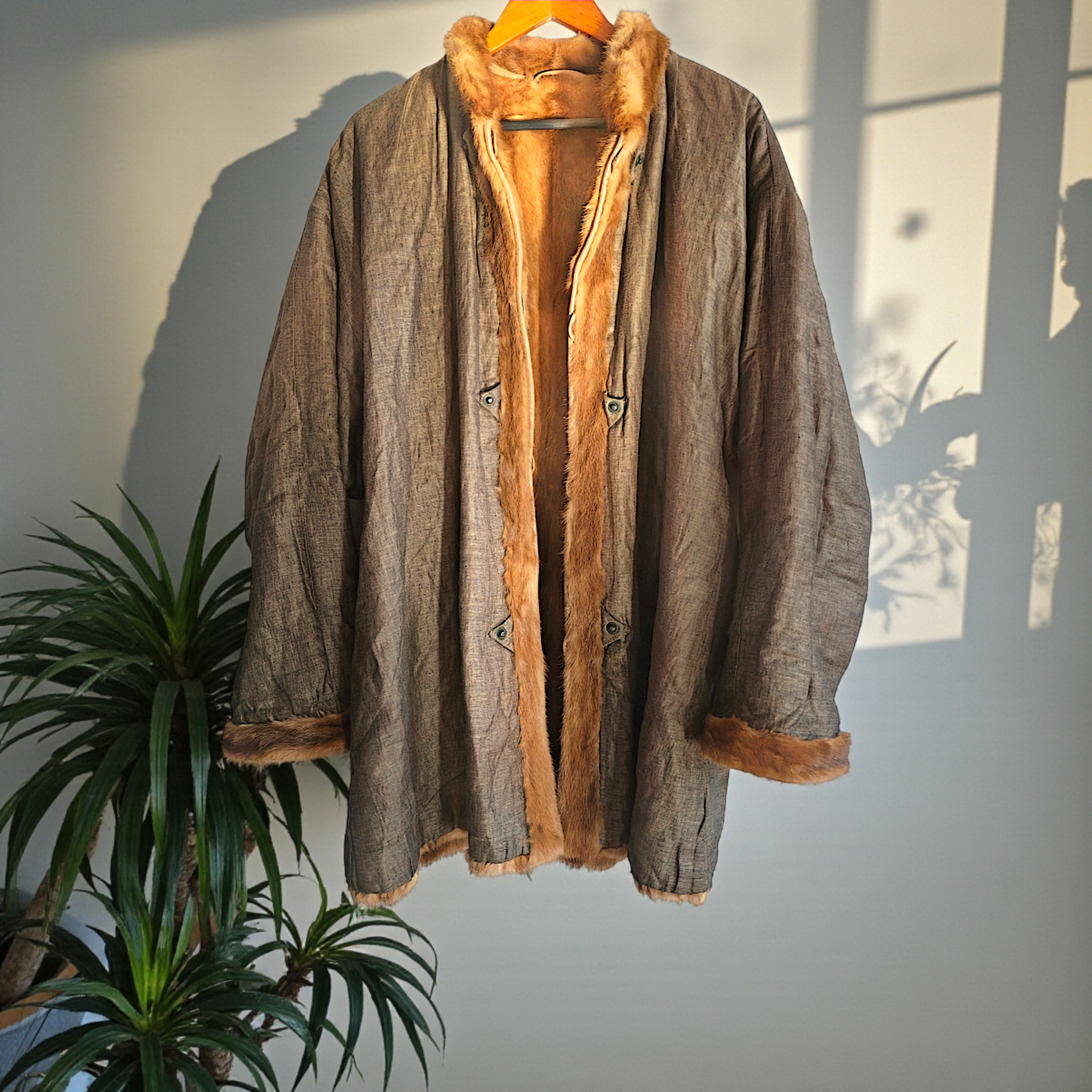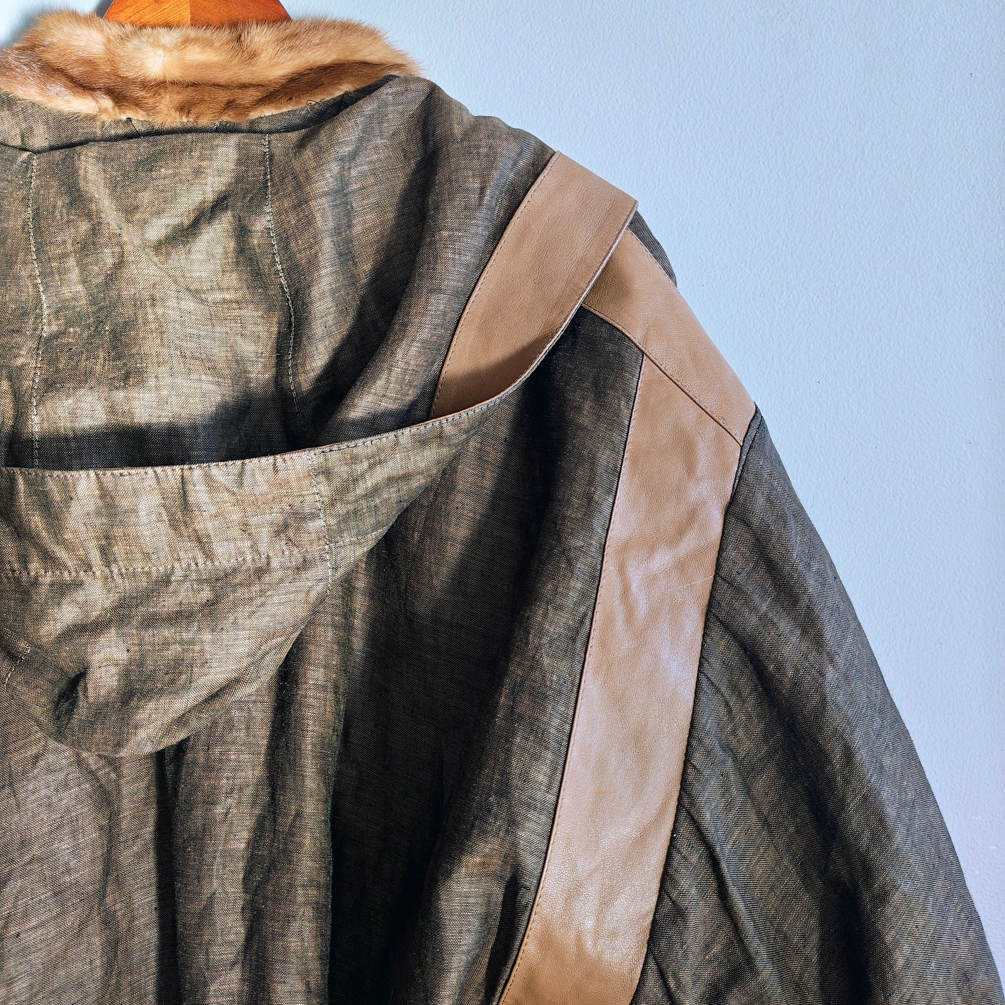 Shell is a fabric blend with leather trim, hood, and pockets which snaps on. Exterior of the coat itself is the same fabric blend with exposed fur trim. It has leather loops for closure but no buttons or hooks, making it open front only. It is reversible to a soft, beautiful fur with leather pipe trim and slit pockets