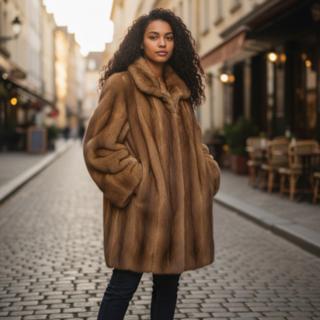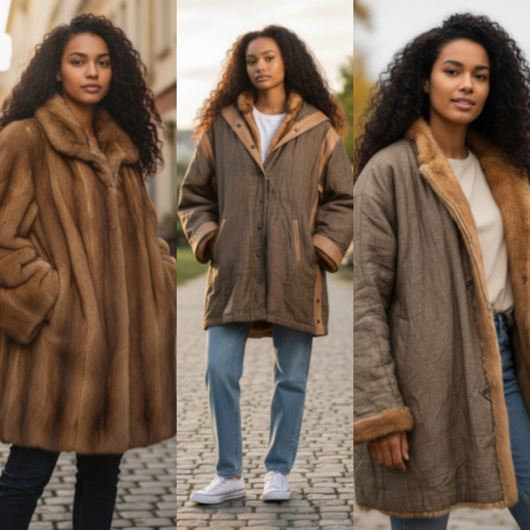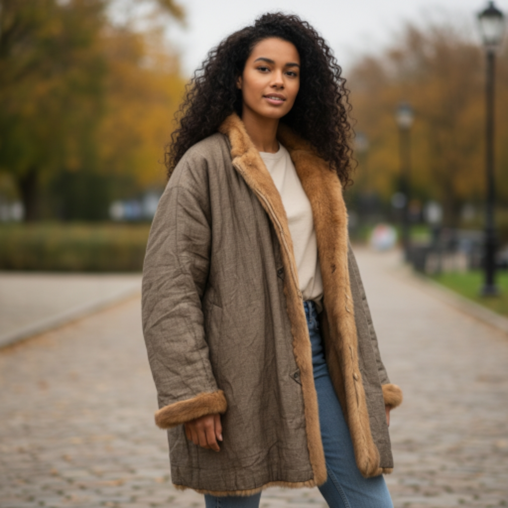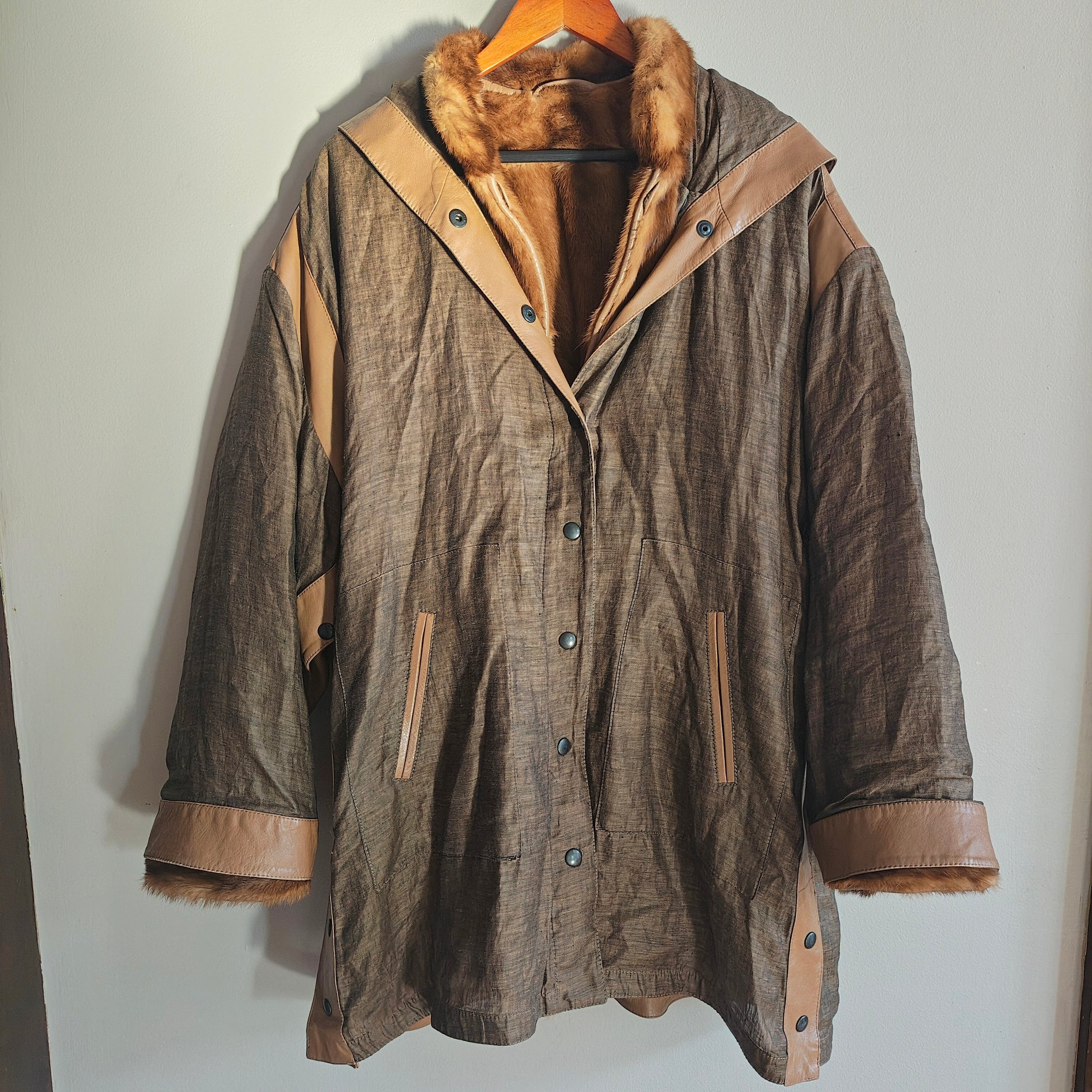 Reversible Design: The garment can be worn with the brown textured fabric side out (as shown) or the lighter, softer, fur side out. When fur is inside shell can be snapped on.