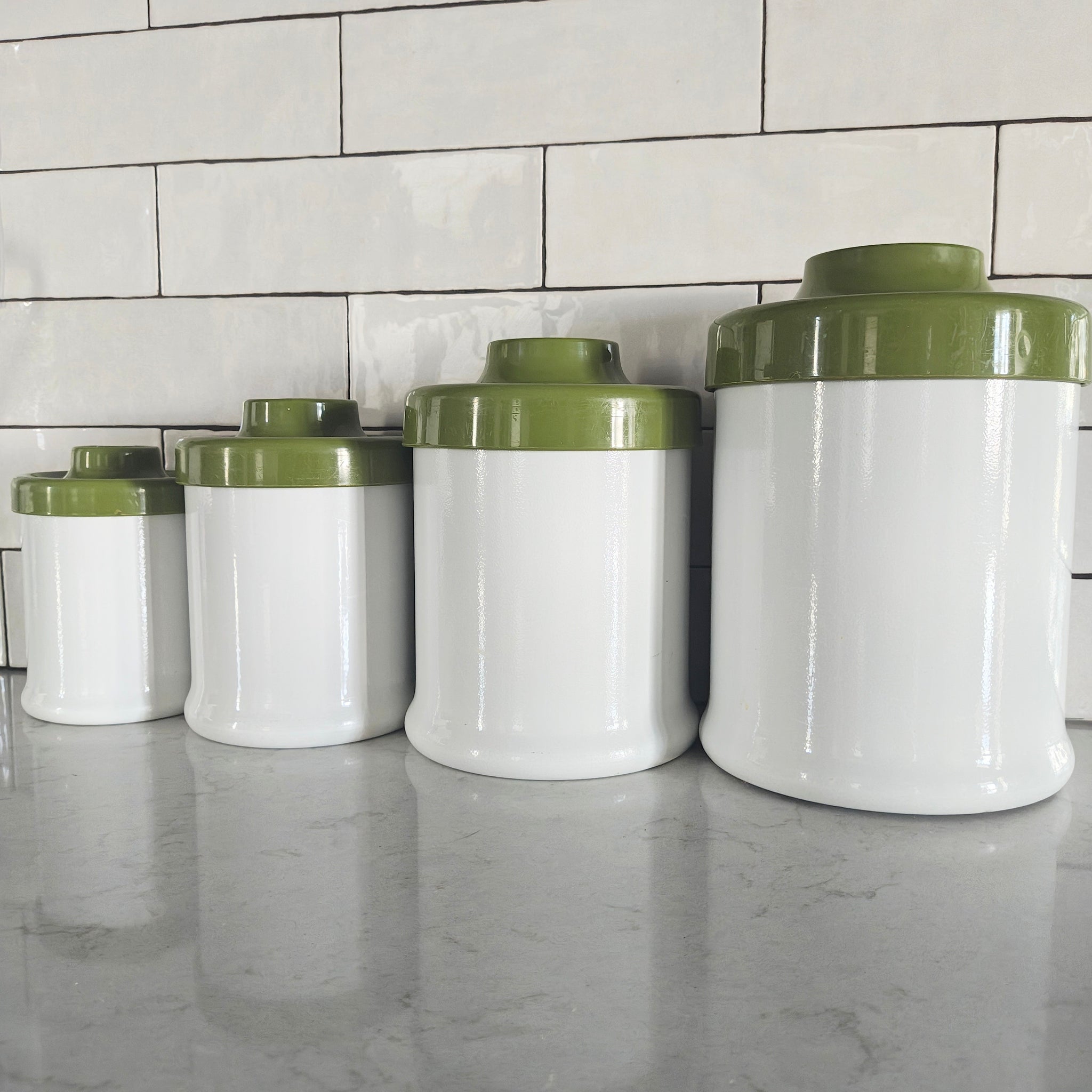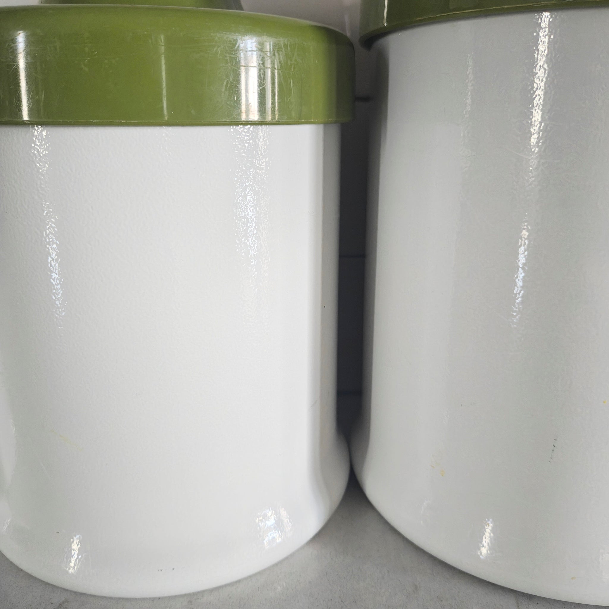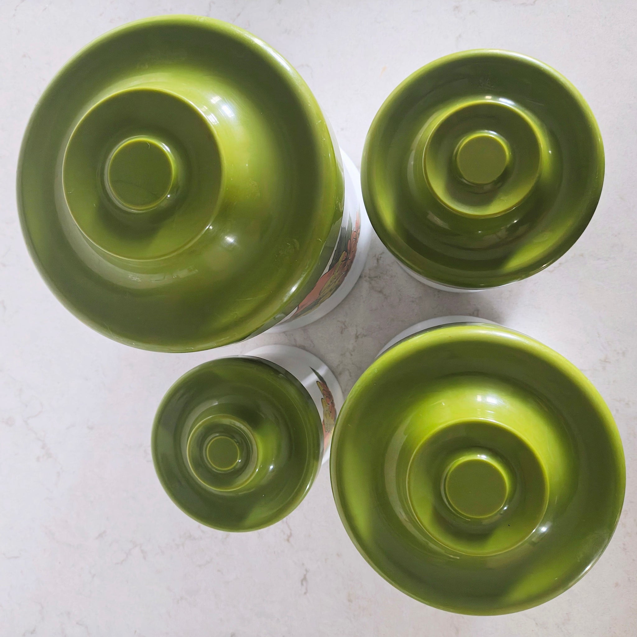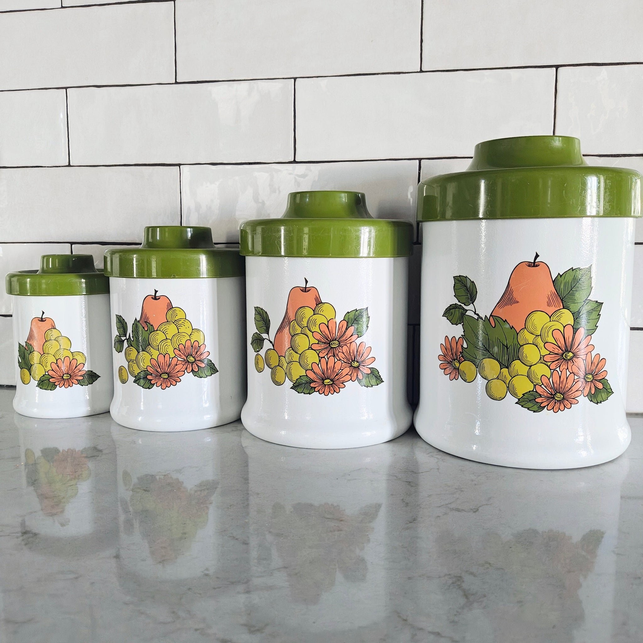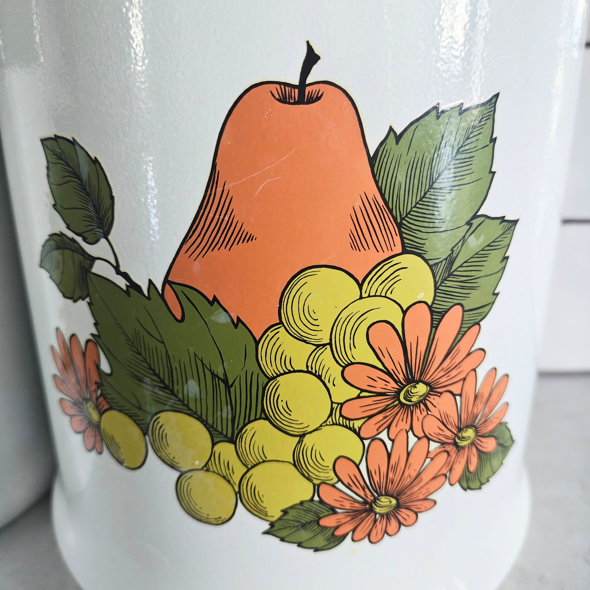 Vintage 1970s aluminum nesting canisters, often referred to as a "fruit" or "harvest" pattern set, typically manufactured by companies like Atapco but manufacturer is not marked on these.