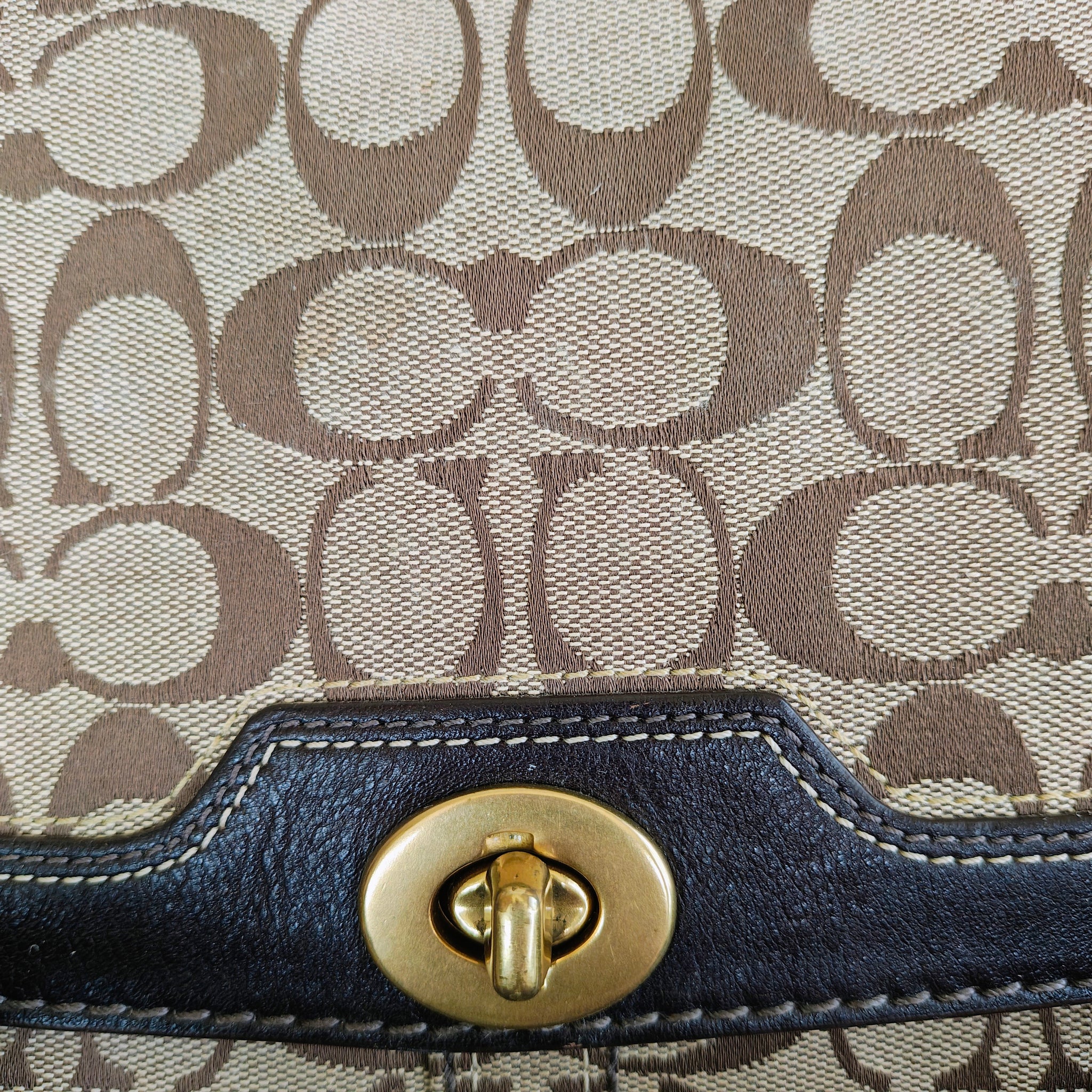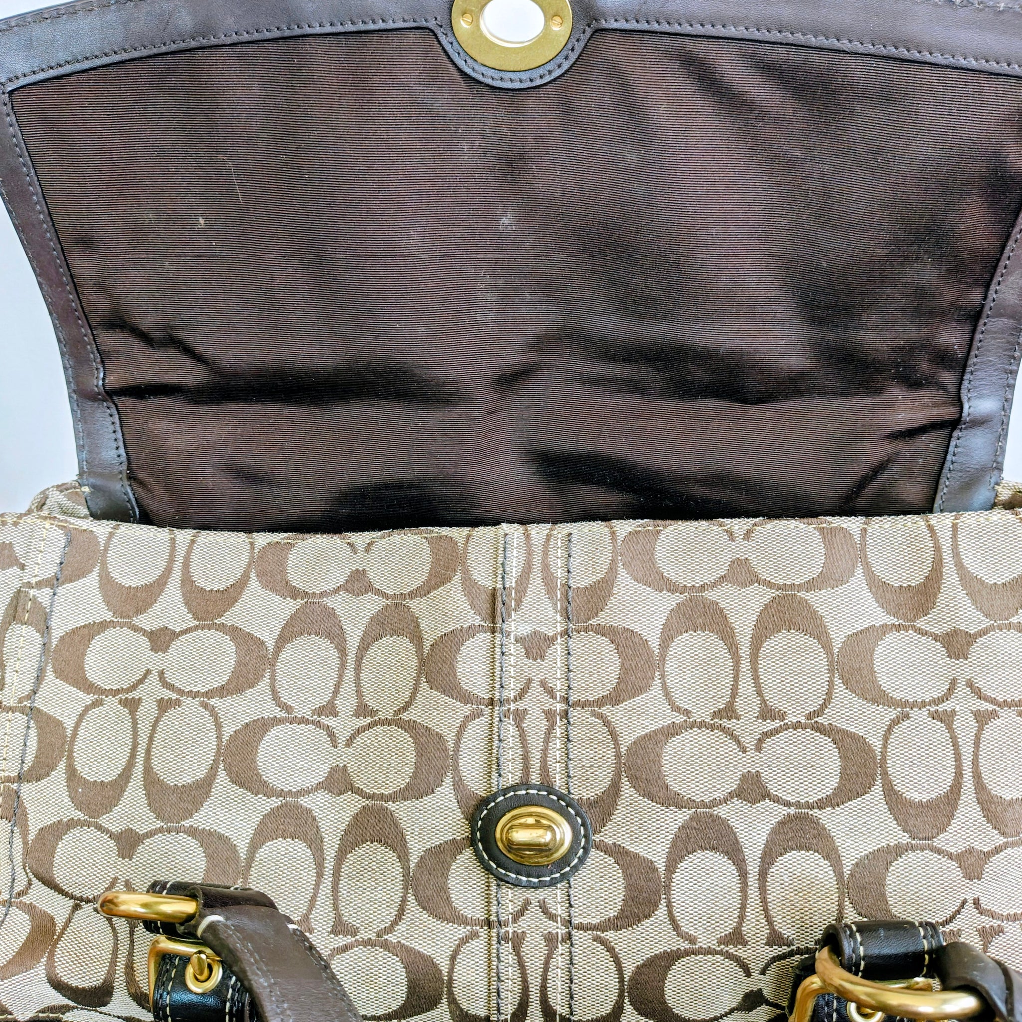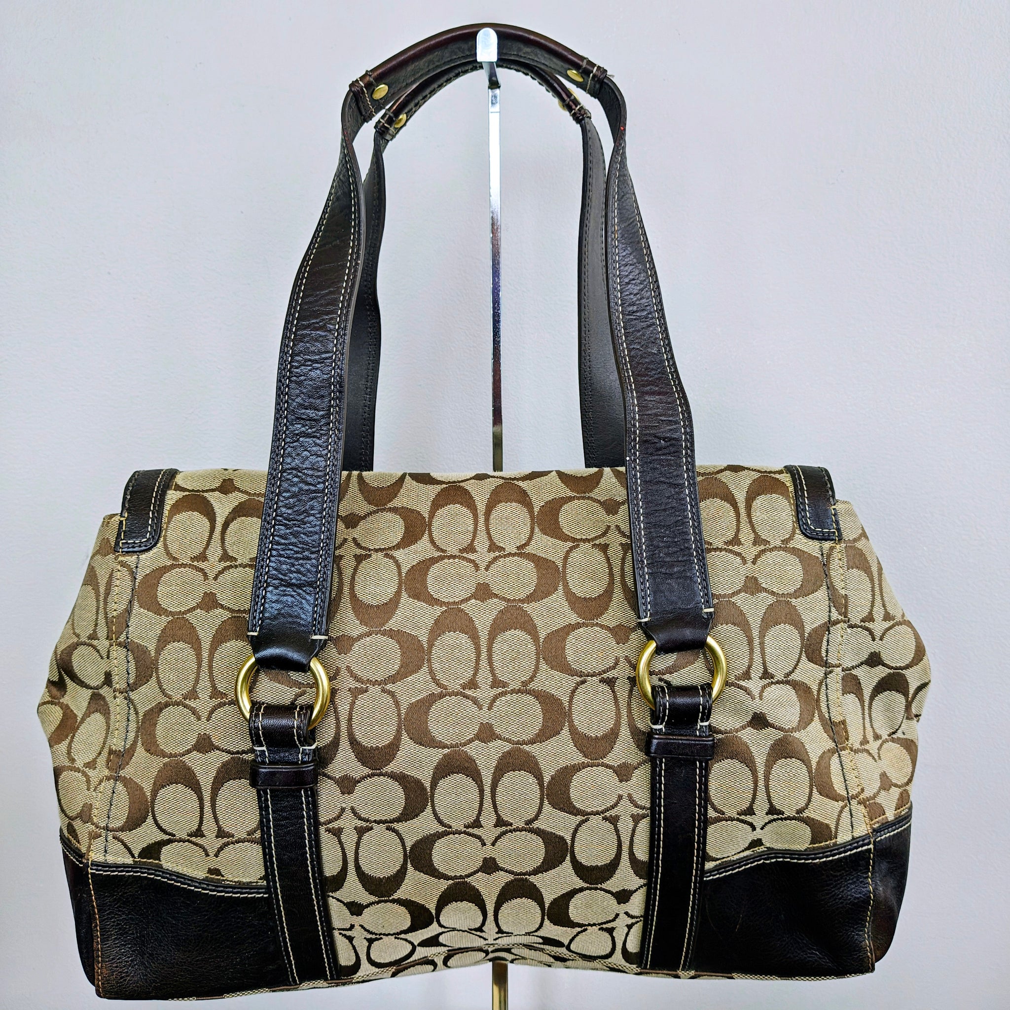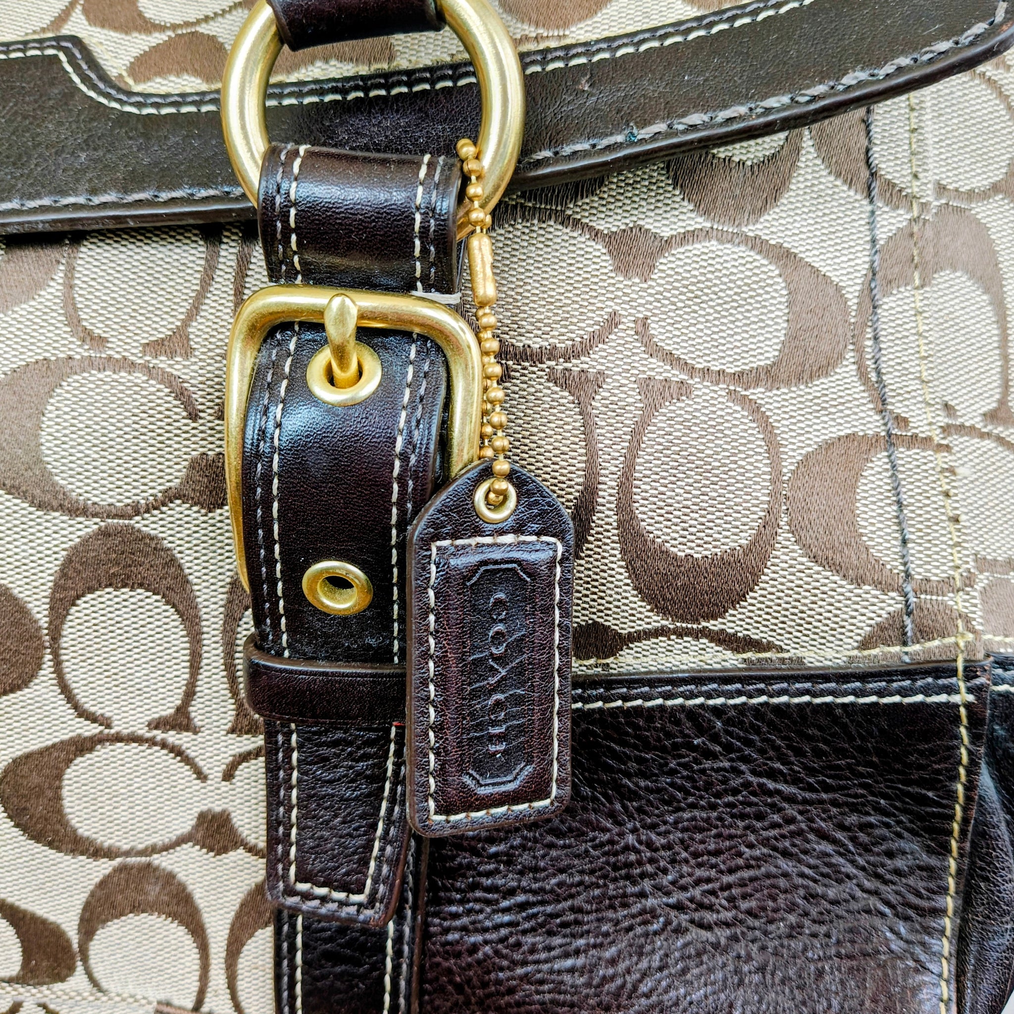 The handbag is a vintage Coach Signature Hampton Flap Satchel, a popular style from the early to mid-2000s.