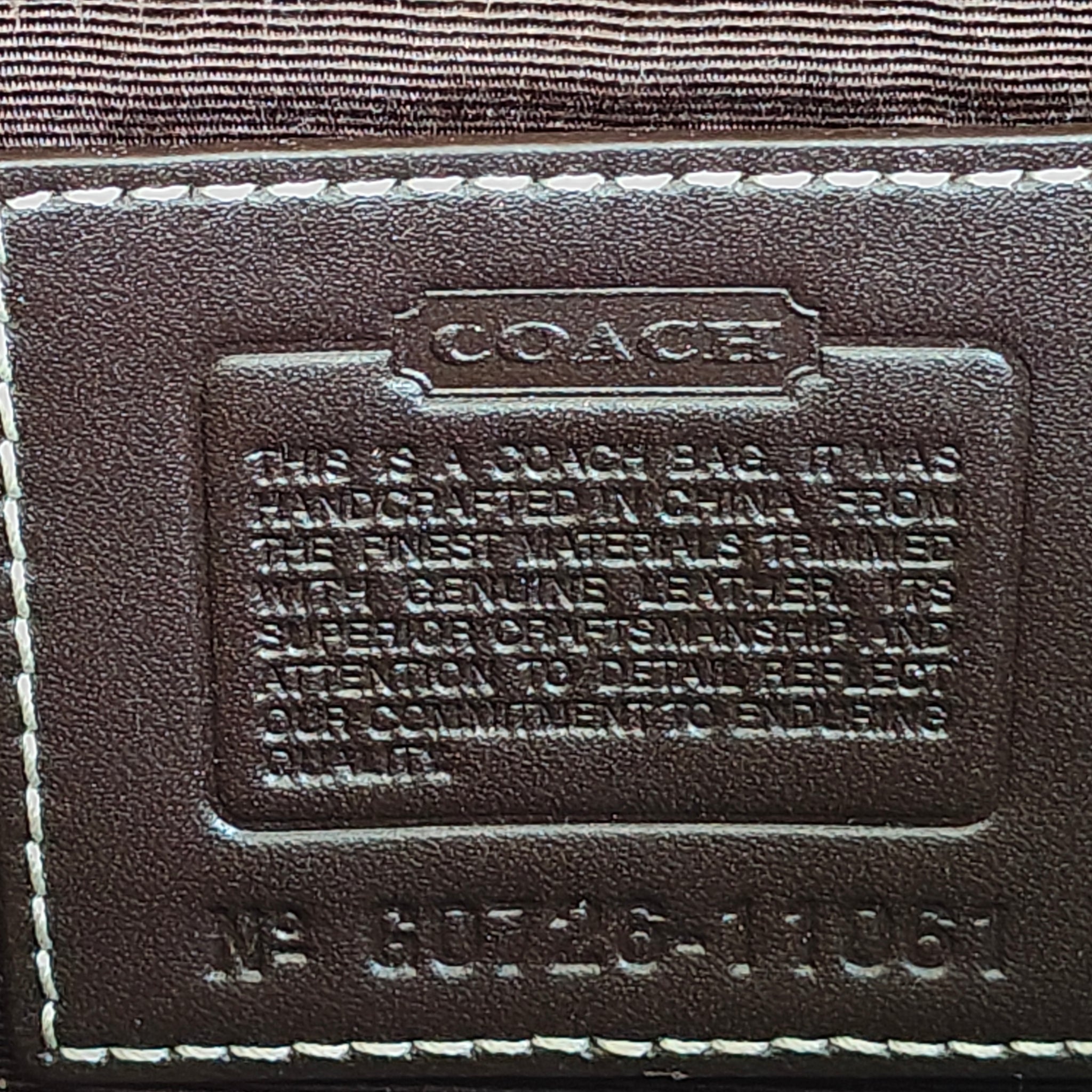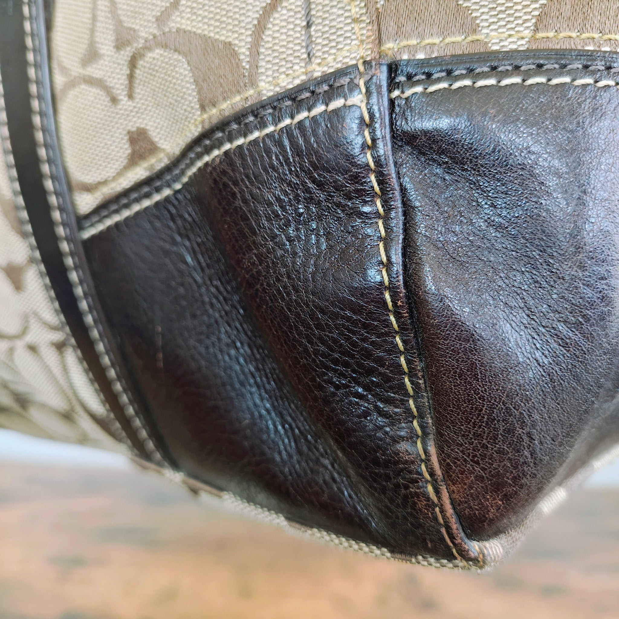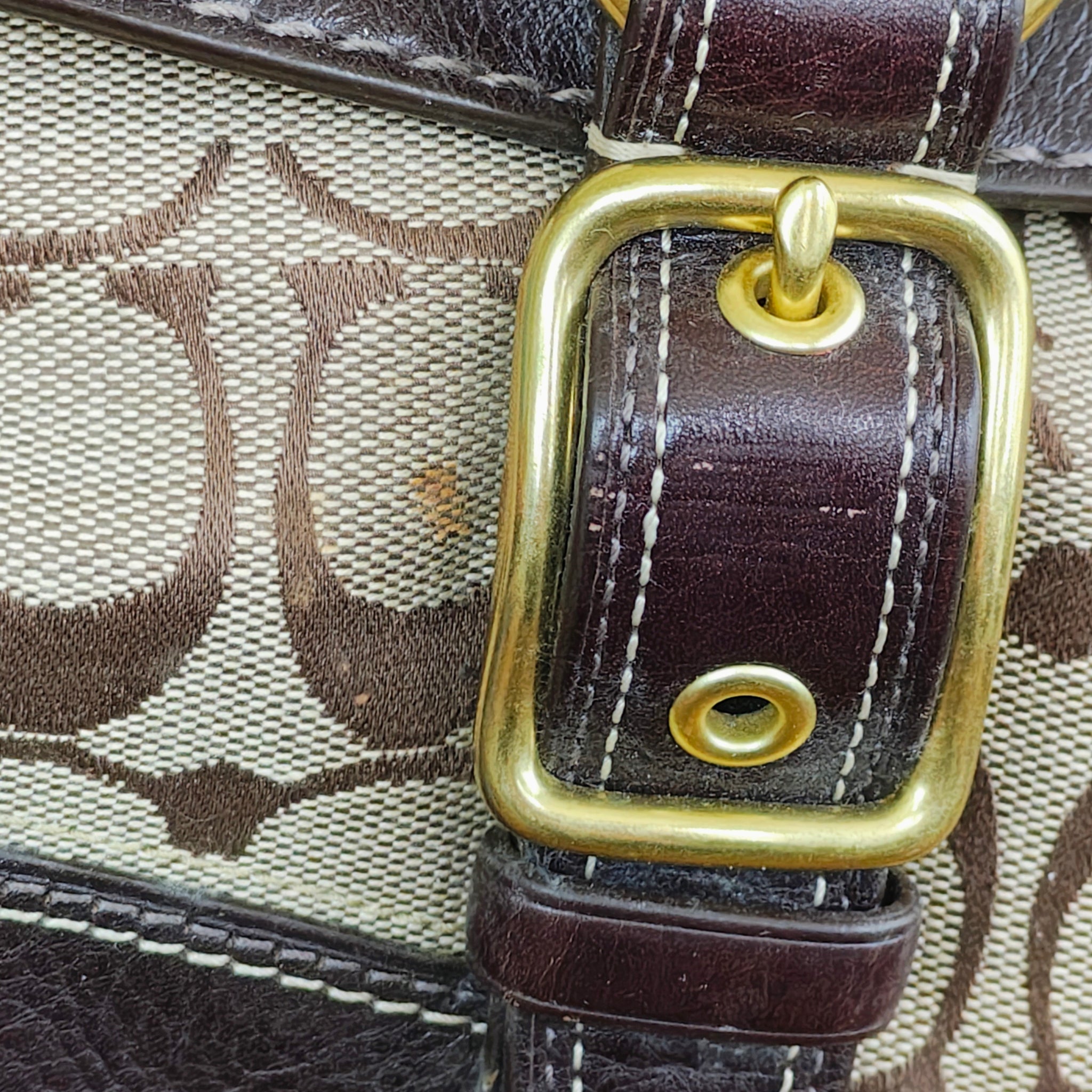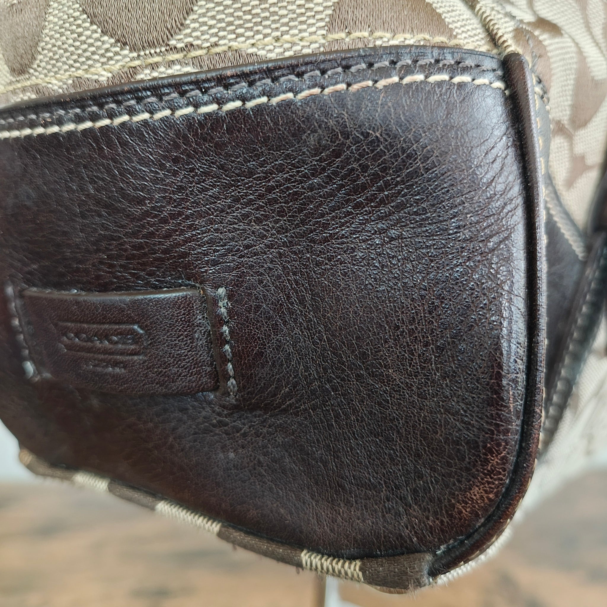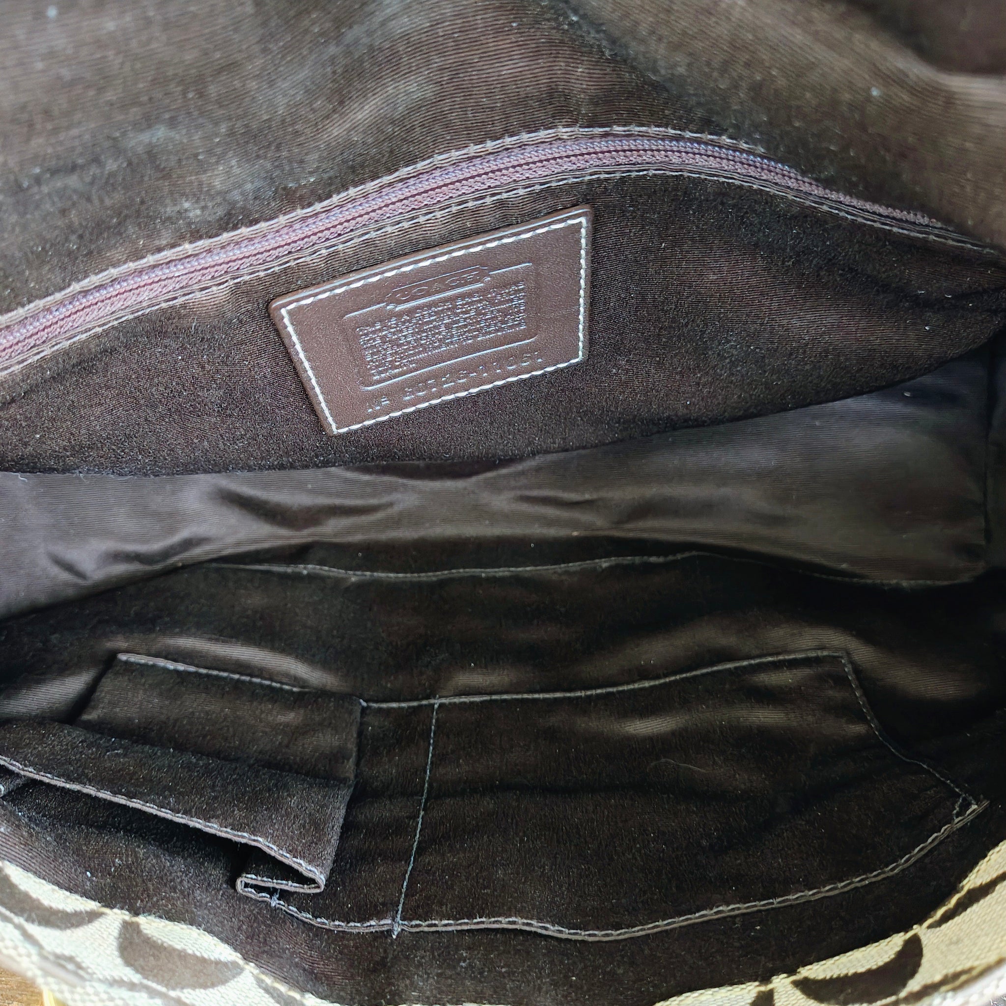 The handbag is a vintage Coach Signature Hampton Flap Satchel, a popular style from the early to mid-2000s.