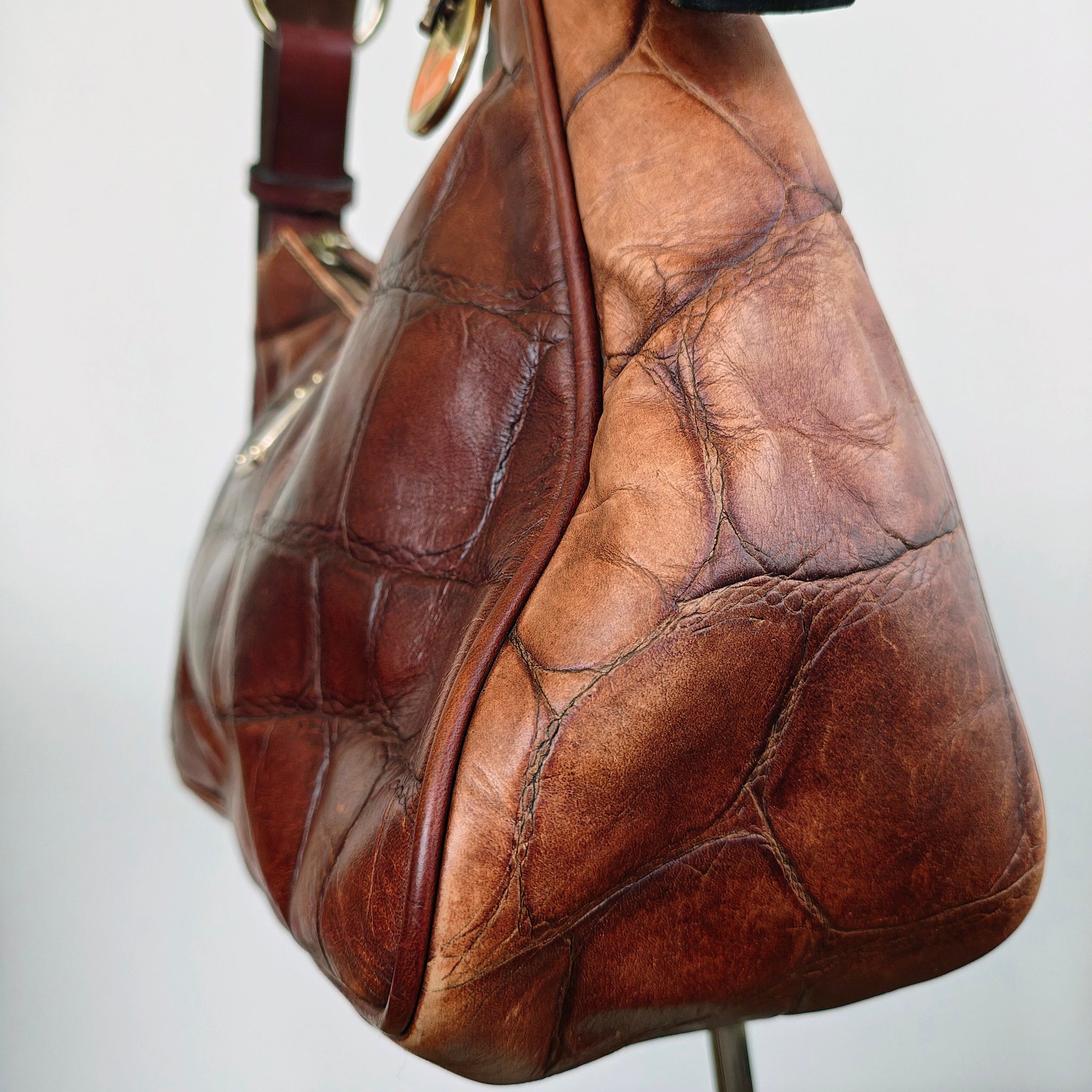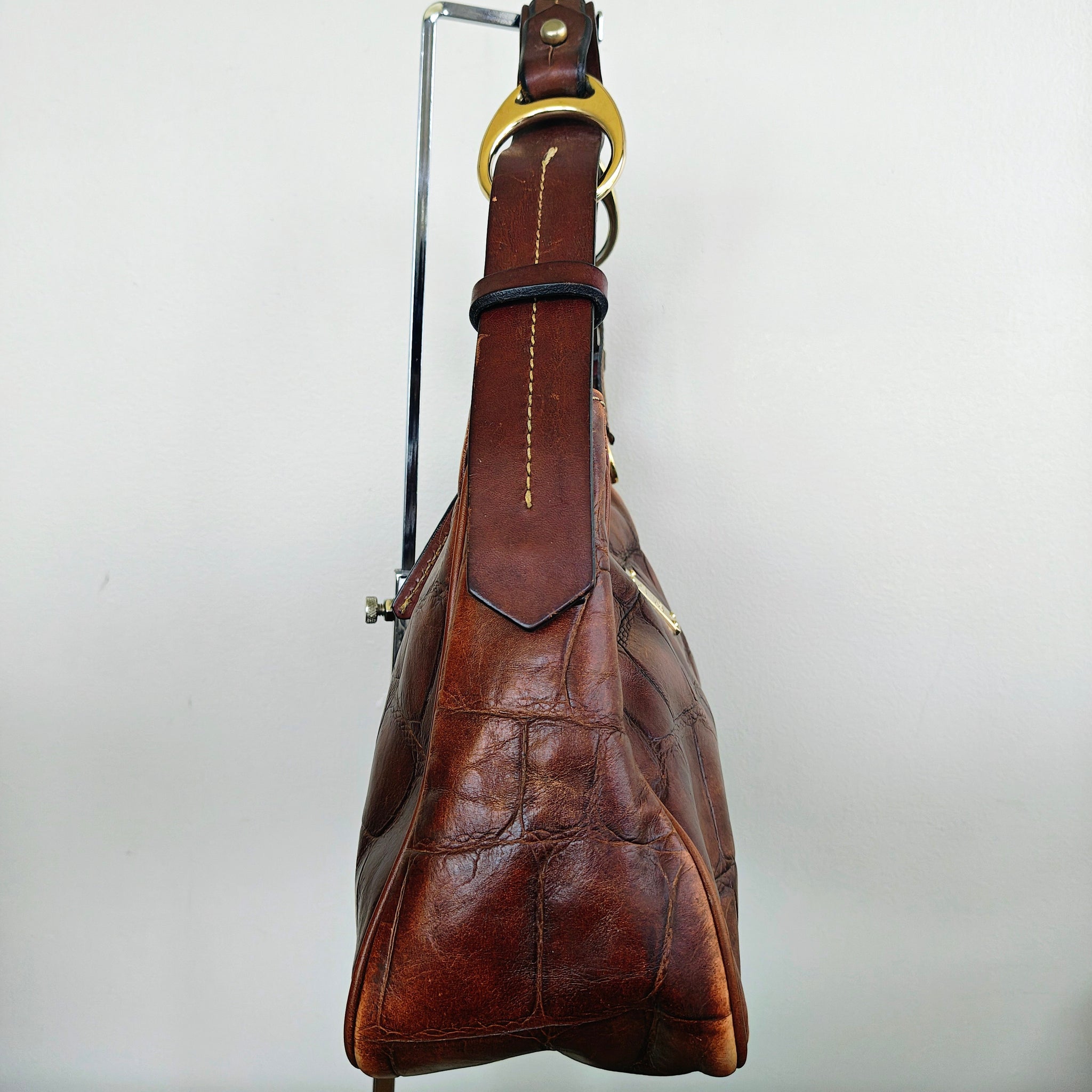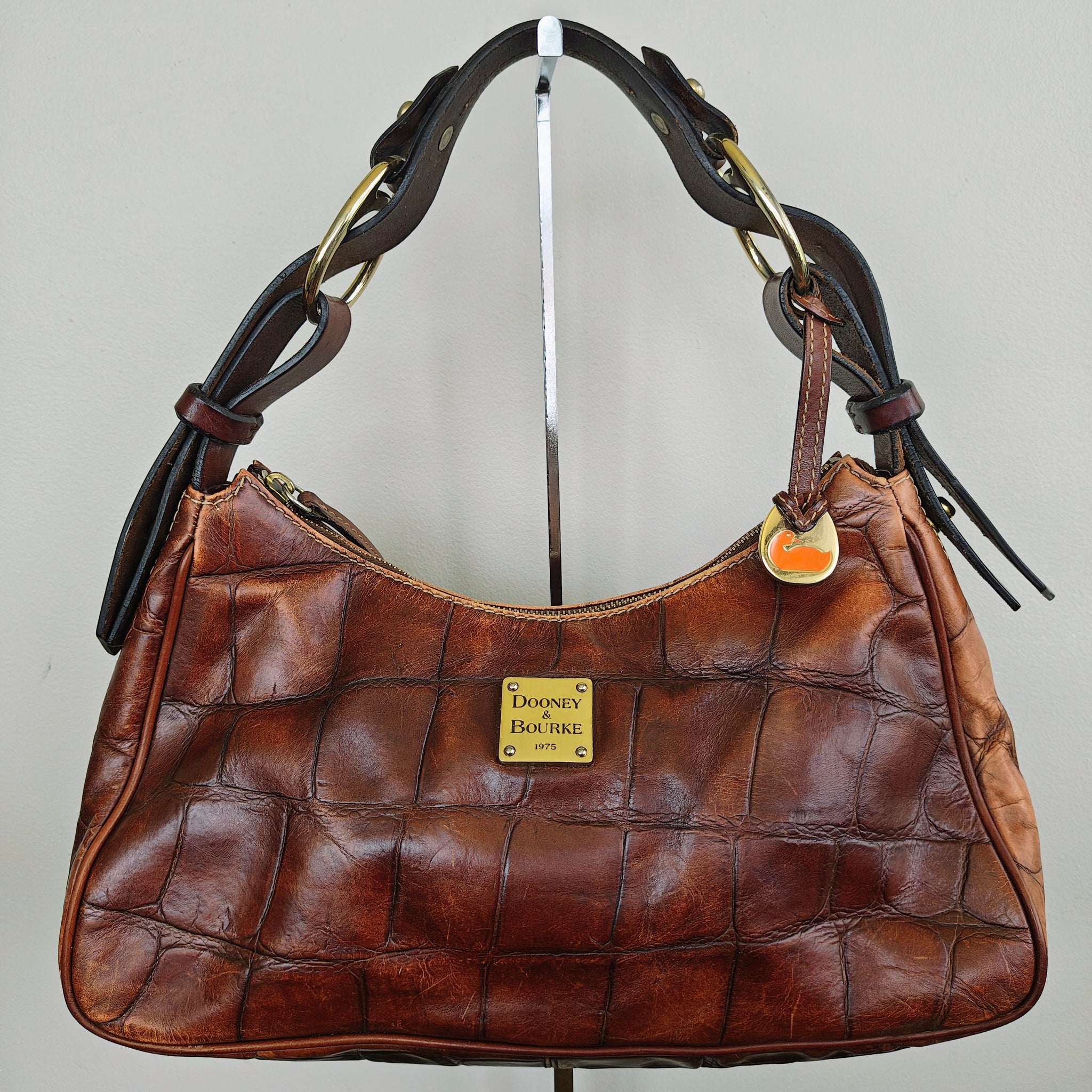 Dooney & Bourke hobo shoulder bag in brown, featuring a crocodile-embossed leather finish. Known for their high-quality, hand-finished embossed calfskin designed to resemble real crocodile skin.