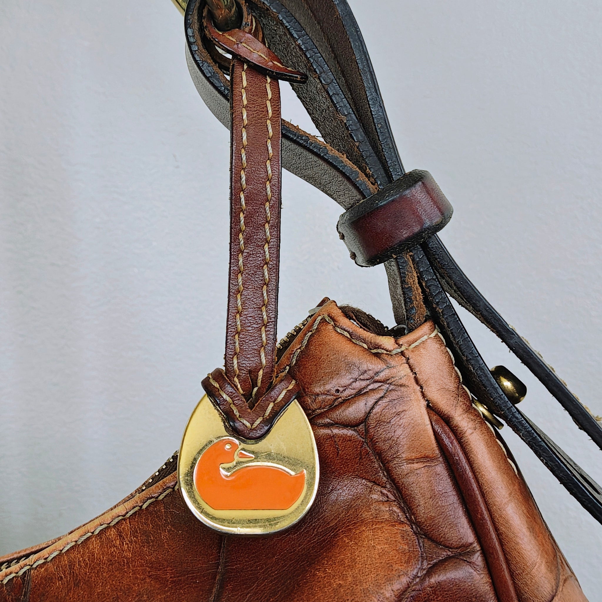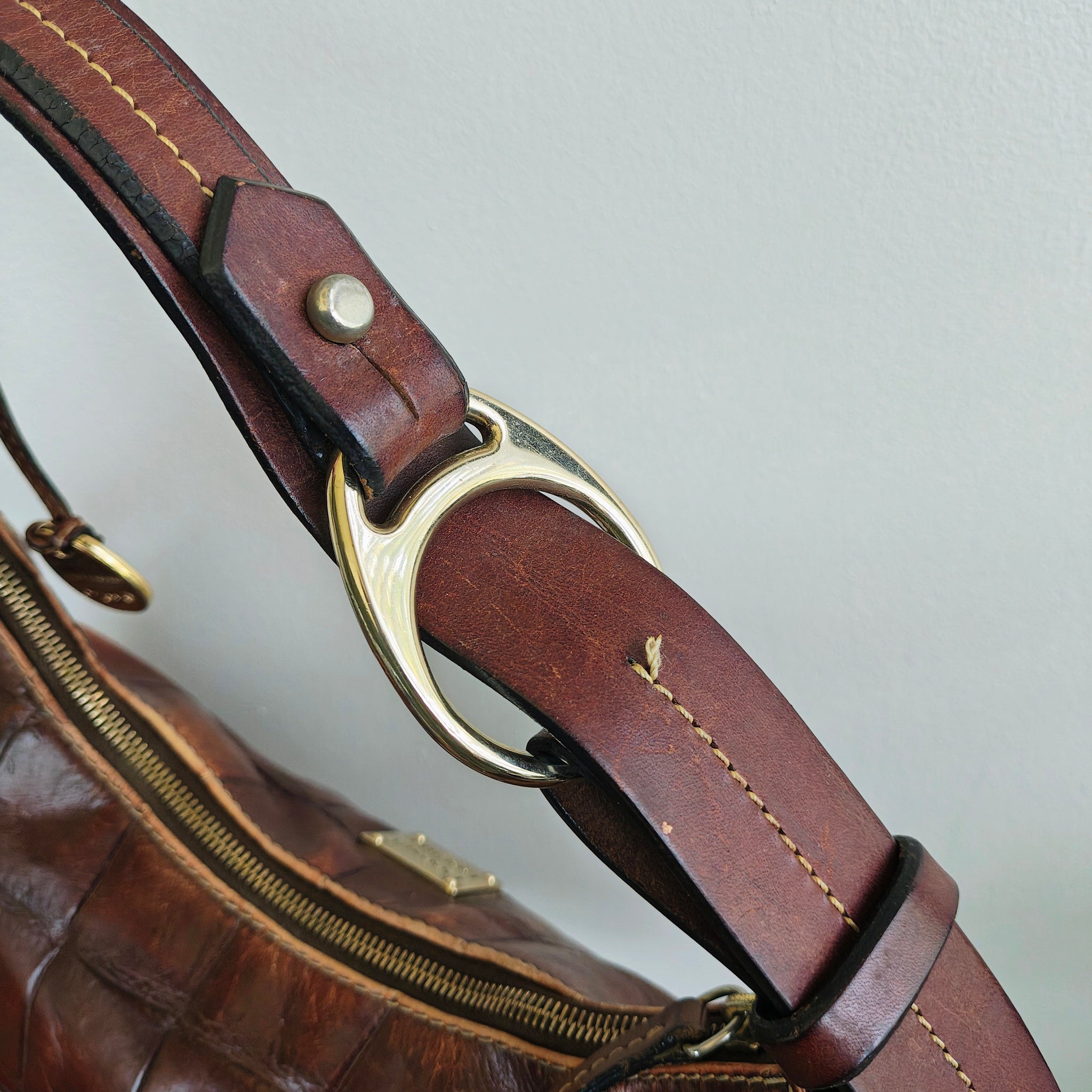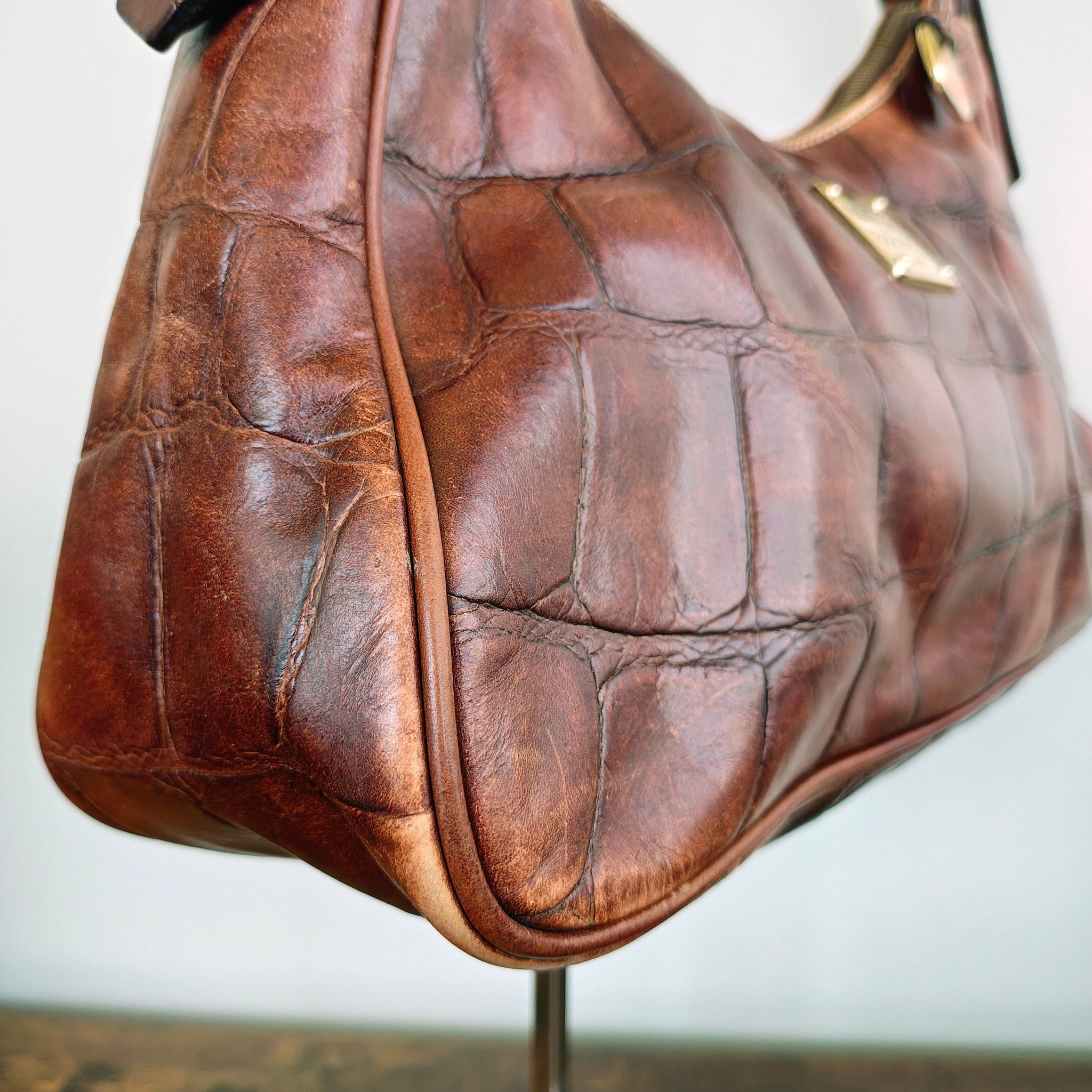 Dooney & Bourke hobo shoulder bag in brown, featuring a crocodile-embossed leather finish. Known for their high-quality, hand-finished embossed calfskin designed to resemble real crocodile skin.