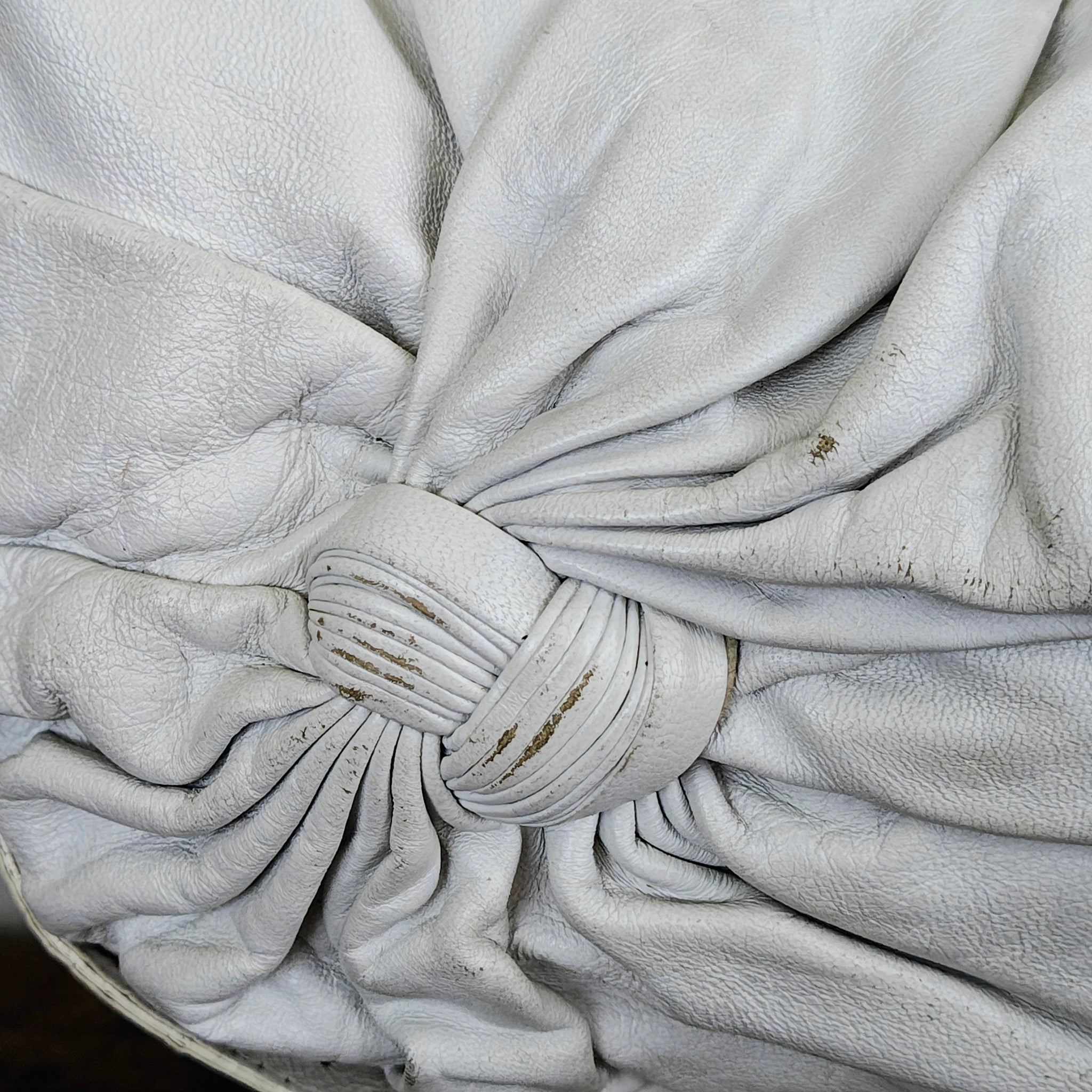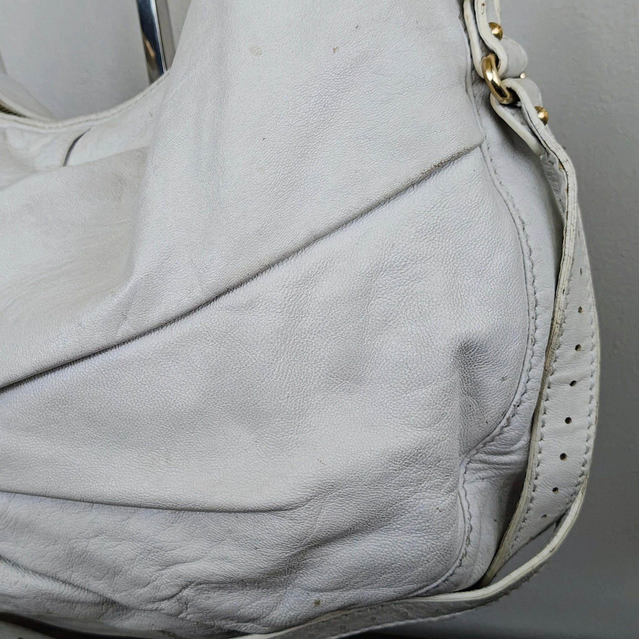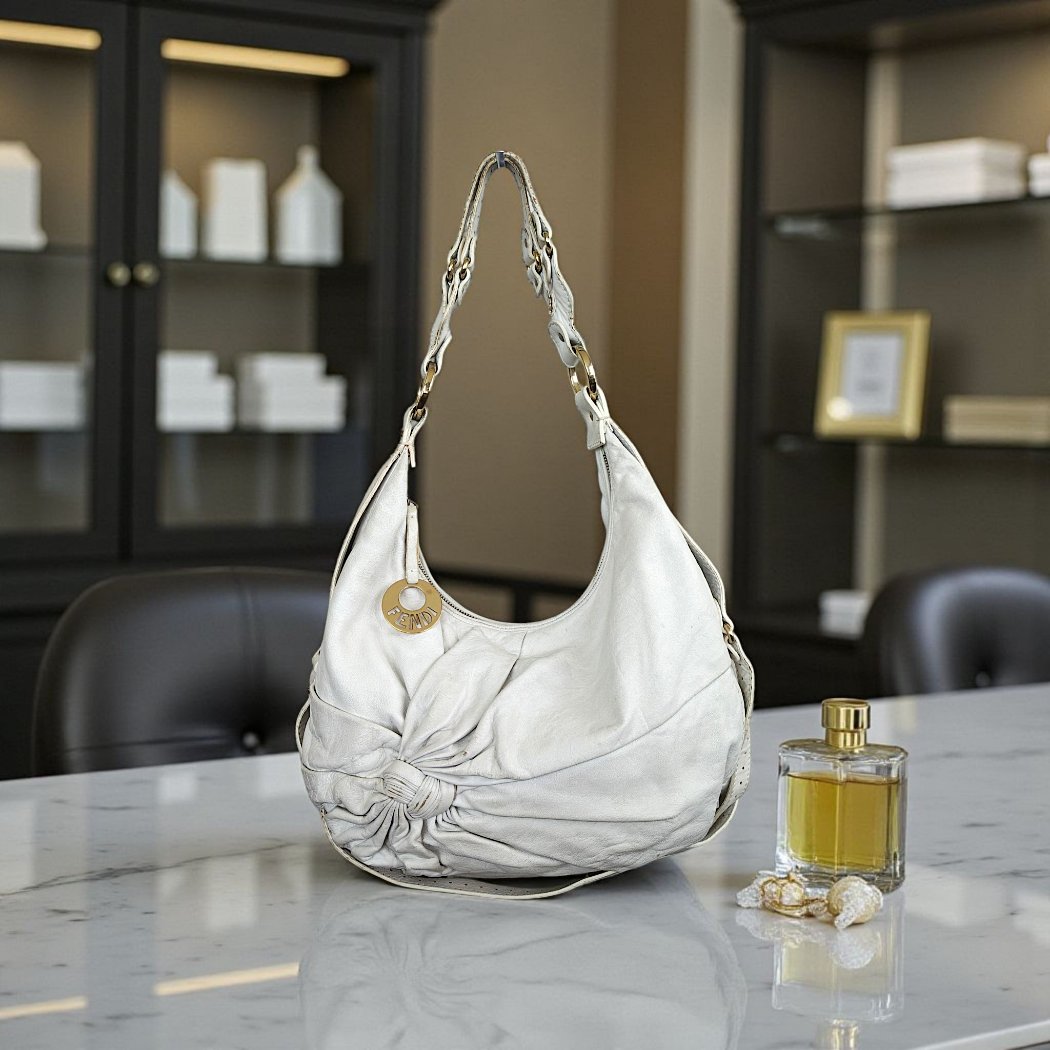 Fendi Tie Front Detailed Hobo Bag in white leather, also referred to as a Fendi Knot Hobo. It features a distinctive ruched or knotted detail on the front and a gold-tone logo charm.