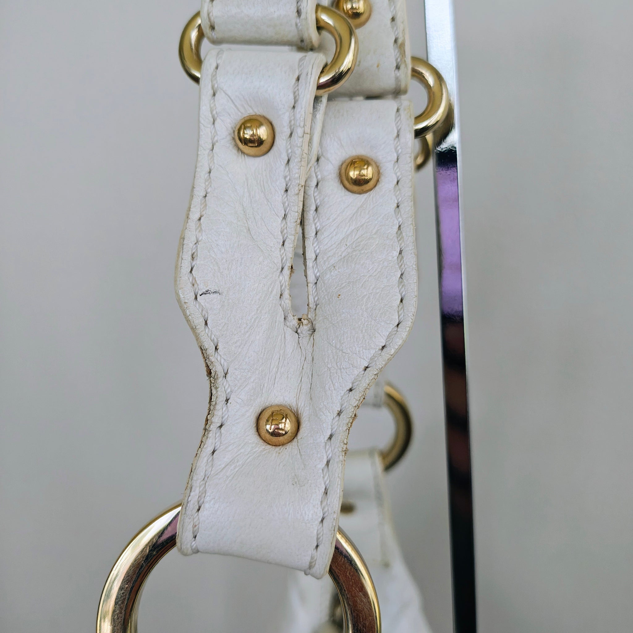 Hardware: Gold-tone metalware, including the round Fendi logo charm