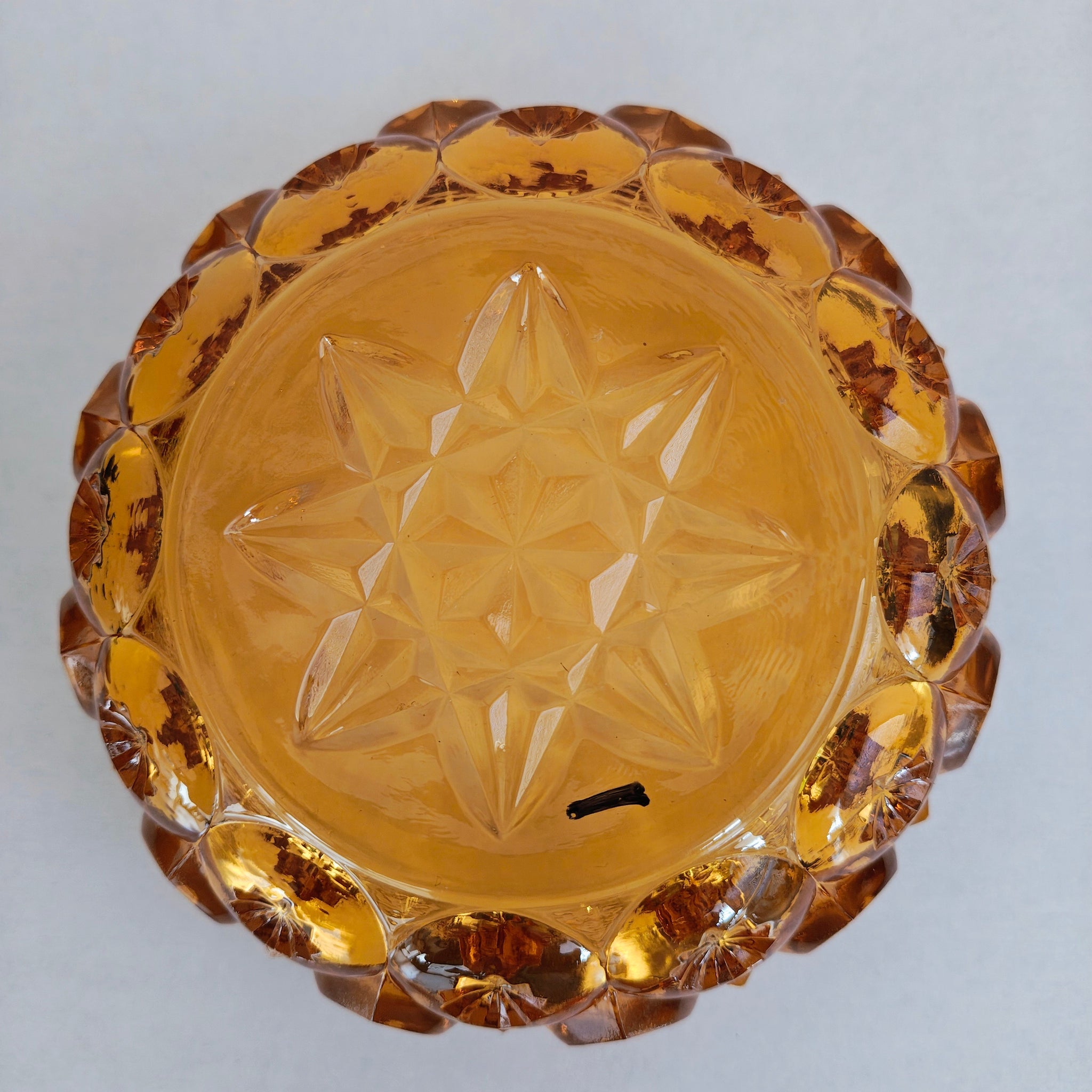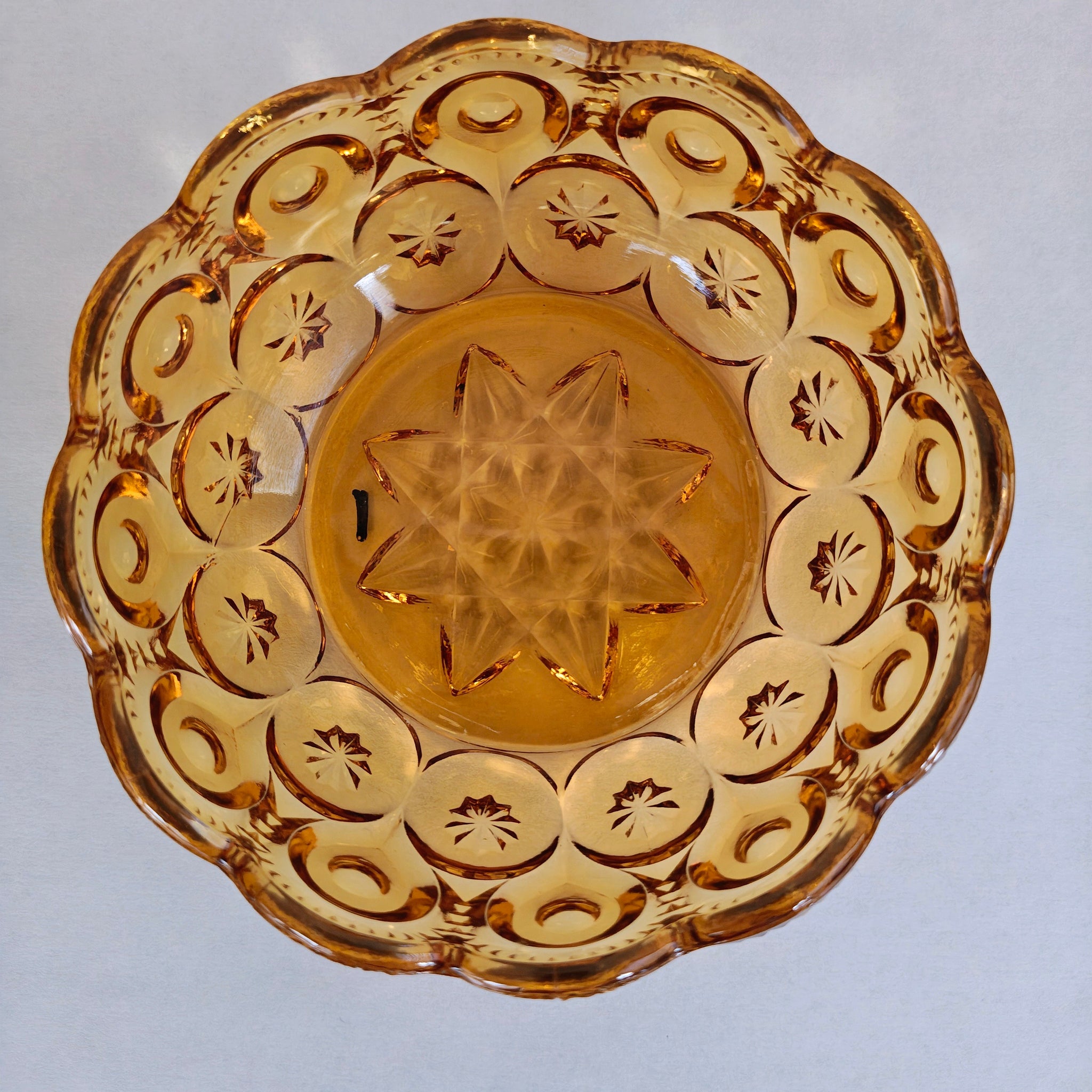 This item is a vintage L.E. Smith "Moon and Stars" amber glass bowl or compote. It features a classic, highly collectible pressed glass pattern with raised circular "moon" shapes and star motifs, and typically has a scalloped or crimped edge.