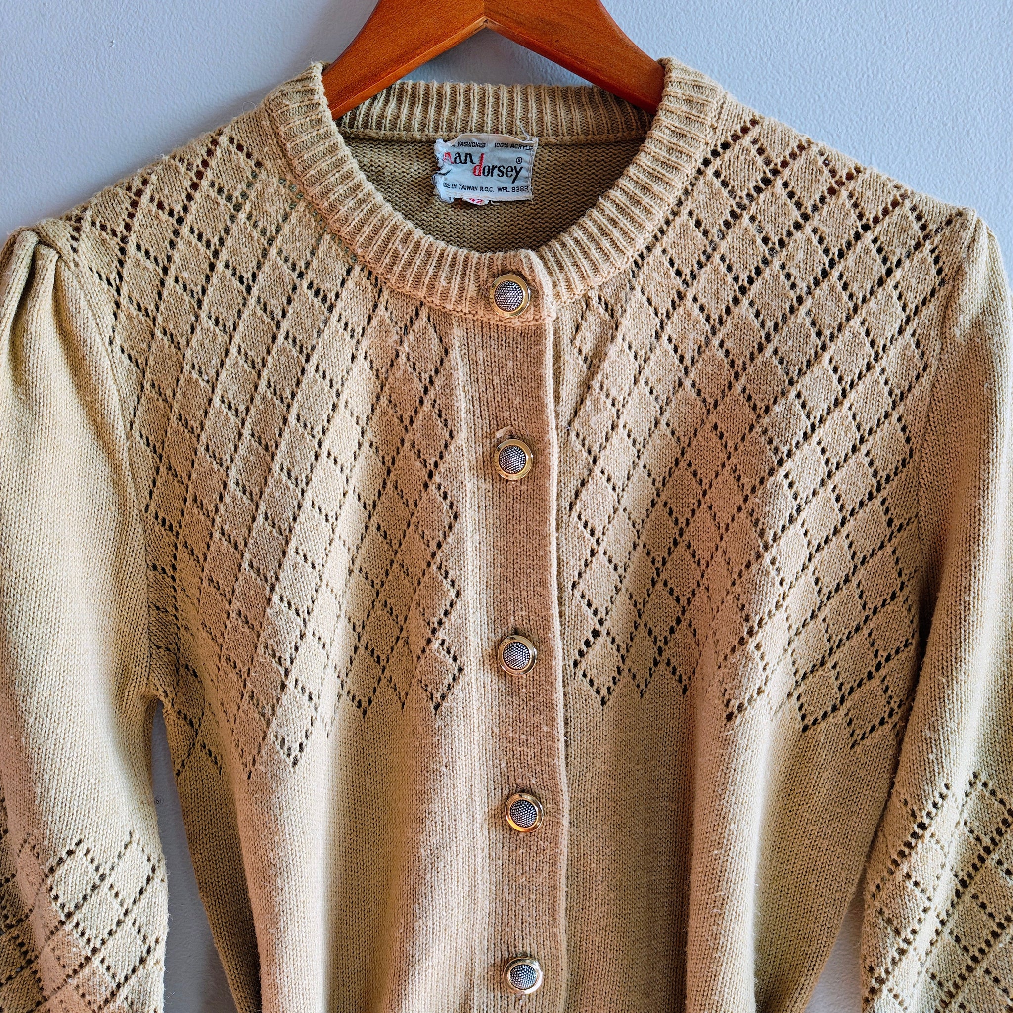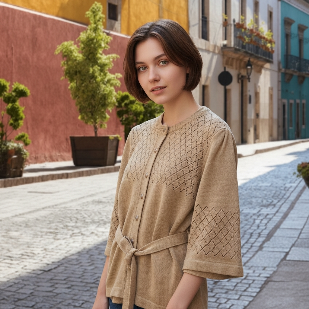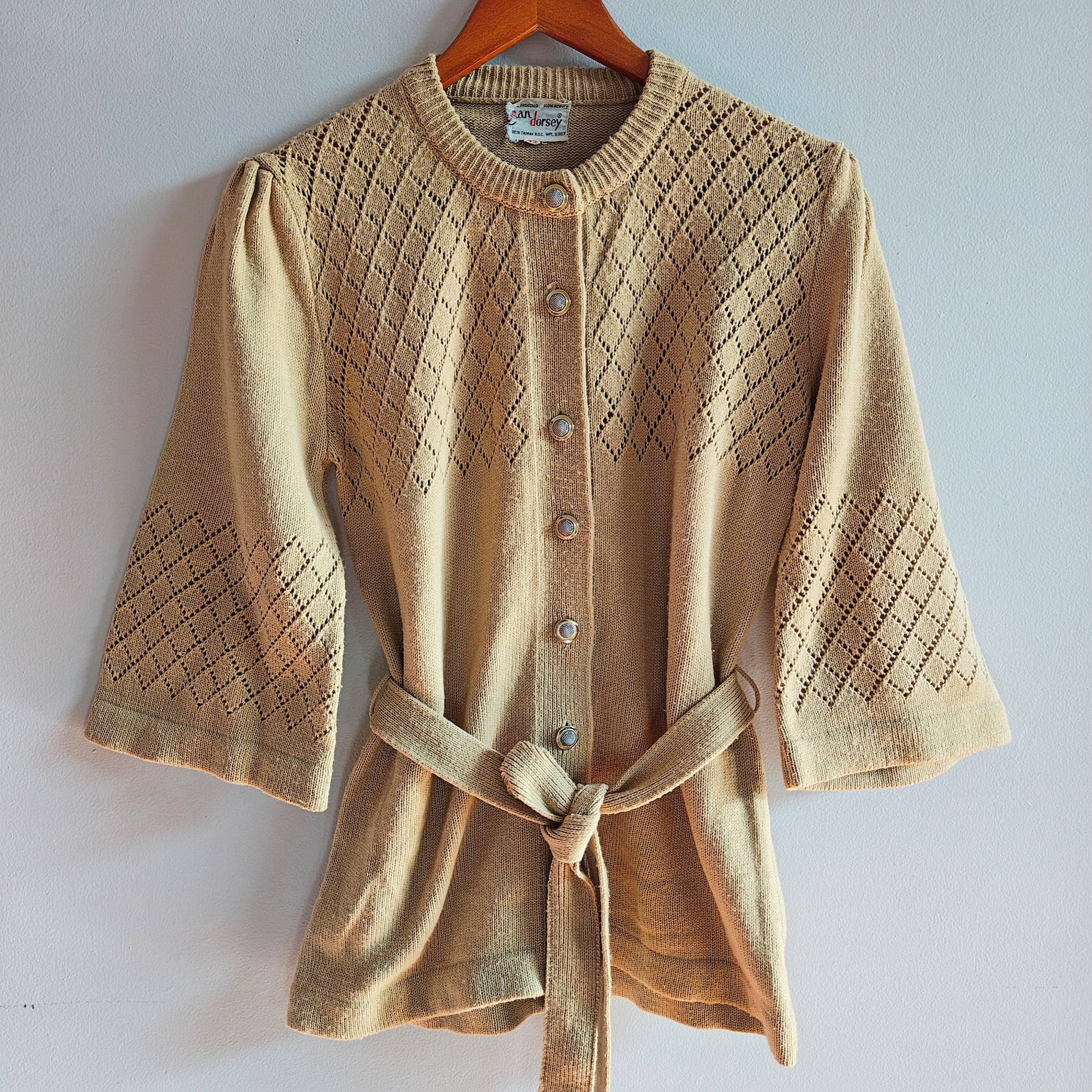 Beige openwork knit belted cardigan with 3/4 length sleeves. The openwork, or pointelle, detailing creates a diamond pattern on the main body and sleeves, while the waist tie allows for an adjustable, cinched fit. It features a crew neck and a button-up front closure with detailed metal buttons.