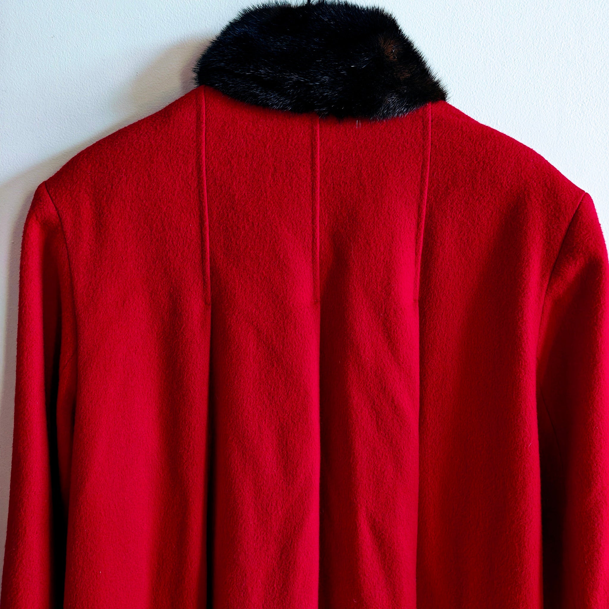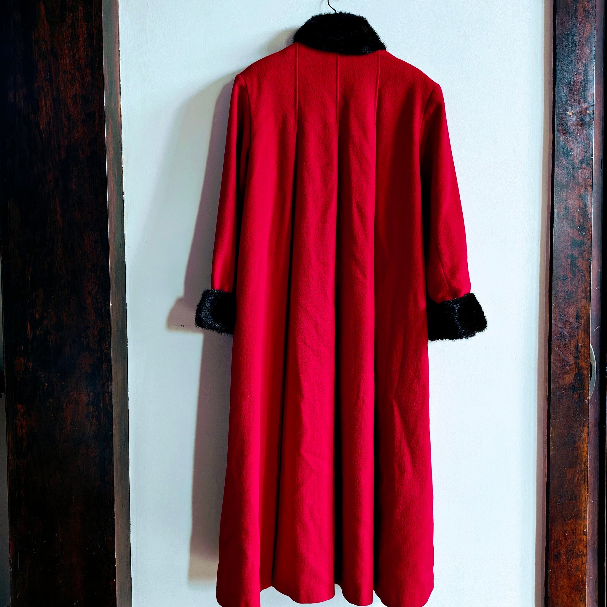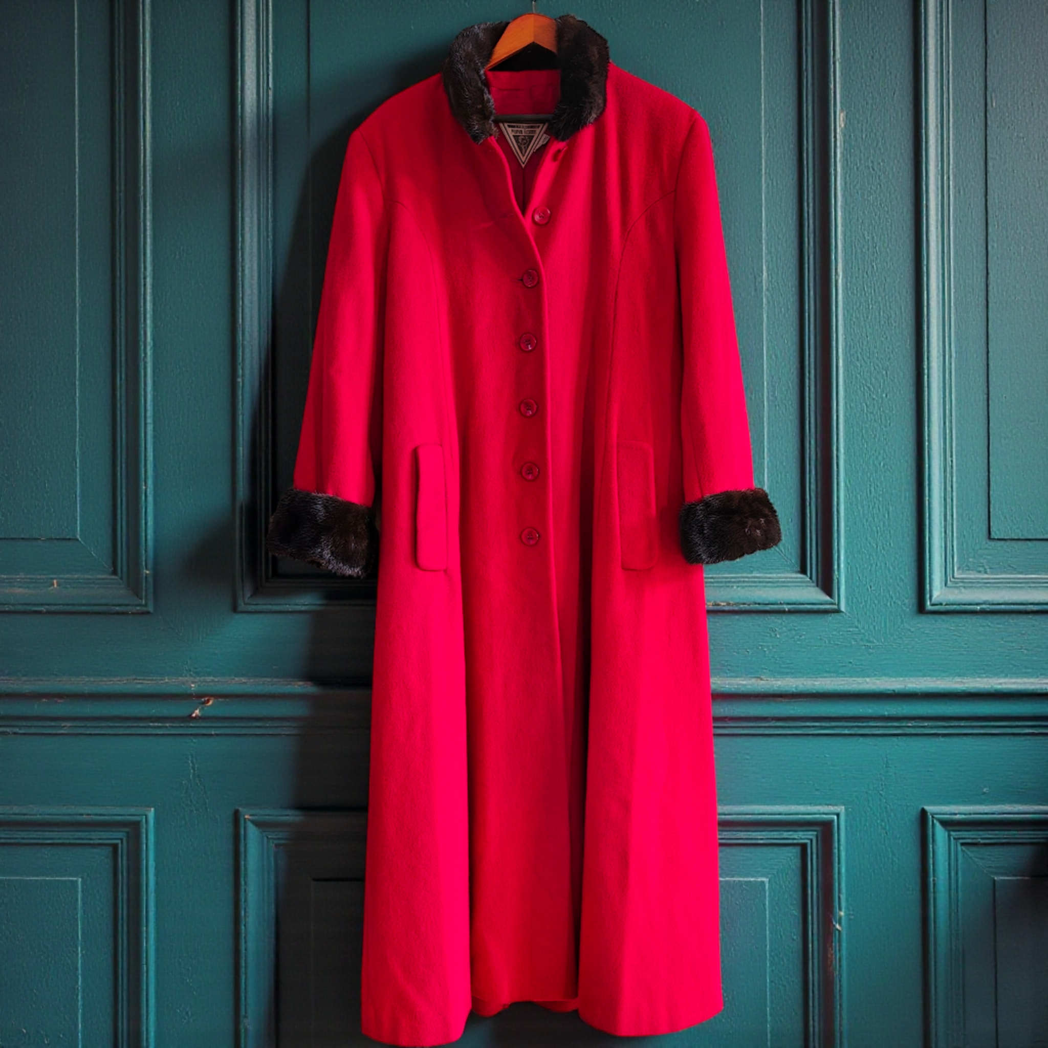 Material: The main body is wool, with the collar and cuffs trimmed in dark brown and black fur. There are no tags to identify the fur type but it appears to be mink.