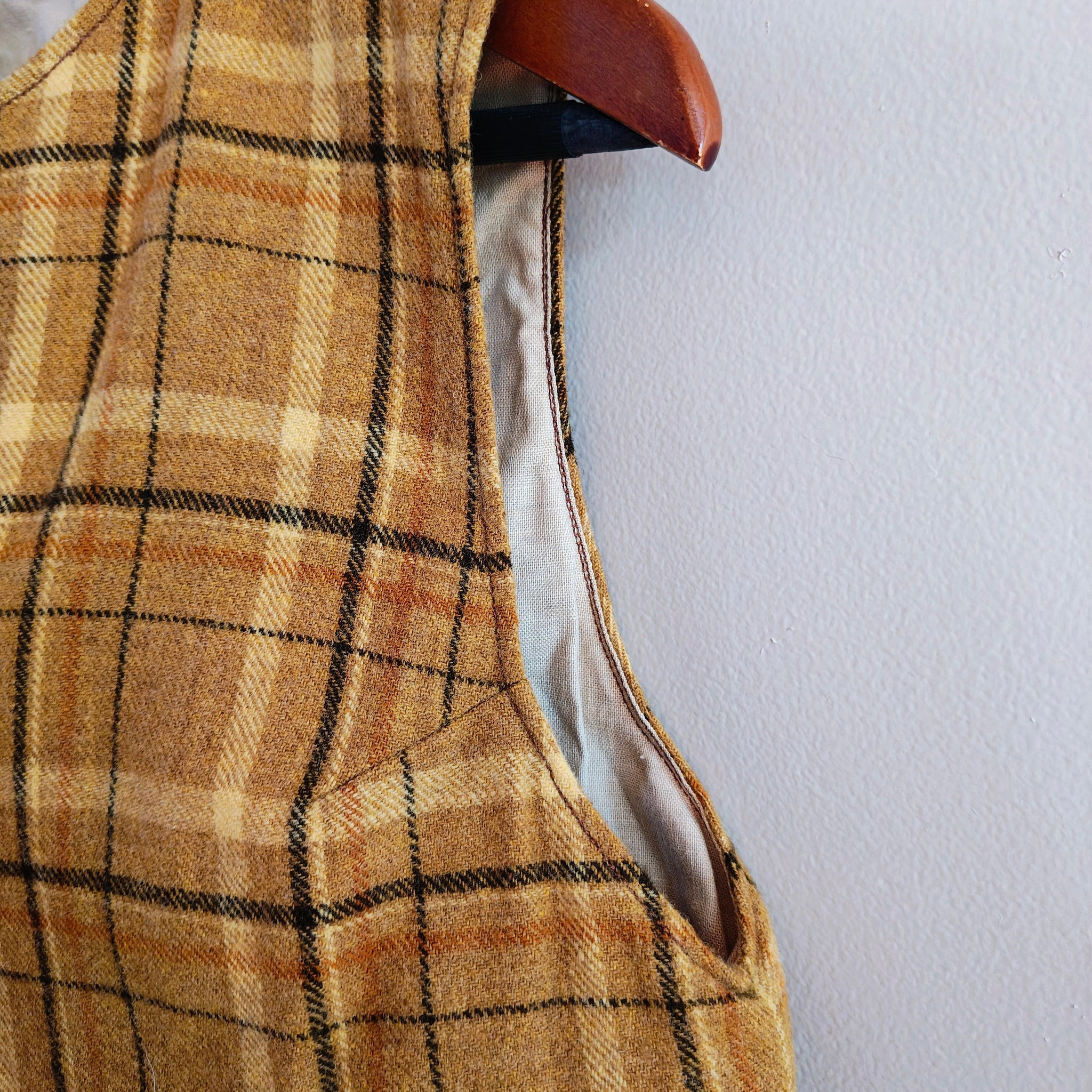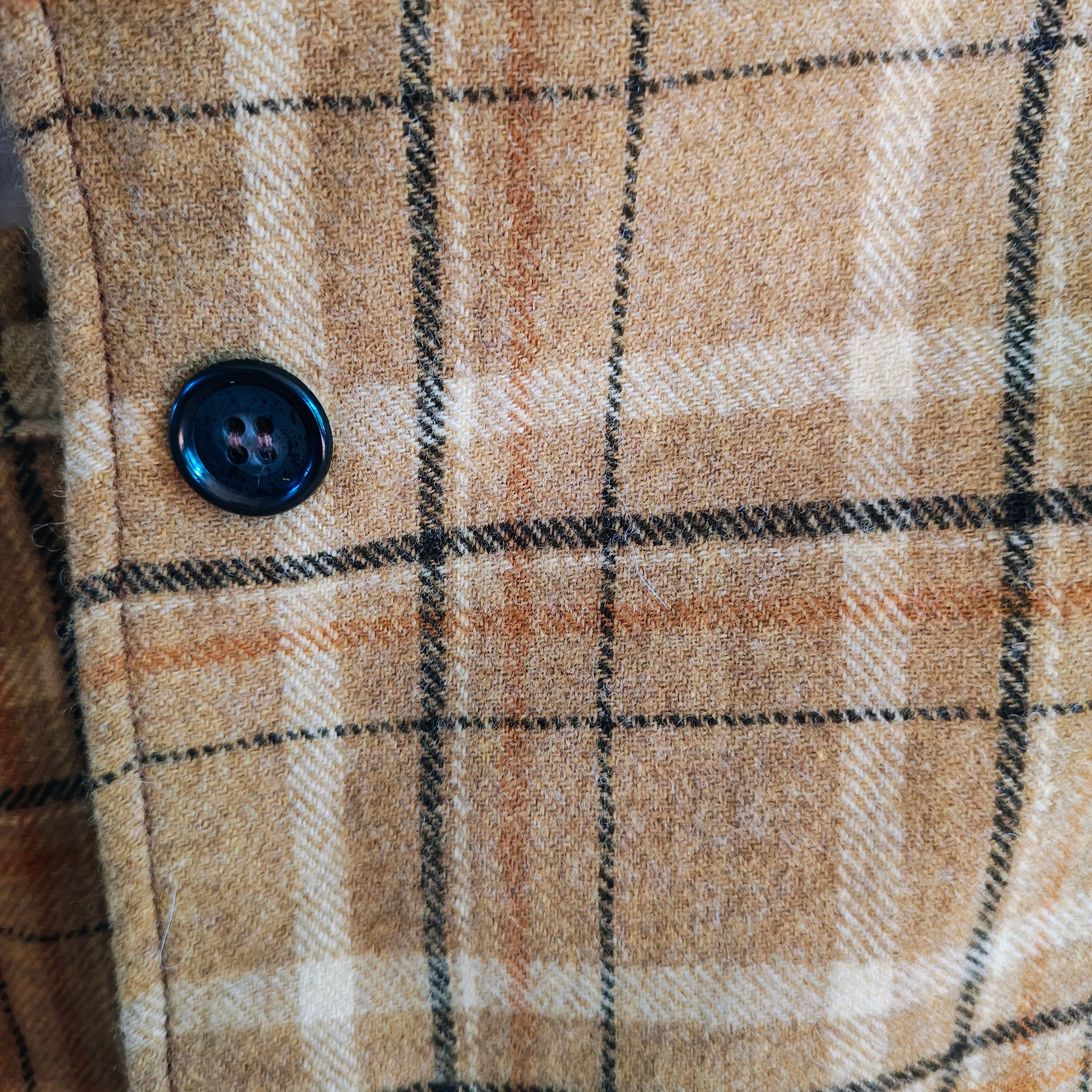 Color: Features a classic golden plaid or tartan check pattern with thin black and orange lines.