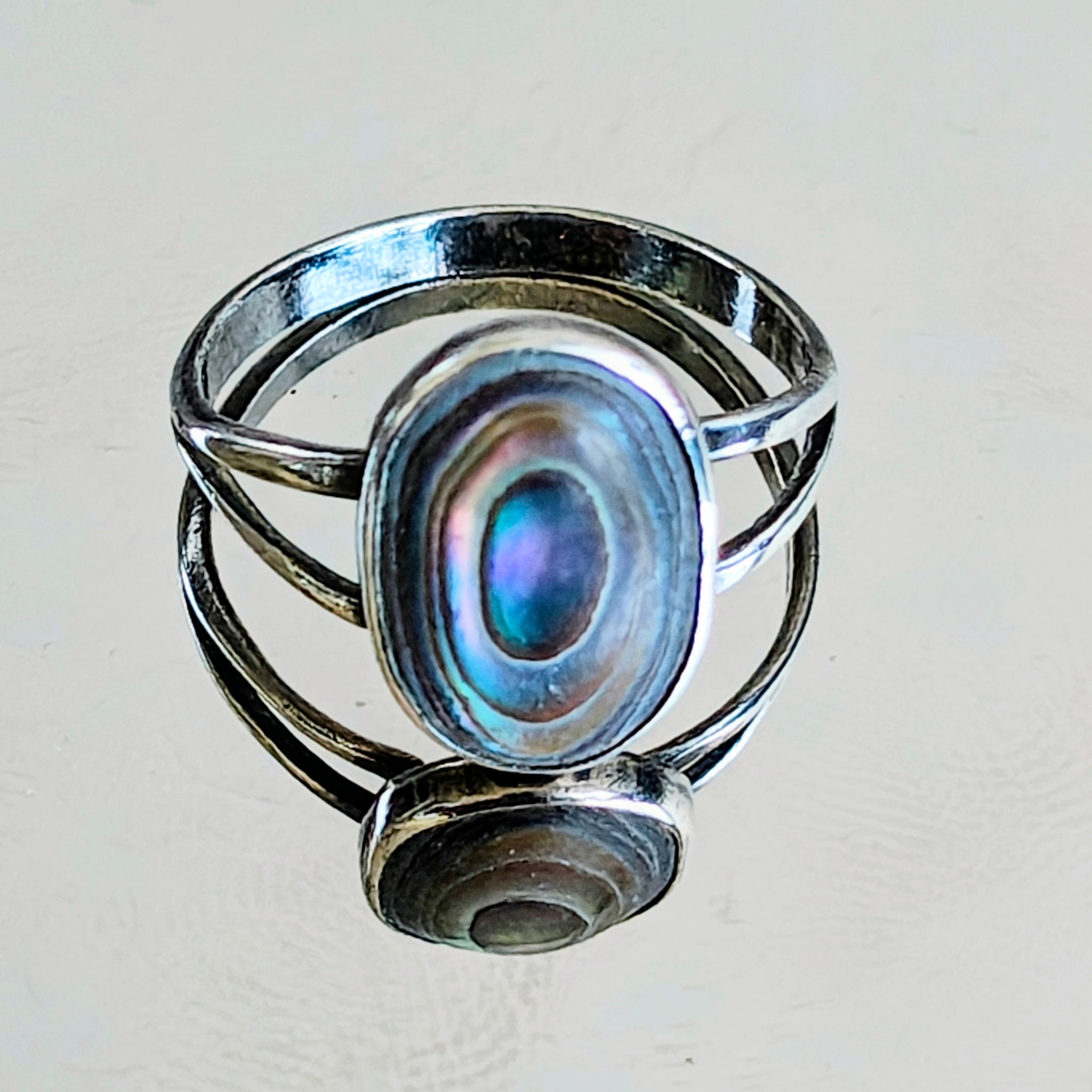 Vintage mexican 925 sterling silver ring featuring an oval abalone (or paua) shell as the centerpiece and beautifully crafted. The ring has a distinctive split-shank design, where the band separates into two loops that hold the stone's bezel setting.