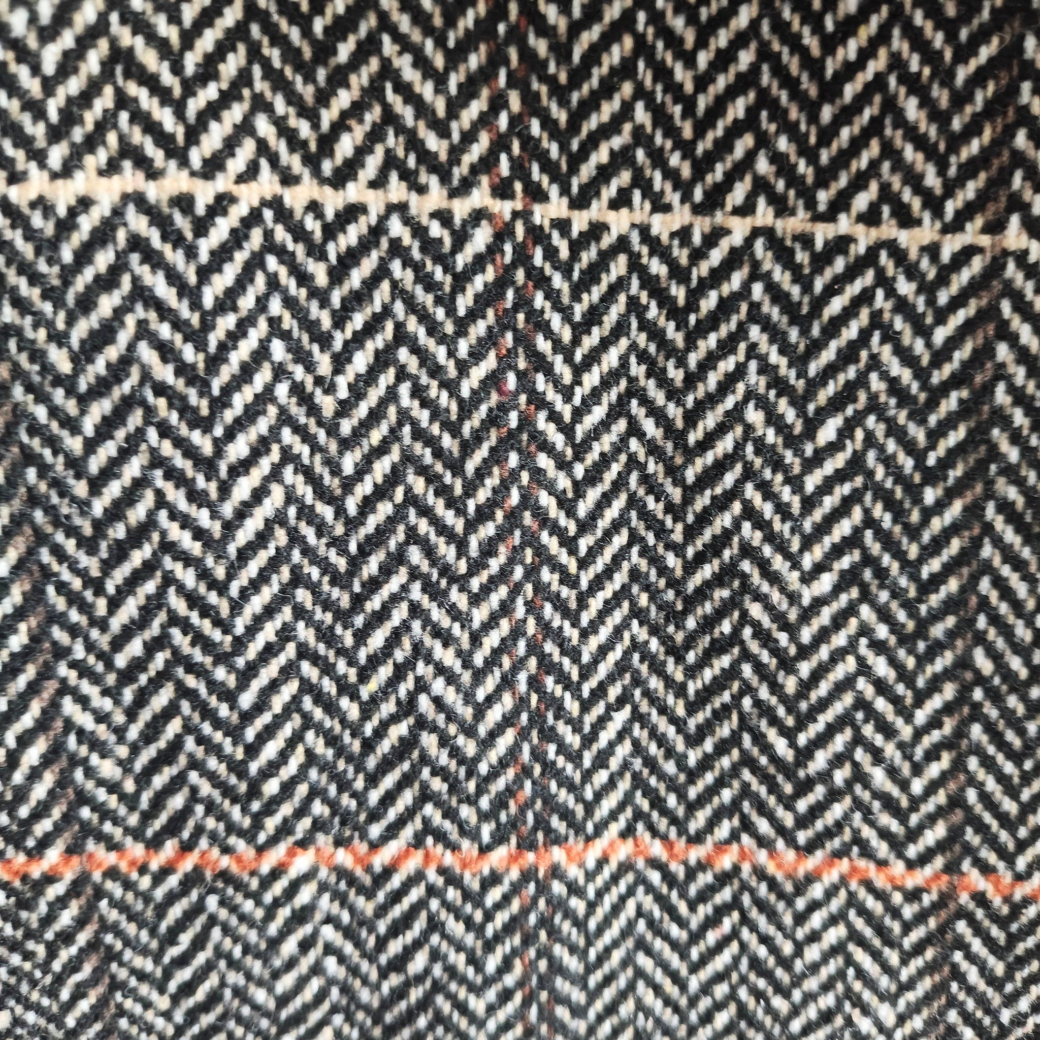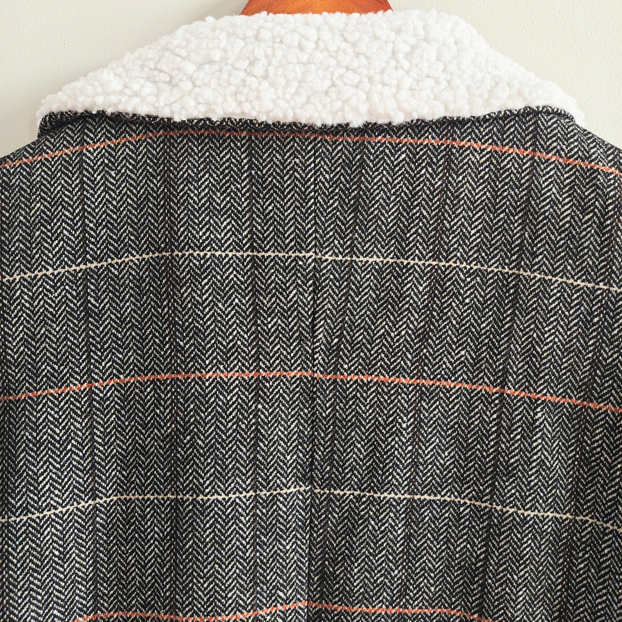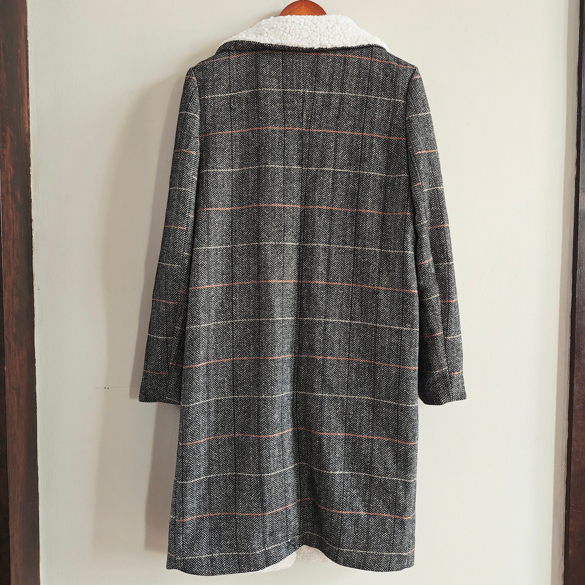 Style: The coat features a button-front closure, a large, wide notched lapel or spread collar, and a herringbone plaid pattern with subtle orange accents. It has a cozy sherpa or fleece trim warmth.