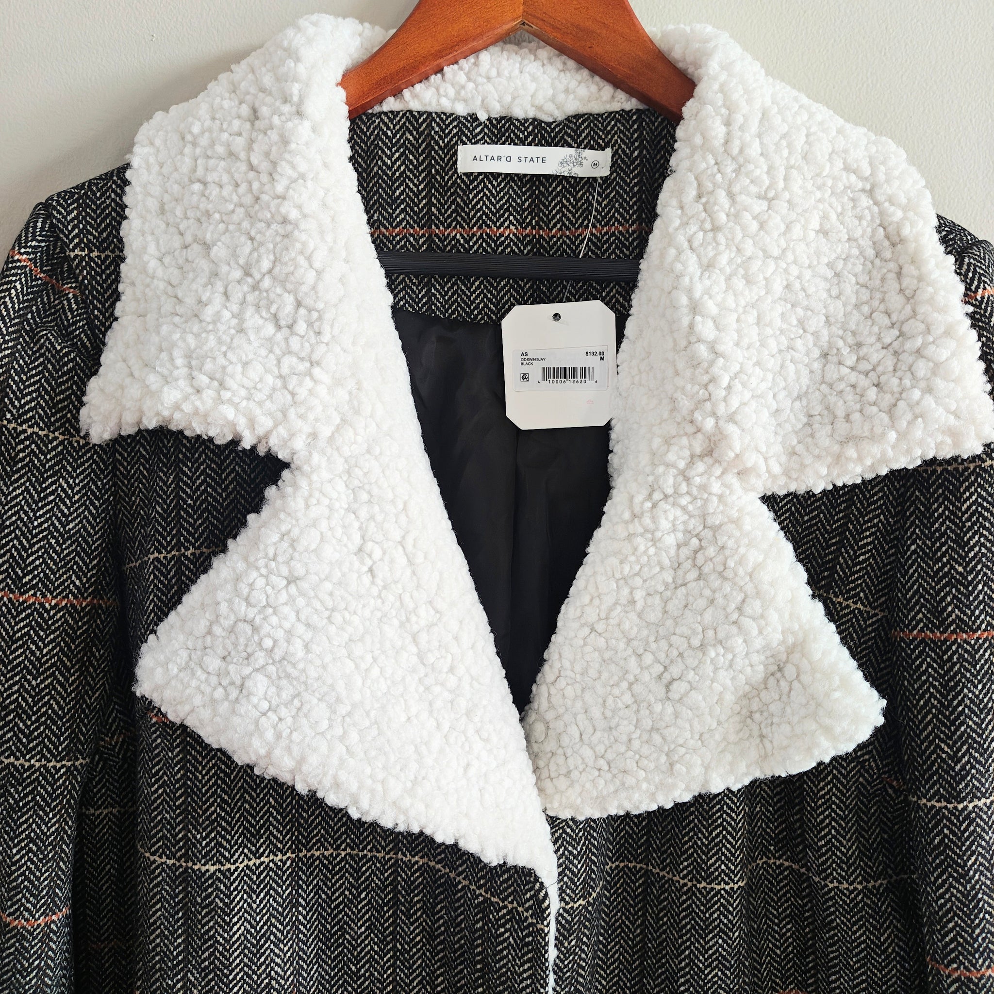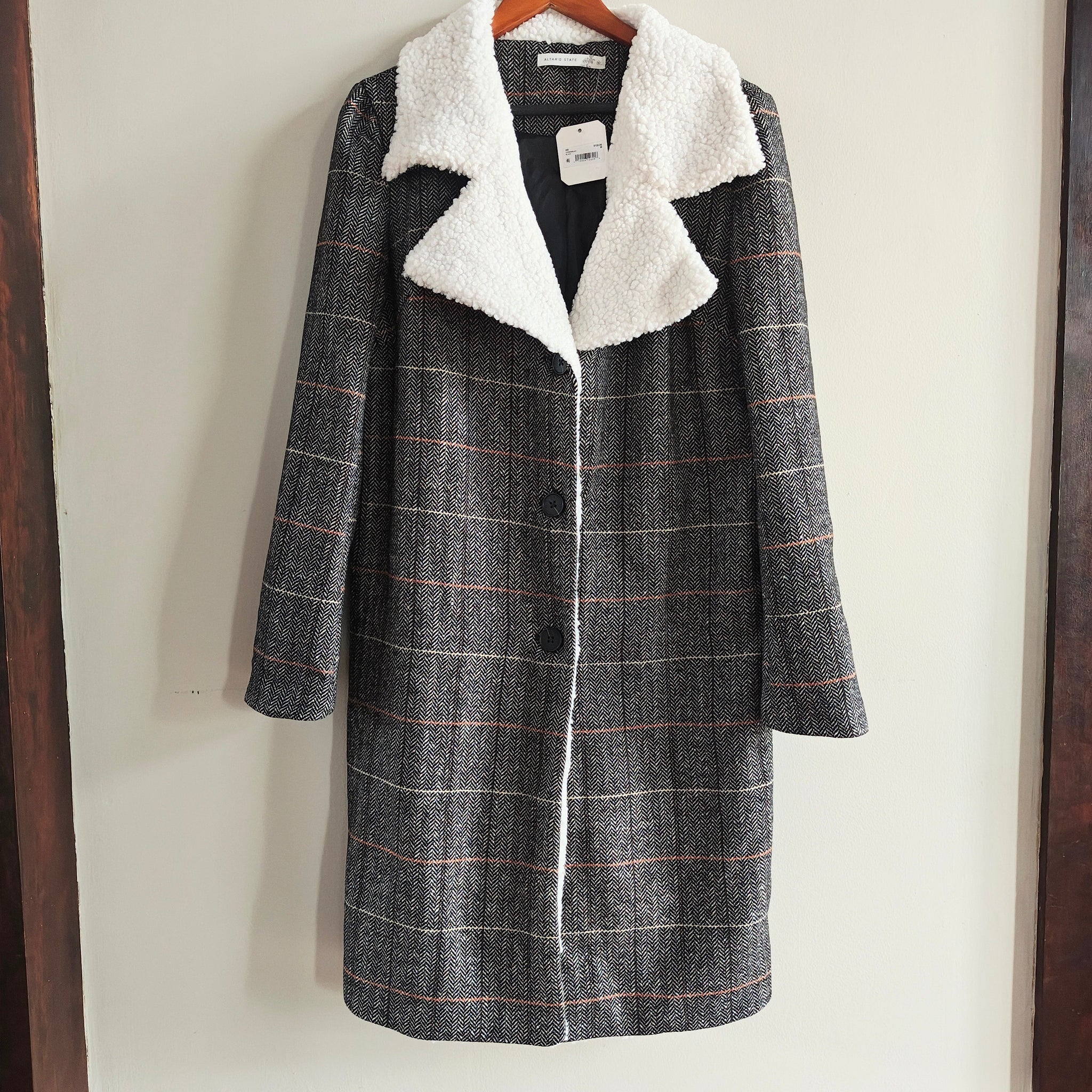 Altar'd State Opal Plaid Coat, which is a popular style of a brown tweed or wool-blend coat with a white faux sherpa collar and lining.