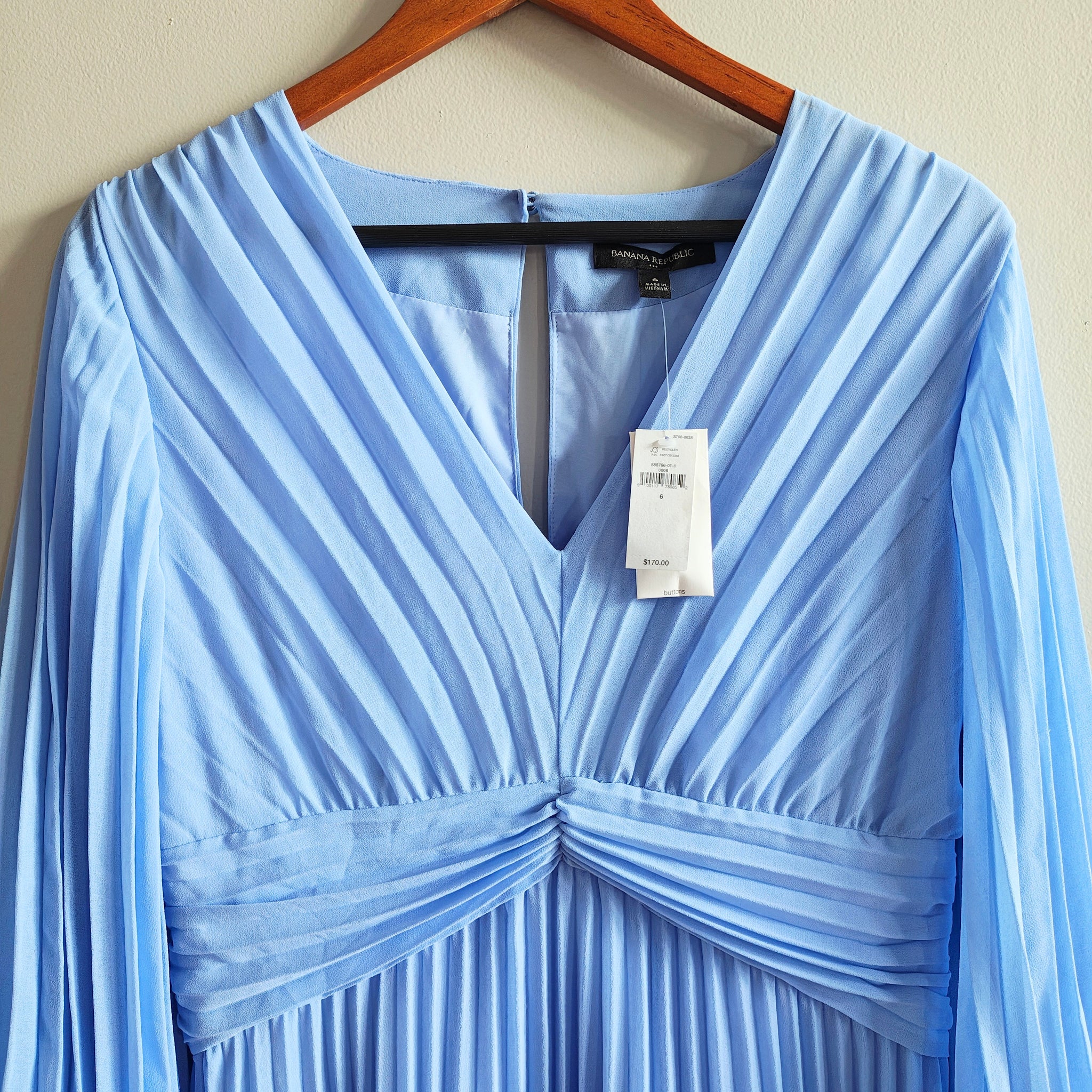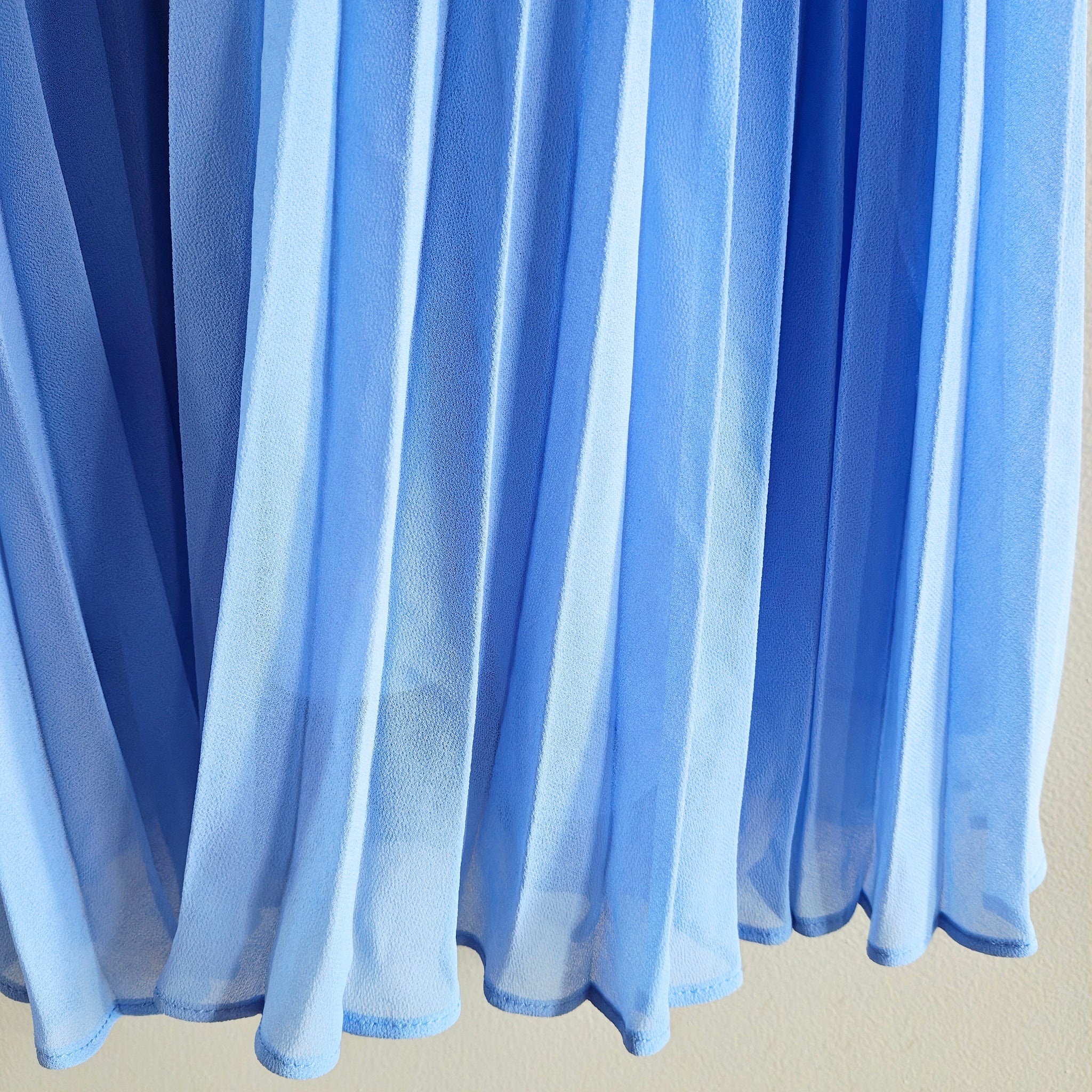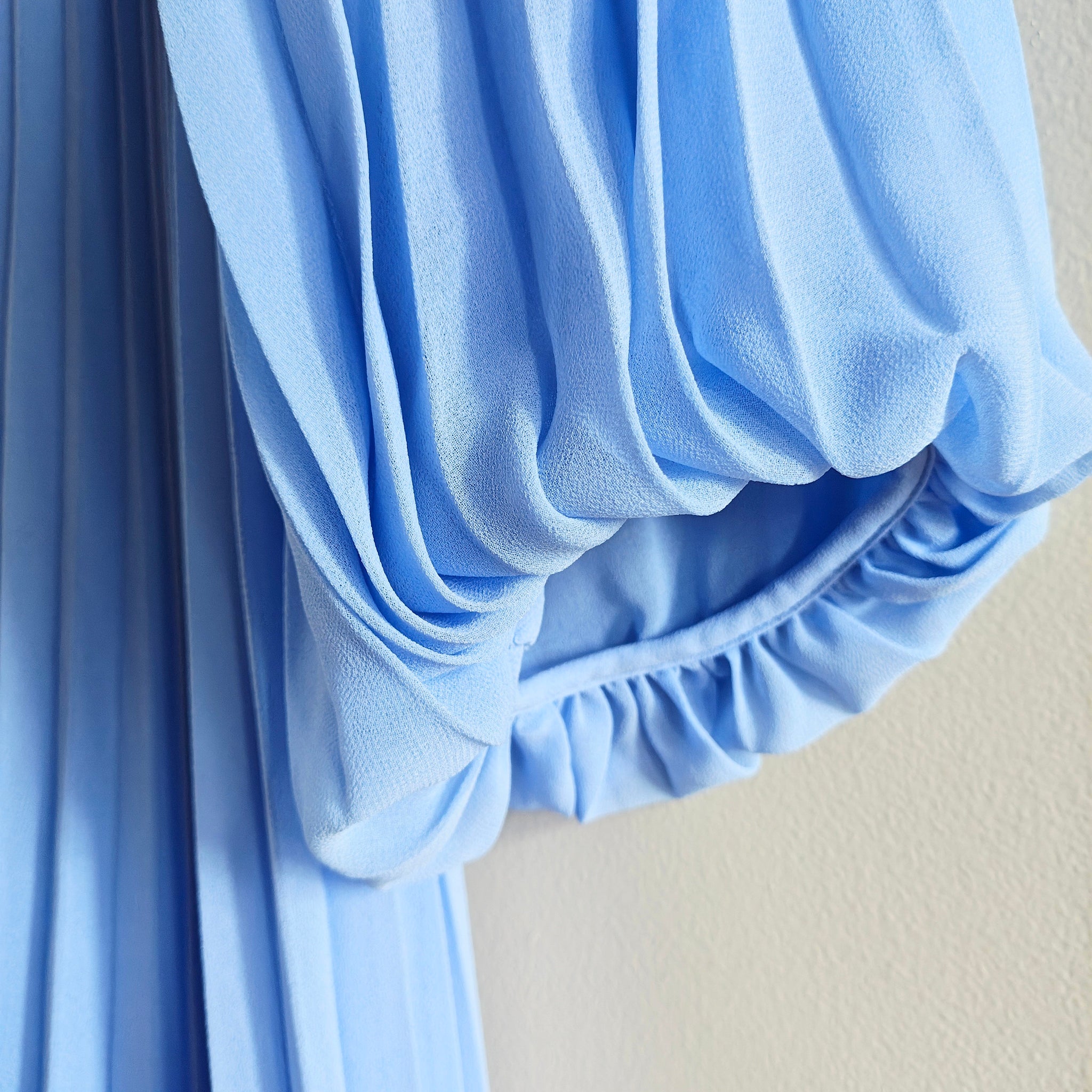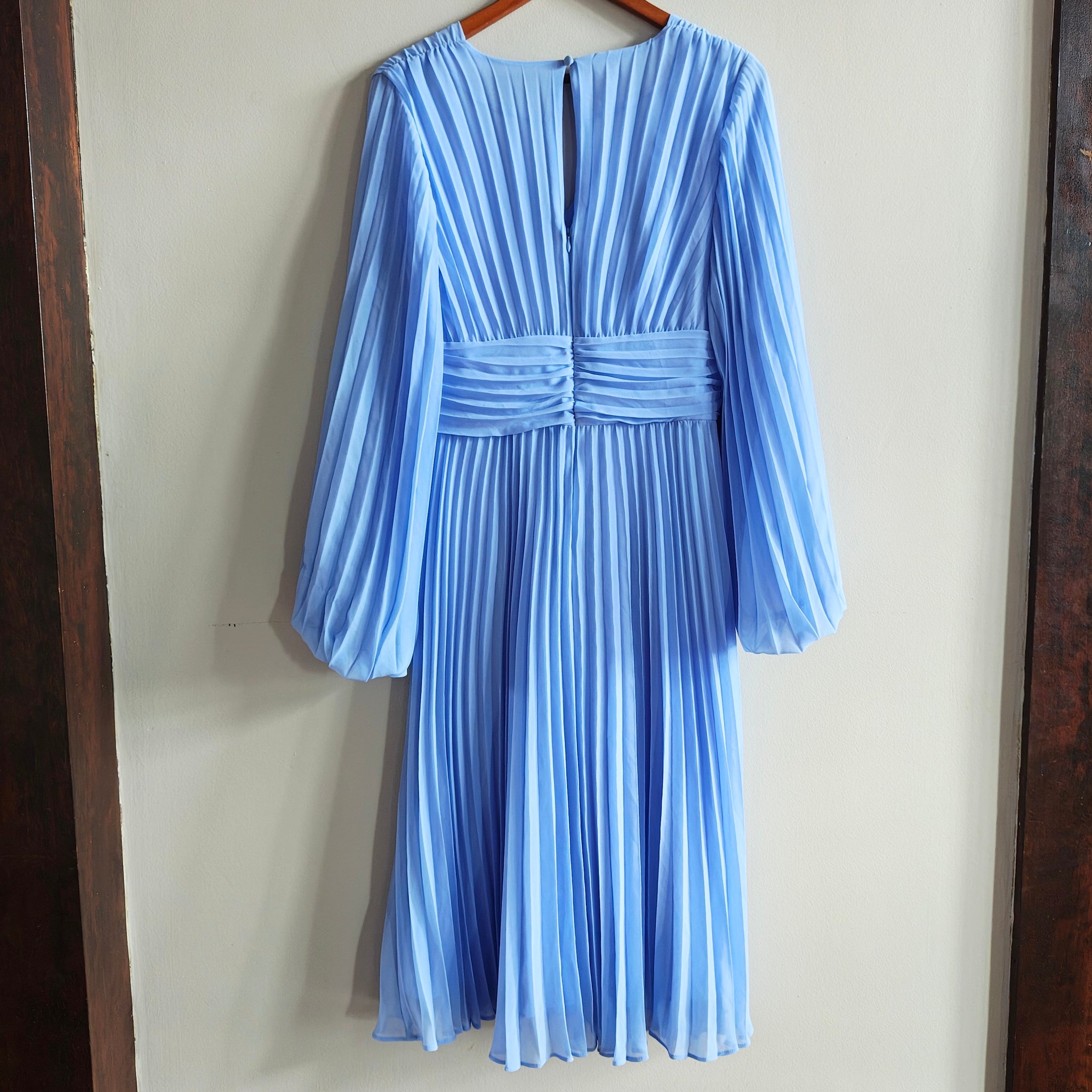 Chiffon Pleated Midi Dress in a light blue or sky blue color. It features a V-neckline, long or bracelet-length balloon sleeves with button cuffs, a ruched waistband, and a keyhole opening with a button and invisible zipper closure at the back.