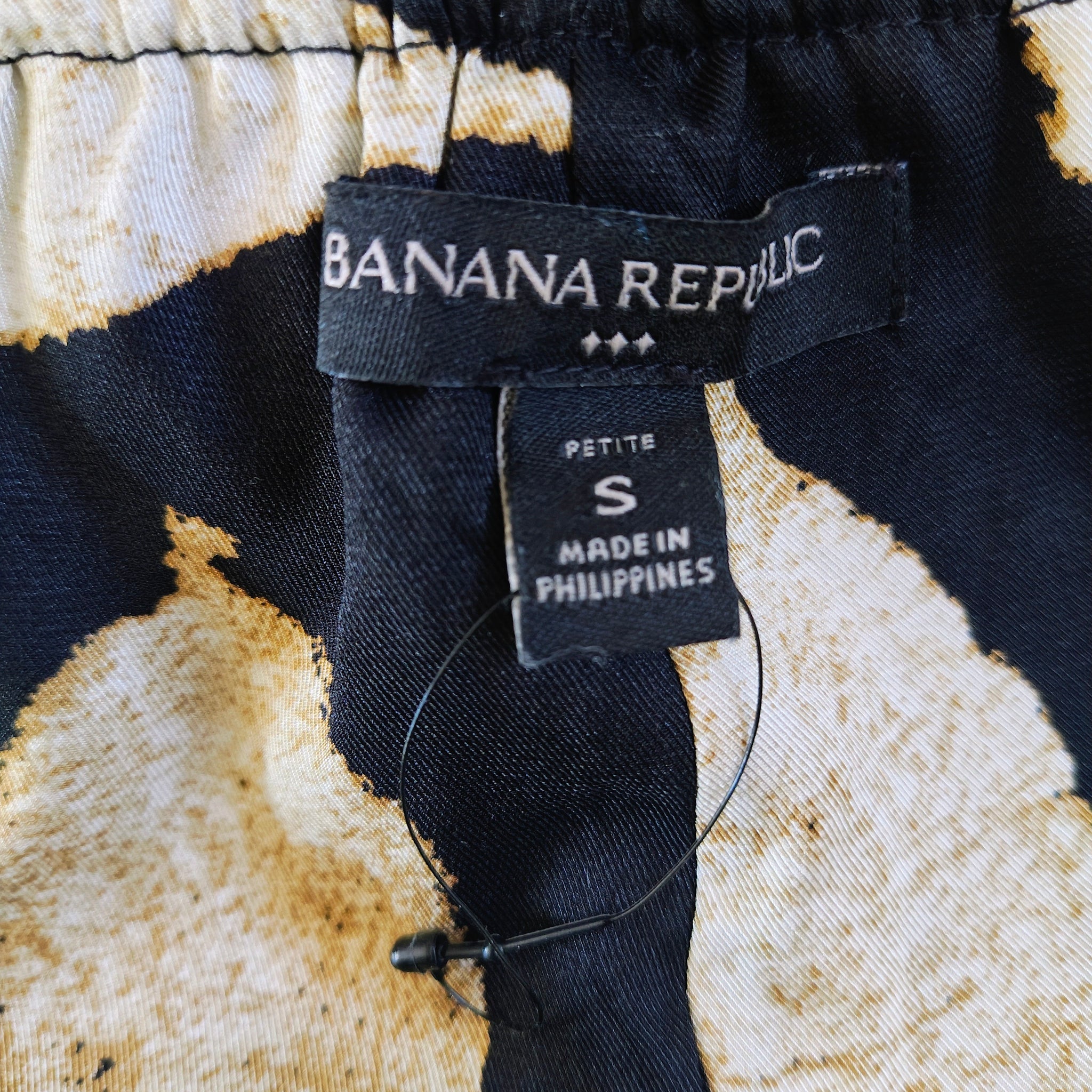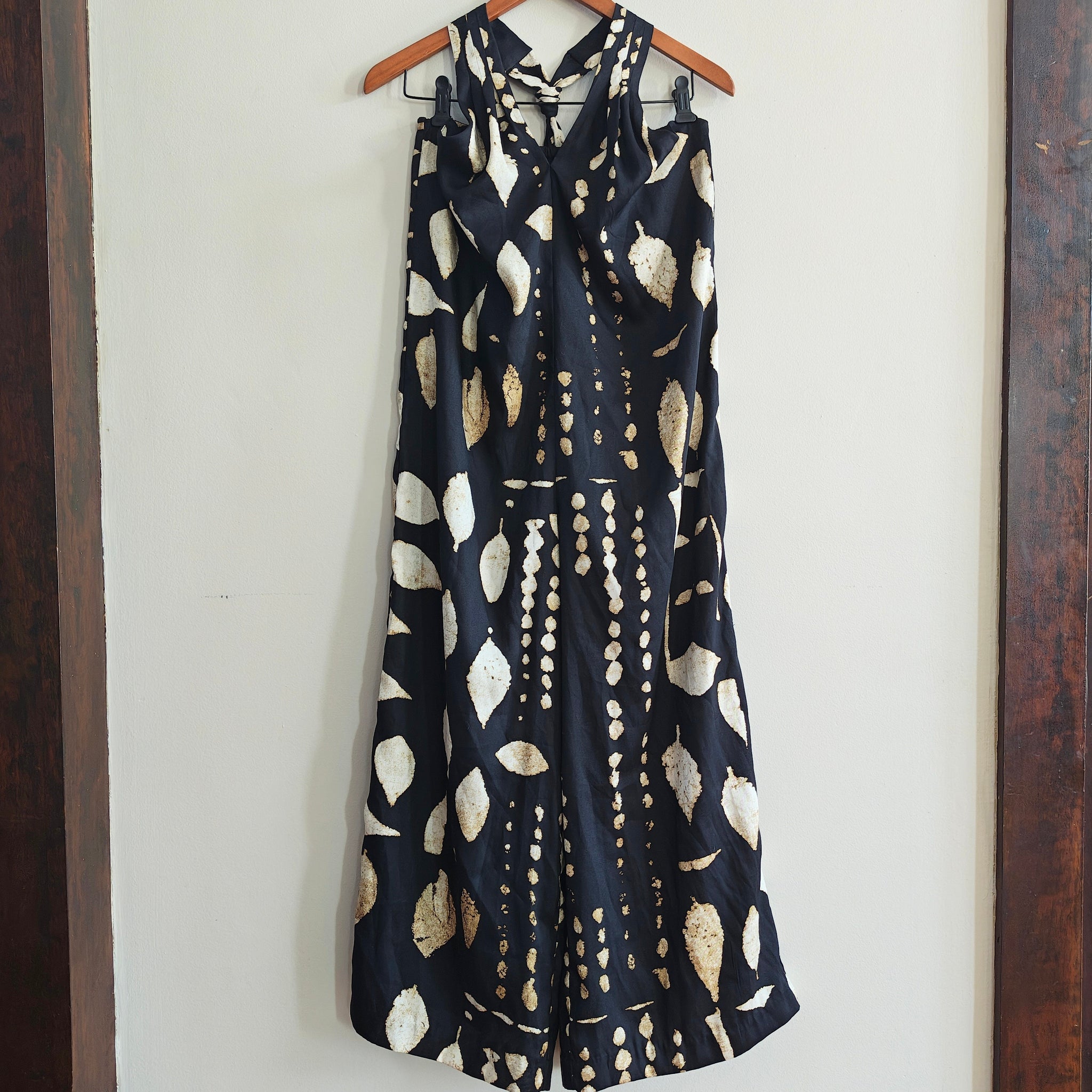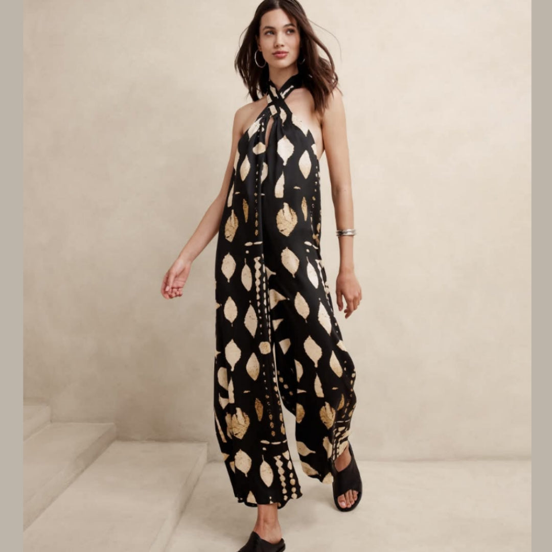 Banana Republic Factory Wrap-Halter Jumpsuit. It features a black and beige leaf-like pattern, a halter twist neckline, wide legs, and an elasticized back.