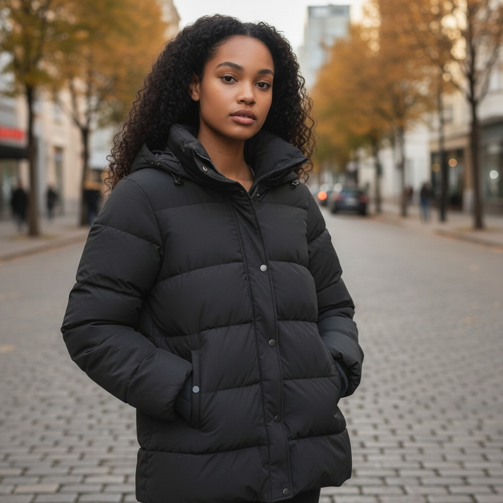 - Stand collar; hood with drawstrings; front zip closure