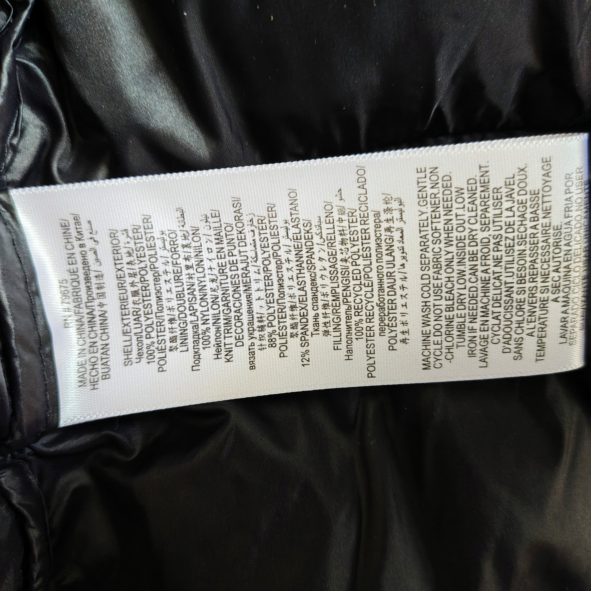 Shell & fill: polyester; lining: nylon; knit trim: polyester, spandex