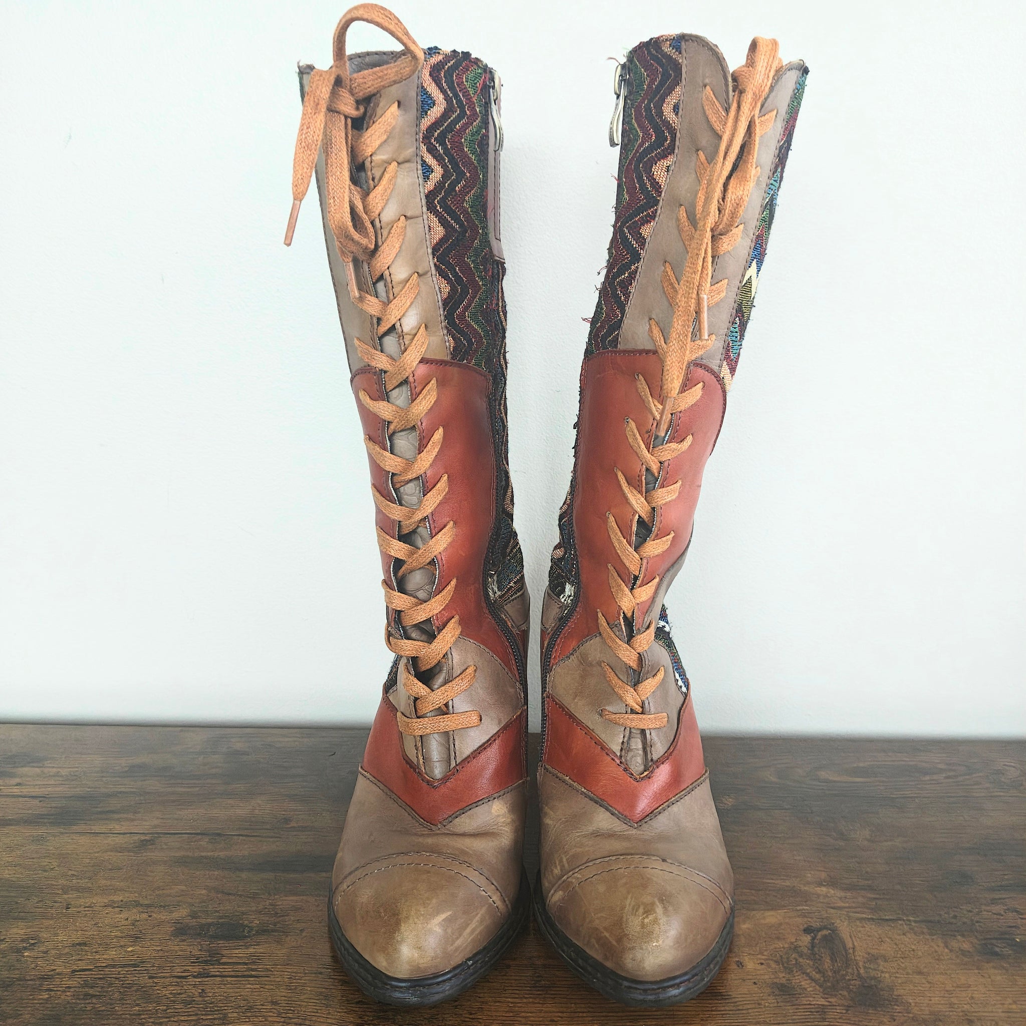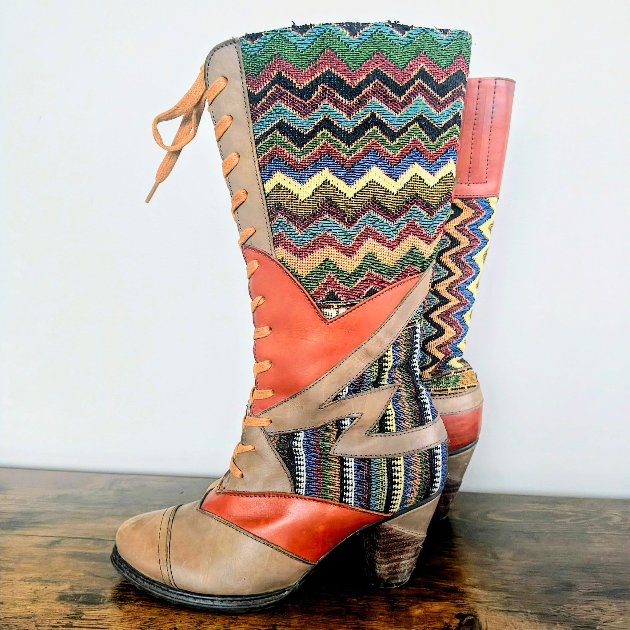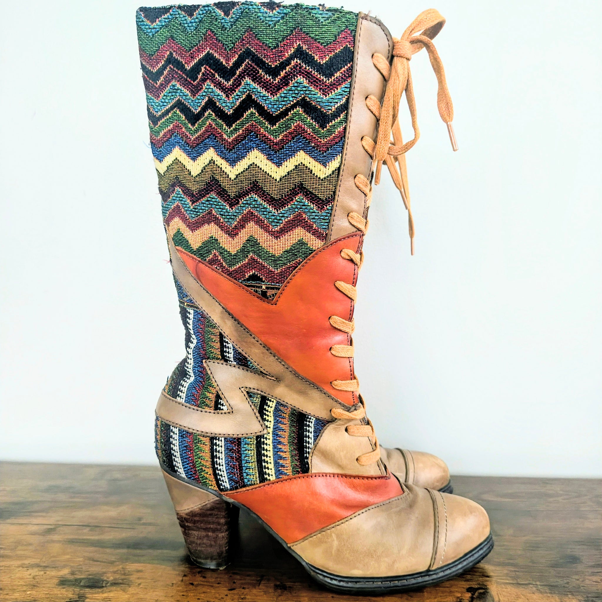 With a vintage inspired design and hand painted leather, the Malag lace-up boots from L' Artiste by Spring Step are the perfect tall boots to complement your tailored style. Classic and comfortable, these mid calf boots will add a splash of color to any look.