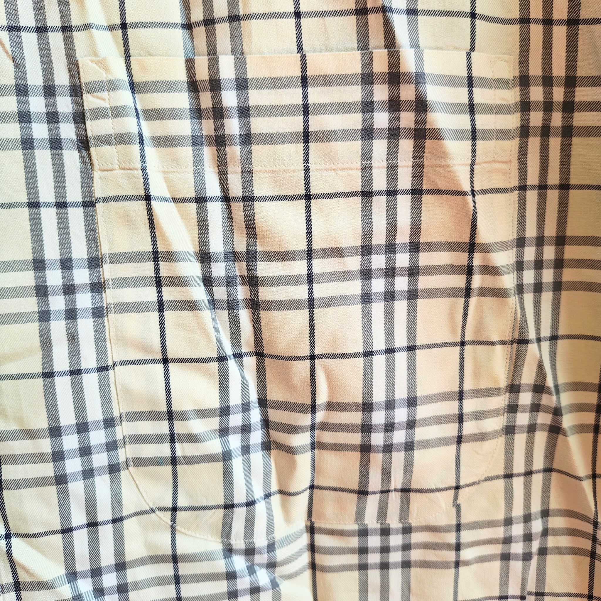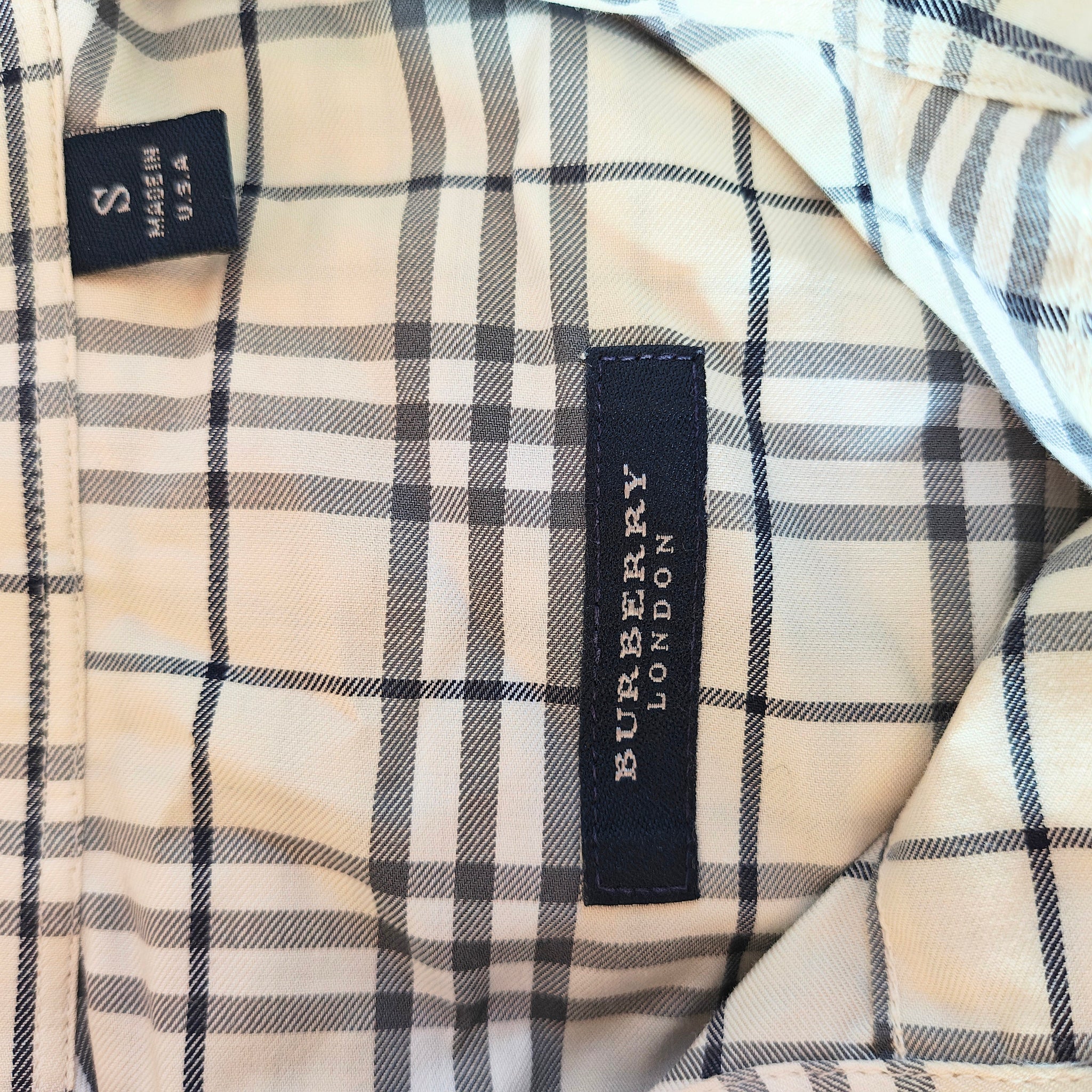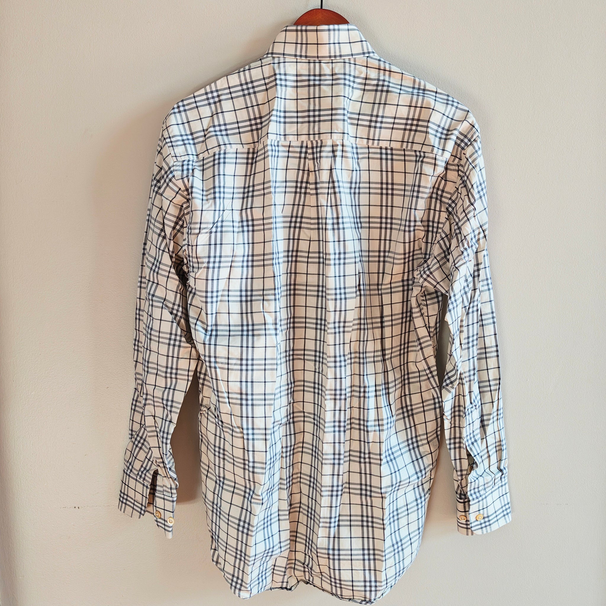 Burberry London men's shirt in a white, cream, and black check (plaid) pattern. It is a long-sleeved, button-down shirt made of cotton material.