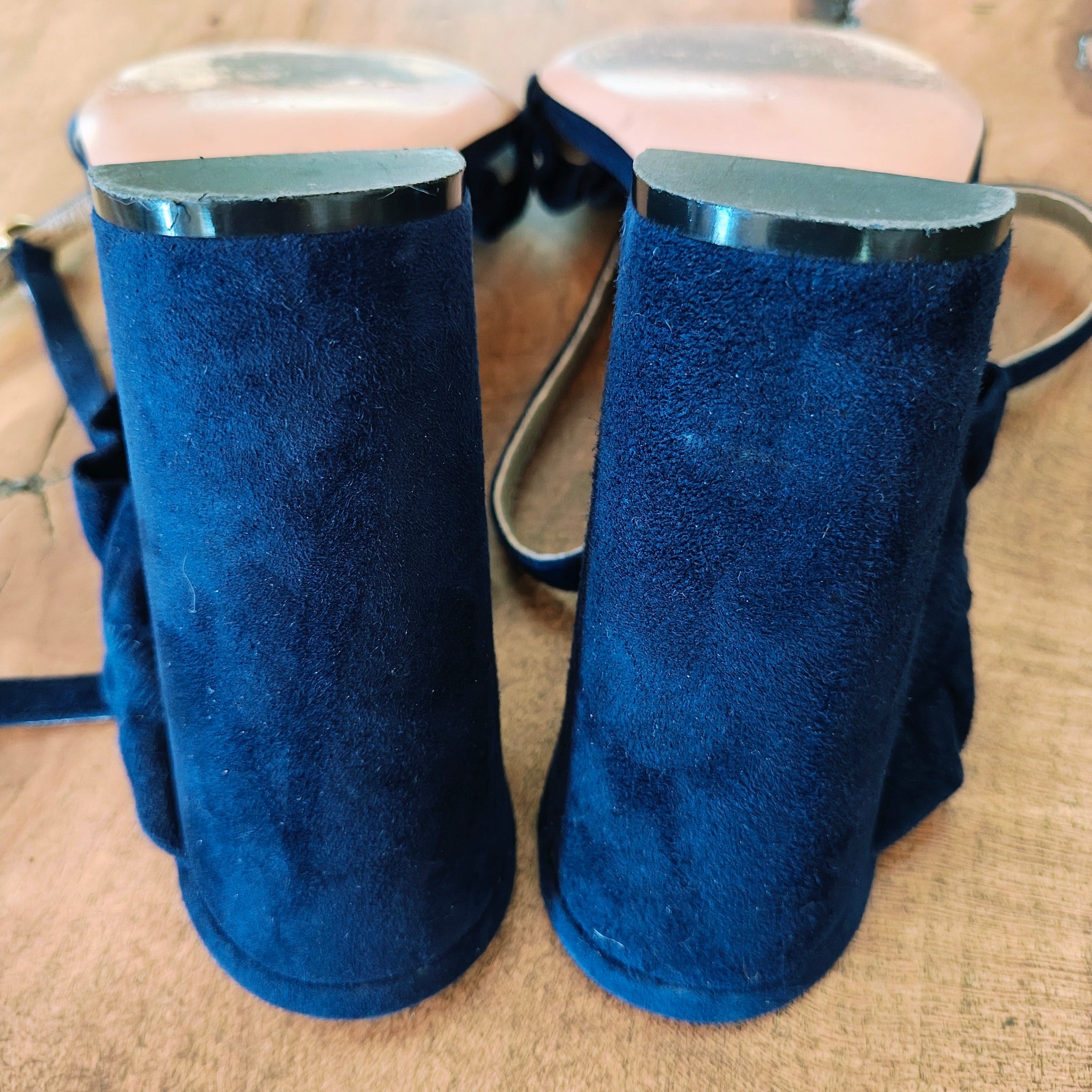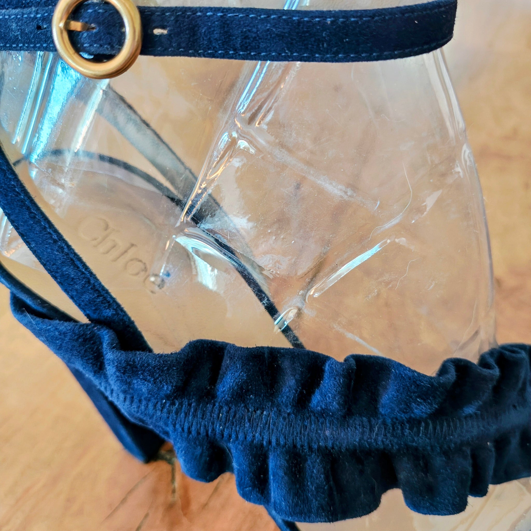 Chloe navy blue suede sandals with ruffle embellishment are an elegant heeled sandal with a block heel and an ankle strap with a gold buckle.